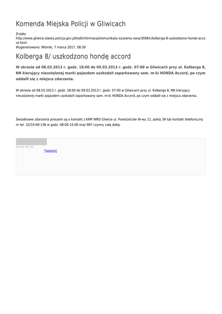 Komenda Miejska Policji w Gliwicach Źródło: http://www.gliwice.slaska.policja.gov.pl/ka9/informacje/komunikaty-szukamy-swia/30964,Kolberga-8-uszkodzono-honde-acco rd.html Wygenerowano: Wtorek, 7 marca 2017, 08:30 Kolberga 8/ uszkodzono hondę accord W okresie od 08.03.2013 r. godz. 18:00 do 09.03.2013 r. godz. 07:00 w Gliwicach przy ul. Kolberga 8, NN kierujący nieustalonej marki pojazdem uszkodził zaparkowany sam. m-ki HONDA Accord, po czym oddalił się z miejsca zdarzenia. W okresie od 08.03.2013 r. godz. 18:00 do 09.03.2013 r. godz. 07:00 w Gliwicach przy ul. Kolberga 8, NN kierujący nieustalonej marki pojazdem uszkodził zaparkowany sam. m-ki HONDA Accord, po czym oddalił się z miejsca zdarzenia. Świadkowie zdarzenia proszeni są o kontakt z KMP WRD Gliwice ul. Powstańców W-wy 12, pokój 39 lub kontakt telefoniczny nr tel. 32/33-69-136 w godz. 08:00-15:00 oraz 997 czynny całą dobę. Ocena: 0/5 (0) Tweetnij