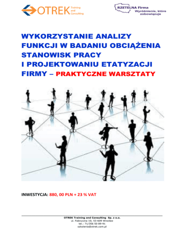 WYKORZYSTANIE ANALIZY FUNKCJI W BADANIU OBCIĄŻENIA STANOWISK PRACY I PROJEKTOWANIU ETATYZACJI FIRMY – PRAKTYCZNE WARSZTATY INWESTYCJA: 880, 00 PLN + 23 % VAT __________________________________________________________________________________ OTREK Training and Consulting Sp. z o.o. ul. Fabryczna 10; 53-609 Wrocław tel.: 71/356 50 89-91 [email protected] CEL SZKOLENIA Przekazanie wiedzy, umiejętności oraz gotowych rozwiązań systemowych i narzędzi niezbędnych do efektywnego gospodarowania potencjałem pracy a szczególnie procedury analizy i syntetyzowania wyników optymalizacji zatrudnienia w firmie. Celem projektu jest także pokazanie możliwości wykorzystania w obszarze optymalizacji zatrudnienia narzędzi informatycznych. PROGRAM (ZAKRES TEMATYCZNY) WYKORZYSTANIE ANALIZY FUNKCJI W BADANIU OBCIĄŻENIA STANOWISK PRACY I PROJEKTOWANIU ETATYZACJI FIRMY I dzień – 7 godz. 1. Analiza struktury organizacyjnej przedsiębiorstwa na potrzeby optymalizacji zatrudnienia i etatyzacji. Analiza struktury organizacyjnej w układzie funkcjonalnym. Analiza struktury organizacyjnej w układzie procesowym. 2. Analiza aktualnego stanu zatrudnienia w powiązaniu ze strukturą organizacyjną przedsiębiorstwa. 3. Analiza i ocena opisów stanowisk pracy w odniesieniu do planowanej optymalizacji zatrudnienia i etatyzacji. 4. Analiza i ustalenie rocznego nominalnego czasu pracy na stanowiskach w różnych komórkach organizacyjnych przedsiębiorstwa. 5. Karta projektowanych i realizowanych funkcji, jako podstawowe narzędzie pomiaru obciążenia pracą na stanowiskach robotniczych, nierobotniczych i pomocniczych. Budowa karty projektowanych i realizowanych funkcji. Zasady wypełniania i kontroli karty. Inwentaryzacja zrealizowanych zadań w ciągu badanego okresu. 6. Charakterystyka i przebieg badania bezpośredniego na każdym stanowisku pracy oraz weryfikacja kart projektowanych i realizowanych funkcji. 7. Metody pośrednie badania niektórych stanowisk pracy: Projektowanie obciążenia stanowiska pracy. Ekstrapolacja. Benchmarking. 8. Oszacowanie niezbędnego potencjału pracy do realizacji zadań na danym stanowisku w układzie funkcjonalnym i w układzie procesowym (dla procesów, podprocesów i mega procesów). 9. Syntetyczne zestawienia potrzeb zatrudnieniowych w przedsiębiorstwie i ich etatyzacja w układzie funkcjonalnym i układzie procesowym. OTREK Training and Consulting Sp. z o.o. ul. Fabryczna 10; 53-609 Wrocław tel.: 71/356 50 89-91 [email protected] 10. Narzędzia informatyczne w procesie optymalizacji zatrudnienia i etatyzacji. 11. Wrażliwość społeczna projektu optymalizacji zatrudnienia i etatyzacji i aspekty psychologiczne procesu. DOŚWIADCZENIE PROWADZĄCEGO TRENERA dr Henryk Szymański, wieloletni kierownik i uczestnik zespołów konsultantów realizujących projekty organizacyjne i optymalizacyjne dla przedsiębiorstw. Kierował projektami z obszaru optymalizacji zatrudnienia i etatyzacji realizowanymi dla największych polskich przedsiębiorstw takich jak: ArcelorMittal Poland S.A.(Huta Katowice), ENERGA Oświetlenie Sp. z o.o., KGHM Polska Miedź S.A, Koksownia Zdzieszowice Sp. z o.o., Kopalnia Węgla Brunatnego TURÓW S.A., Track Tec KolTram Sp. z o.o., Warszawskie Wodociągi MPWiK S.A. i wiele innych. Wieloletnie doświadczenie w zakresie optymalizacji zatrudnienia i etatyzacji legło u podstaw przygotowania przez trenera autorskiego projektu szkoleniowo-konsultingowego. WARUNKI ORGANIZACYJNE zajęcia realizowane są w wymiarze 7 h dydaktycznych , termin - 18.07.2016r. zajęcia odbędą się w Centrum Konferencyjnym WPP, ul. Fabryczna 10 we Wrocławiu, w nowoczesnej sali , wyposażonej w sprzęt multimedialny w godz. 9.00-15.00 INWESTYCJA Koszt szkolenia wynosi 880, 00 PLN + 23 %. Obejmuje: uczestnictwo w zajęciach (7 h dydaktycznych), materiały szkoleniowe i piśmiennicze, lunch, przerwy kawowe oraz certyfikat. __________________________________________________________________________________ OTREK Training and Consulting Sp. z o.o. ul. Fabryczna 10; 53-609 Wrocław tel.: 71/356 50 89-91 [email protected] OPIEKUN SZKOLENIA Iwona Orkisz Dyrektor Placówki Kształcenia Ustawicznego tel. 71/356 50 91, 601 77 14 38 e-mail: [email protected] SERDECZNIE ZAPRASZAM !!! OTREK Training and Consulting Sp. z o.o. ul. Fabryczna 10; 53-609 Wrocław tel.: 71/356 50 89-91 [email protected]