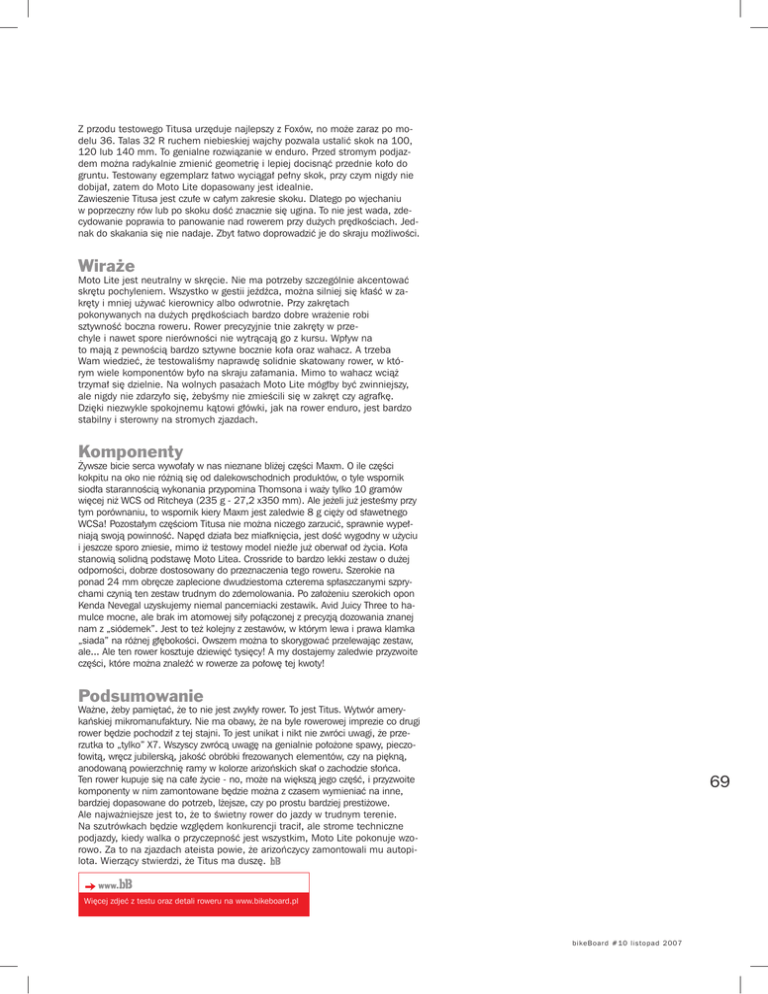 Z przodu testowego Titusa urzęduje najlepszy z Foxów, no może zaraz po modelu 36. Talas 32 R ruchem niebieskiej wajchy pozwala ustalić skok na 100, 120 lub 140 mm. To genialne rozwiązanie w enduro. Przed stromym podjazdem można radykalnie zmienić geometrię i lepiej docisnąć przednie koło do gruntu. Testowany egzemplarz łatwo wyciągał pełny skok, przy czym nigdy nie dobijał, zatem do Moto Lite dopasowany jest idealnie. Zawieszenie Titusa jest czułe w całym zakresie skoku. Dlatego po wjechaniu w poprzeczny rów lub po skoku dość znacznie się ugina. To nie jest wada, zdecydowanie poprawia to panowanie nad rowerem przy dużych prędkościach. Jednak do skakania się nie nadaje. Zbyt łatwo doprowadzić je do skraju możliwości. Wiraże Moto Lite jest neutralny w skręcie. Nie ma potrzeby szczególnie akcentować skrętu pochyleniem. Wszystko w gestii jeźdźca, można silniej się kłaść w zakręty i mniej używać kierownicy albo odwrotnie. Przy zakrętach pokonywanych na dużych prędkościach bardzo dobre wrażenie robi sztywność boczna roweru. Rower precyzyjnie tnie zakręty w przechyle i nawet spore nierówności nie wytrącają go z kursu. Wpływ na to mają z pewnością bardzo sztywne bocznie koła oraz wahacz. A trzeba Wam wiedzieć, że testowaliśmy naprawdę solidnie skatowany rower, w którym wiele komponentów było na skraju załamania. Mimo to wahacz wciąż trzymał się dzielnie. Na wolnych pasażach Moto Lite mógłby być zwinniejszy, ale nigdy nie zdarzyło się, żebyśmy nie zmieścili się w zakręt czy agrafkę. Dzięki niezwykle spokojnemu kątowi główki, jak na rower enduro, jest bardzo stabilny i sterowny na stromych zjazdach. Komponenty Żywsze bicie serca wywołały w nas nieznane bliżej części Maxm. O ile części kokpitu na oko nie różnią się od dalekowschodnich produktów, o tyle wspornik siodła starannością wykonania przypomina Thomsona i waży tylko 10 gramów więcej niż WCS od Ritcheya (235 g - 27,2 x350 mm). Ale jeżeli już jesteśmy przy tym porównaniu, to wspornik kiery Maxm jest zaledwie 8 g cięży od sławetnego WCSa! Pozostałym częściom Titusa nie można niczego zarzucić, sprawnie wypełniają swoją powinność. Napęd działa bez miałknięcia, jest dość wygodny w użyciu i jeszcze sporo zniesie, mimo iż testowy model nieźle już oberwał od życia. Koła stanowią solidną podstawę Moto Litea. Crossride to bardzo lekki zestaw o dużej odporności, dobrze dostosowany do przeznaczenia tego roweru. Szerokie na ponad 24 mm obręcze zaplecione dwudziestoma czterema spłaszczanymi szprychami czynią ten zestaw trudnym do zdemolowania. Po założeniu szerokich opon Kenda Nevegal uzyskujemy niemal pancerniacki zestawik. Avid Juicy Three to hamulce mocne, ale brak im atomowej siły połączonej z precyzją dozowania znanej nam z „siódemek”. Jest to też kolejny z zestawów, w którym lewa i prawa klamka „siada” na różnej głębokości. Owszem można to skorygować przelewając zestaw, ale... Ale ten rower kosztuje dziewięć tysięcy! A my dostajemy zaledwie przyzwoite części, które można znaleźć w rowerze za połowę tej kwoty! Porównywalne modele: Podsumowanie Ważne, żeby pamiętać, że to nie jest zwykły rower. To jest Titus. Wytwór amerykańskiej mikromanufaktury. Nie ma obawy, że na byle rowerowej imprezie co drugi rower będzie pochodził z tej stajni. To jest unikat i nikt nie zwróci uwagi, że przerzutka to „tylko” X7. Wszyscy zwrócą uwagę na genialnie położone spawy, pieczołowitą, wręcz jubilerską, jakość obróbki frezowanych elementów, czy na piękną, anodowaną powierzchnię ramy w kolorze arizońskich skał o zachodzie słońca. Ten rower kupuje się na całe życie - no, może na większą jego część, i przyzwoite komponenty w nim zamontowane będzie można z czasem wymieniać na inne, bardziej dopasowane do potrzeb, lżejsze, czy po prostu bardziej prestiżowe. Ale najważniejsze jest to, że to świetny rower do jazdy w trudnym terenie. Na szutrówkach będzie względem konkurencji tracił, ale strome techniczne podjazdy, kiedy walka o przyczepność jest wszystkim, Moto Lite pokonuje wzorowo. Za to na zjazdach ateista powie, że arizończycy zamontowali mu autopilota. Wierzący stwierdzi, że Titus ma duszę. 69 Więcej zdjeć z testu oraz detali roweru na www.bikeboard.pl bi k e Boa rd # 1 0 list o p a d 2 0 0 7