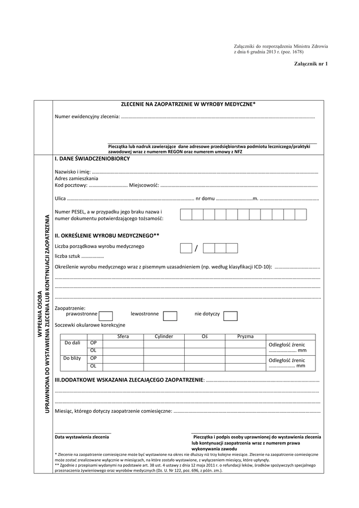 Załączniki do rozporządzenia Ministra Zdrowia z dnia 6 grudnia 2013 r. (poz. 1678) Załącznik nr 1 ra Zdrowia część A ZLECENIE NA ZAOPATRZENIE W WYROBY MEDYCZNE* Numer ewidencyjny zlecenia: ………………………………………………………………………………………………………………………………………. _____________________________________________________________________________________ Pieczątka lub nadruk zawierające dane adresowe przedsiębiorstwa podmiotu leczniczego/praktyki zawodowej wraz z numerem REGON oraz numerem umowy z NFZ I. DANE ŚWIADCZENIOBIORCY WYPEŁNIA OSOBA UPRAWNIONA DO WYSTAWIENIA ZLECENIA LUB KONTYNUACJI ZAOPATRZENIA Nazwisko i imię: ……………………………………………………………………………………………………………………………………………………………… Adres zamieszkania Kod pocztowy: …………………………. Miejscowość: …………………………………………………………………………………………………………….. Ulica ……………………………………………………………………………………….. nr domu ………………………..m. ……………………………………….. Numer PESEL, a w przypadku jego braku nazwa i numer dokumentu potwierdzającego tożsamość: II. OKREŚLENIE WYROBU MEDYCZNEGO** Liczba porządkowa wyrobu medycznego / liczba sztuk ……………… Określenie wyrobu medycznego wraz z pisemnym uzasadnieniem (np. według klasyfikacji ICD‐10): ……………………………... …………………………………………………………………………………………………………………………………………………………………………………………. …………………………………………………………………………………………………………………………………………………………………………………………. ……………………………………………………………………………………………………………………………………………………………………………………....... Zaopatrzenie: prawostronne lewostronne nie dotyczy Soczewki okularowe korekcyjne Do dali Do bliży OP OL OP OL Sfera Cylinder Oś Pryzma Odległość źrenic …………………. mm Odległość źrenic ………………… mm III.DODATKOWE WSKAZANIA ZLECAJĄCEGO ZAOPATRZENIE: ………………………………………………................................. ………………………………………………………………………………………………………………………………………………………………………………………… …………………………………………………………………………………………………………………………………………………………………………………………. Miesiąc, którego dotyczy zaopatrzenie comiesięczne: ……………………………………………………………………………………………………… _______________________ ____________________________________________________ Data wystawienia zlecenia Pieczątka i podpis osoby uprawnionej do wystawienia zlecenia lub kontynuacji zaopatrzenia wraz z numerem prawa wykonywania zawodu * Zlecenie na zaopatrzenie comiesięczne może być wystawione na okres nie dłuższy niż trzy kolejne miesiące. Zlecenie na zaopatrzenie comiesięczne może zostać zrealizowane wyłącznie w miesiącach, na które zostało wystawione, z wyłączeniem miesięcy, które upłynęły. ** Zgodnie z przepisami wydanymi na podstawie art. 38 ust. 4 ustawy z dnia 12 maja 2011 r. o refundacji leków, środków spożywczych specjalnego przeznaczenia żywieniowego oraz wyrobów medycznych (Dz. U. Nr 122, poz. 696, z późn. zm.). WYPEŁNIA PRACOWNIK ODDZIAŁU WOJEWÓDZKIEGO NARODOWEGO FUNDUSZU ZDROWIA IV. POTWIERDZENIE UPRAWNIENIA DO ZAOPATRZENIA WNIOSKOWANYM WYROBEM MEDYCZNYM Kod tytułu uprawnienia ………………………….…………………………………………………………………………………………………………………….. Kod tytułu uprawnienia dodatkowego .…………………………………………………………. nr dokumentu …………………………………….. Nazwa i numer oddziału wojewódzkiego Narodowego Funduszu Zdrowia: …………………………………………………………………… Limit finansowania ze środków publicznych ………..……….. Refundacja Narodowego Funduszu Zdrowia …………………….% Przyczyna odmowy potwierdzenia prawa do refundacji ………………………………………………………………………………………………… ………………………………………………………………………………………………………………………………………………………………………………………. Data potwierdzenia zlecenia ………………………………………………………………………………………………………………………………………….. _________________________________________________ Pieczątka i podpis pracownika oddziału wojewódzkiego Narodowego Funduszu Zdrowia WYPEŁNIA PODMIOT REALIZUJĄCY CZYNNOŚCI Z ZAKRESU ZAOPATRZENIA W WYROBY MEDYCZNE V. POTWIERDZENIE ODBIORU WYROBU MEDYCZNEGO U ŚWIADCZENIODAWCY ________________________ _______________________________________________ Data przyjęcia do realizacji Pieczątka podmiotu realizującego czynności z zakresu zaopatrzenia w wyroby medyczne, w tym adres miejsca udzielania świadczeń wraz z numerem umowy z NFZ Liczba sztuk ………………………… Dane dotyczące wyrobu medycznego (wytwórca, model, nazwa handlowa) ……