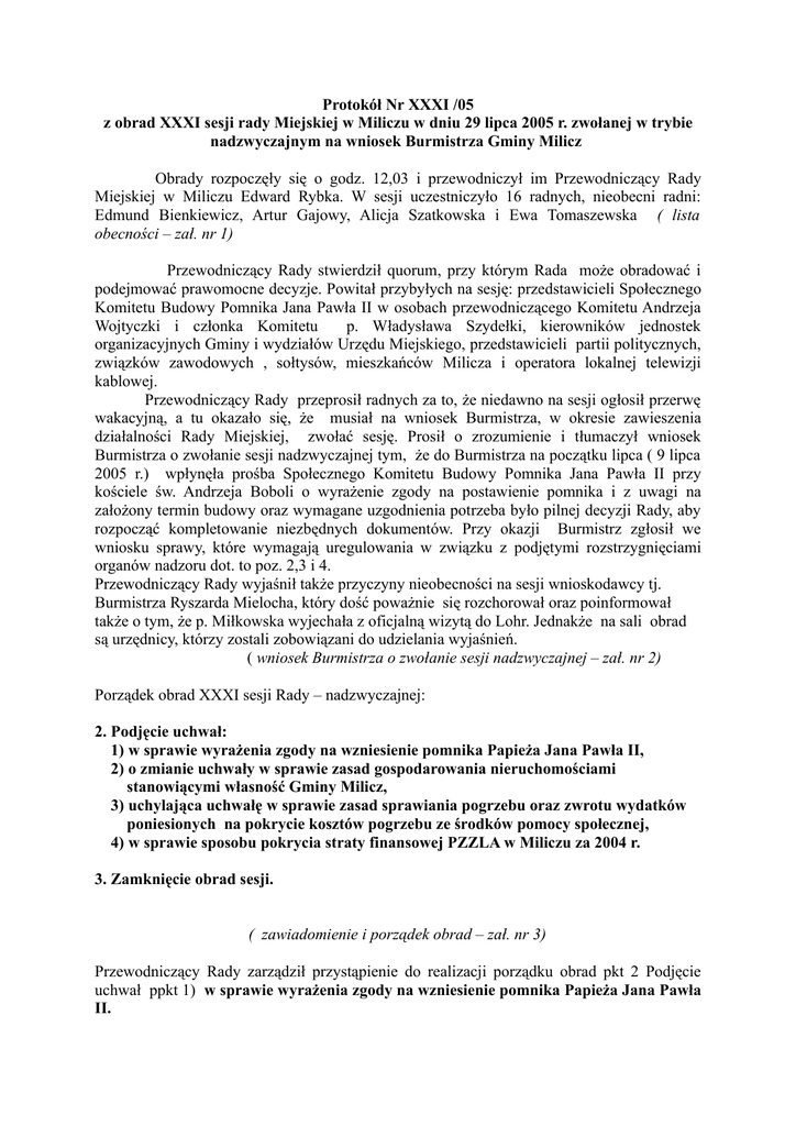 Protokół Nr XXXI /05 z obrad XXXI sesji rady Miejskiej w Miliczu w dniu 29 lipca 2005 r. zwołanej w trybie nadzwyczajnym na wniosek Burmistrza Gminy Milicz Obrady rozpoczęły się o godz. 12,03 i przewodniczył im Przewodniczący Rady Miejskiej w Miliczu Edward Rybka. W sesji uczestniczyło 16 radnych, nieobecni radni: Edmund Bienkiewicz, Artur Gajowy, Alicja Szatkowska i Ewa Tomaszewska ( lista obecności – zał. nr 1) Przewodniczący Rady stwierdził quorum, przy którym Rada może obradować i podejmować prawomocne decyzje. Powitał przybyłych na sesję: przedstawicieli Społecznego Komitetu Budowy Pomnika Jana Pawła II w osobach przewodniczącego Komitetu Andrzeja Wojtyczki i członka Komitetu p. Władysława Szydełki, kierowników jednostek organizacyjnych Gminy i wydziałów Urzędu Miejskiego, przedstawicieli partii politycznych, związków zawodowych , sołtysów, mieszkańców Milicza i operatora lokalnej telewizji kablowej. Przewodniczący Rady przeprosił radnych za to, że niedawno na sesji ogłosił przerwę wakacyjną, a tu okazało się, że musiał na wniosek Burmistrza, w okresie zawieszenia działalności Rady Miejskiej, zwołać sesję. Prosił o zrozumienie i tłumaczył wniosek Burmistrza o zwołanie sesji nadzwyczajnej tym, że do Burmistrza na początku lipca ( 9 lipca 2005 r.) wpłynęła prośba Społecznego Komitetu Budowy Pomnika Jana Pawła II przy kościele św. Andrzeja Boboli o wyrażenie zgody na postawienie pomnika i z uwagi na założony termin budowy oraz wymagane uzgodnienia potrzeba było pilnej decyzji Rady, aby rozpocząć kompletowanie niezbędnych dokumentów. Przy okazji Burmistrz zgłosił we wniosku sprawy, które wymagają uregulowania w związku z podjętymi rozstrzygnięciami organów nadzoru dot. to poz. 2,3 i 4. Przewodniczący Rady wyjaśnił także przyczyny nieobecności na sesji wnioskodawcy tj. Burmistrza Ryszarda Mielocha, który dość poważnie się rozchorował oraz poinformował także o tym, że p. Miłkowska wyjechała z oficjalną wizytą do Lohr. Jednakże na sali obrad są urzędnicy, którzy zostali zobowiązani do udzielania wyjaśnień. ( wniosek Burmistrza o zwołanie sesji nadzwyczajnej – zał. nr 2) Porządek obrad XXXI sesji Rady – nadzwyczajnej: 2. Podjęcie uchwał: 1) w sprawie wyrażenia zgody na wzniesienie pomnika Papieża Jana Pawła II, 2) o zmianie uchwały w sprawie zasad gospodarowania nieruchomościami stanowiącymi własność Gminy Milicz, 3) uchylająca uchwałę w sprawie zasad sprawiania pogrzebu oraz zwrotu wydatków poniesionych na pokrycie kosztów pogrzebu ze środków pomocy społecznej, 4) w sprawie sposobu pokrycia straty finansowej PZZLA w Miliczu za 2004 r. 3. Zamknięcie obrad sesji. ( zawiadomienie i porządek obrad – zał. nr 3) Przewodniczący Rady zarządził przystąpienie do realizacji porządku obrad pkt 2 Podjęcie uchwał ppkt 1) w sprawie wyrażenia zgody na wzniesienie pomnika Papieża Jana Pawła II. 2 O głos w sprawie formalnej poprosił radny Stanisław Kuśnierz, który zwracając się do Przewodniczącego Rady powiedział, że chciałby aby pan Rybka poinformował radnych o zaproszeniu skierowanym do Rady jakie zostało złożone na Jego ręce. Przystąpiono do realizacji punktu 2 ppkt 1- w sprawie wyrażenia zgody na wzniesienie pomnika Papieża Jana Pawła II Radny Ryszard Ochowicz wnioskował o dokonanie przybliżenia koncepcji budowy pomnika, co jak zauważył, ułatwi decyzję radnych w tej sprawie. Przewodniczący Rady przypomniał, że sprawa pomnika była przedmiotem opiniowania Komisji Porządku i Ochrony Środowiska, w której uczestniczył przedstawiciel Społecznego Komitetu Budowy i inicjatywa zyskała pozytywną opinię Komisji. Skoro jednak jest potrzeba takiej prezentacji to poprosił o przybliżenie zagadnienia przez przedstawiciela Społecznego Komitetu Budowy. W imieniu Komitetu głos zabrał p. Władysław Szydełko, który przybliżył radnym następujące zagadnienia: 1) lokalizacji pomnika – działka nr 148/2 AM 6 w Miliczu przy ul. 1 Maja , 2) opis pomnika – cokół kamienny o średnicy 1,5 m i wysokości 2,5 m, - na cokole ustawiona postać Papieża o wysokości ok. 3 m, 3) zagospodarowanie terenu koło pomnika: - powierzchnia przylegająca do pomnika zostanie wyłożona kostką granitową, - urządzenie zieleni, - przebudowa istniejącego parkingu przy kościele z wymianą nawierzchni, - przebudowa linii napowietrznej – energetycznej. Pytań do przedstawiciela Komitetu nie zgłoszono. Przewodniczący Rady zarządził glosowanie nad przyjęciem uchwały. Wynik głosowania; głosowało 16 radnych, za przyjęciem uchwały oddano 16 głosów. Uchwała Nr XXXI / 247/05 Rady Miejskiej w Miliczu z dnia 29 lipca 2005 r. w sprawie wyrażenia zgody na wzniesienie pomnika Papieża Jana Pawła II ( zał. nr 4) W załączeniu wniosek Społecznego Komitetu Budowy Pomnika Jana Pawła II przy kościele św. Andrzeja Boboli w Miliczu wraz z mapką sytuacyjną. Decyzję Rady podsumował Przewodniczący Rady, który oświadczył, że Rada wywiązała się ze swojego obowiązku – podjęto stosowną uchwałę, która otwiera drogę do dalszych działań, reszta to już zadanie Komitetu i Burmistrza Gminy. Natomiast wracając do wcześniejszego wystąpienia radnego Kuśnierza w sprawie wniosku formalnego, poinformował Radę, że w dniu sesji o godz. 13,00 nastąpi oficjalne otwarcie - biura Europe Direct z udziałem Wicewojewody Stanisława Janika, 3 Prezesa DIR Leszka Grali i Dyrektora DIR Henryka Zatorskiego. Zaproszenie na otwarcie biura jest kierowane do wszystkich radnych za pośrednictwem Przewodniczącego Rady. 2) o zmianie uchwały w sprawie zasad gospodarowania nieruchomościami stanowiącymi własność Gminy Milicz, Radny Dariusz Stasiak dociekał przyczyny tak szybkiej zmiany dopiero co podjętej na ostatniej sesji uchwały. Wyjaśnień udzielił Kierownik Wydziału Gospodarki Nieruchomościami p. Zygmunt Ciężki, który poinformowa