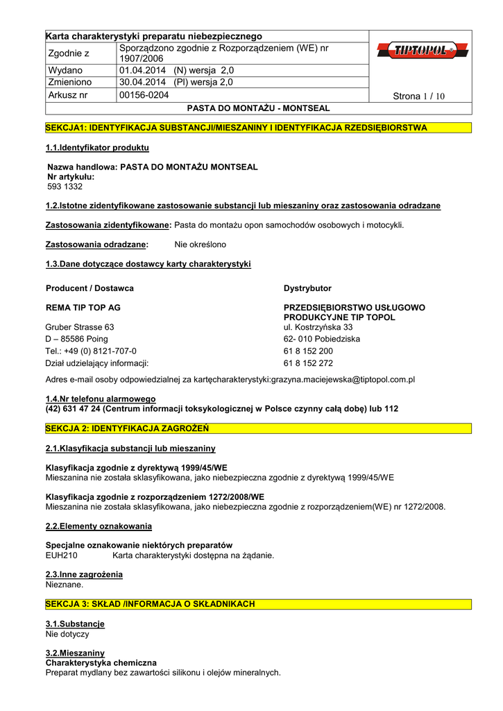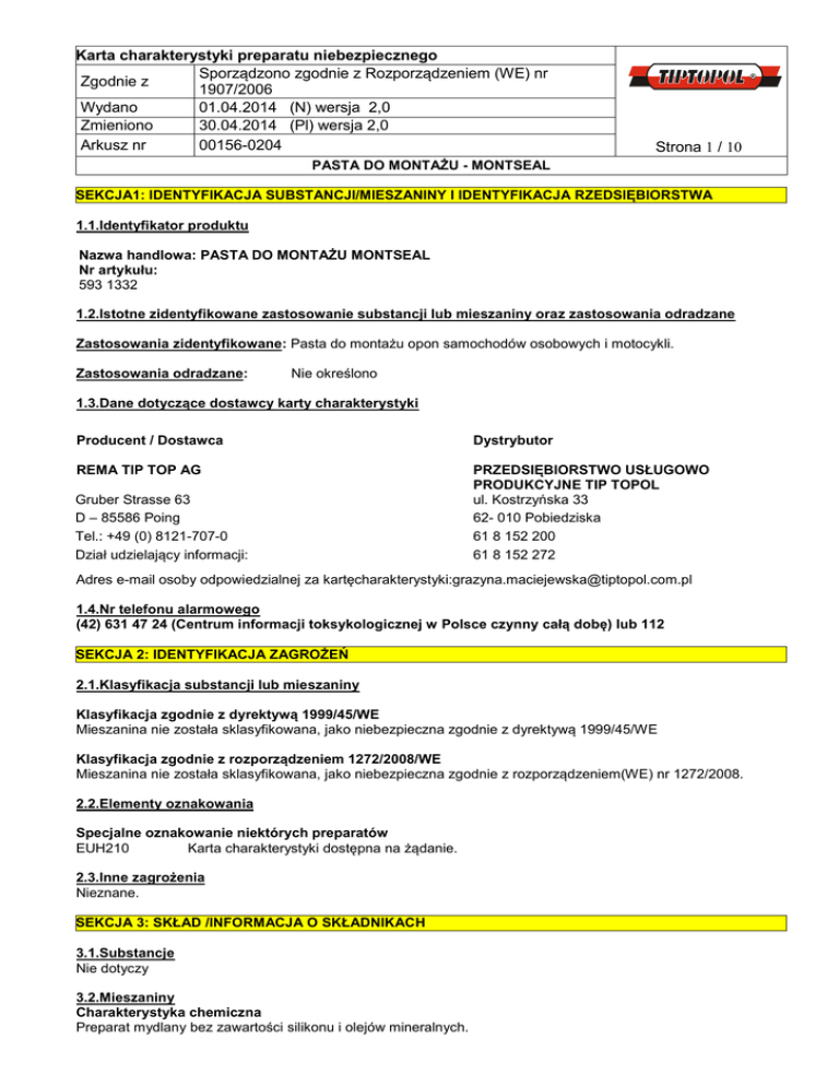 Karta charakterystyki preparatu niebezpiecznego Sporządzono zgodnie z Rozporządzeniem (WE) nr Zgodnie z 1907/2006 Wydano 01.04.2014 (N) wersja 2,0 Zmieniono 30.04.2014 (Pl) wersja 2,0 Arkusz nr 00156-0204 Strona 1 / 10 PASTA DO MONTAŻU - MONTSEAL SEKCJA1: IDENTYFIKACJA SUBSTANCJI/MIESZANINY I IDENTYFIKACJA RZEDSIĘBIORSTWA 1.1.Identyfikator produktu Nazwa handlowa: PASTA DO MONTAŻU MONTSEAL Nr artykułu: 593 1332 1.2.Istotne zidentyfikowane zastosowanie substancji lub mieszaniny oraz zastosowania odradzane Zastosowania zidentyfikowane: Pasta do montażu opon samochodów osobowych i motocykli. Zastosowania odradzane: Nie określono 1.3.Dane dotyczące dostawcy karty charakterystyki Producent / Dostawca Dystrybutor REMA TIP TOP AG PRZEDSIĘBIORSTWO USŁUGOWO PRODUKCYJNE TIP TOPOL ul. Kostrzyńska 33 62- 010 Pobiedziska 61 8 152 200 61 8 152 272 Gruber Strasse 63 D – 85586 Poing Tel.: +49 (0) 8121-707-0 Dział udzielający informacji: Adres e-mail osoby odpowiedzialnej za kartęcharakterystyki:[email protected] 1.4.Nr telefonu alarmowego (42) 631 47 24 (Centrum informacji toksykologicznej w Polsce czynny całą dobę) lub 112 SEKCJA 2: IDENTYFIKACJA ZAGROŻEŃ 2.1.Klasyfikacja substancji lub mieszaniny Klasyfikacja zgodnie z dyrektywą 1999/45/WE Mieszanina nie została sklasyfikowana, jako niebezpieczna zgodnie z dyrektywą 1999/45/WE Klasyfikacja zgodnie z rozporządzeniem 1272/2008/WE Mieszanina nie została sklasyfikowana, jako niebezpieczna zgodnie z rozporządzeniem(WE) nr 1272/2008. 2.2.Elementy oznakowania Specjalne oznakowanie niektórych preparatów EUH210 Karta charakterystyki dostępna na żądanie. 2.3.Inne zagrożenia Nieznane. SEKCJA 3: SKŁAD /INFORMACJA O SKŁADNIKACH 3.1.Substancje Nie dotyczy 3.2.Mieszaniny Charakterystyka chemiczna Preparat mydlany bez zawartości silikonu i olejów mineralnych. Karta charakterystyki preparatu niebezpiecznego Sporządzono zgodnie z Rozporządzeniem (WE) nr Zgodnie z 1907/2006 Wydano 01.04.2014 (N) wersja 2,0 Zmieniono 30.04.2014 (Pl) wersja 2,0 Arkusz nr 00156-0204 Strona 2 / 10 PASTA DO MONTAŻU - MONTSEAL Niebezpieczne składniki Tekst zwrotów R i H patrz sekcja 16 Ilość 2,2- OKSYDIETANOL Nr WE Nr CAS Nr identyfikacyjny Nr REACH 203-872-2 111-46-6 603-140-00-6 01-2119457857-21 Klasyfikacja wg 67/548”EWG Symbol ostrzegawczy Xn- Produkt szkodliwy Zwroty R R 22 Klasyfikacja wg1272//2008 Klasa zagrożenia /Kategoria zagrożenia Acute Tox.4, STOT RE2 Zwrot określający zagrożenie H302, H373 ETAN-1,2-DIOL Nr WE Nr CAS Nr identyfikacyjny Nr REACH Symbol ostrzegawczy Zwroty R 203-473-3 107-21-1 603-027-00-1 01-2119456816-28 Klasyfikacja wg 67/548”EWG Xn- Produkt szkodliwy R 22 Klasyfikacja wg1272//2008 Klasa zagrożenia /Kategoria zagrożenia Zwrot określający zagrożenie <10 % <5 % Acute Tox.4, STOT RE2 H302, H373 Tekst zwrotów R i H patrz sekcja 16 SEKCJA 4: ŚRODKI PIERWSZEJ POMOCY 4.1.Opis środków pierwszej pomocy Wskazówki ogólne Zabrudzone, przesiąknięte ubranie należy natychmiast zdjąć. Jeśli dolegliwości utrzymują się zasięgnąć porady lekarskiej. W przypadku wdychania Jeżeli na skutek nieszczęśliwego wypadku poszkodowana osoba wdychała opary lub produkty rozkładu, należy przenieść taka osobę na świeże powietrze. W przypadku kontakt ze skórą Zmyć dużą ilością wody z mydłem. W przypadku kontaktu z oczami Oczy należy natychmiast płukać dużą ilością wody, także pod powiekami. Jeżeli podrażnienie oczu nie ustępuje zasięgnąć specjalistycznej porady lekarskiej. W przypadku połknięcia Wywołać wymioty u osoby przytomnej. Wymiotująca osobę, leżącą na plecach, należy przewrócić na bok. Karta charakterystyki preparatu niebezpiecznego Sporządzono zgodnie z Rozporządzeniem (WE) nr Zgodnie z 1907/2006 Wydano 01.04.2014 (N) wersja 2,0 Zmieniono 30.04.2014 (Pl) wersja 2,0 Arkusz nr 00156-0204 Strona 3 / 10 PASTA DO MONTAŻU - MONTSEAL Skonsultować się z lekarzem. Decyzja o wywołaniu wymiotów musi być podjęta przez lekarza. 4.2.Najważniejsze ostre i opóźnione objawy skutków narażenia Wdychanie oparów może spowodować umiarkowane podrażnienie błon śluzowych. Powtarzające się lub trwające długotrwałe działanie może podrażniać oczy i skórę. 4.3.Wskazania dotyczące wszelkiej natychmiastowej pomocy lekarskiej i szczególnego postępowania z poszkodowanym Leczenie objawowe. SEKCJA 5: POSTĘPOWANIE W PRZYPADKU POŻARU 5.1.Środki gaśnicze Odpowiednie środki gaśnicze Piana gaśnicza odporna na działanie alkoholu, dwutlenek węgla (CO 2), stałe środki gaśnicze, rozproszony strumień wody. Zabronione środki gaśnicze Zwarty strumień wody. 5.2.Szczególne zagrożenia związane z substancją lub mieszaniną Podczas pożaru mogą wydzielać się: Tlenek węgla (CO), dwutlenek węgla (CO2). 5.3 Informacje da straży pożarnej Należy stosować maskę przeciwgazową izolującą. Stosować odzież ochronną. Informacje uzupełniające Zagrożony pojemni należy chłodzić zraszając wodą. Pozostałości po pożarze i zanieczyszczona wodę gaśniczą usuwać zgodnie z obowiązującymi przepisami. SEKCJA 6: POSTĘPOWANIE W PRZYPADKU NIEZAMIERZONEGO UWOLNIENIA DO ŚRODOWISKA 6.1.Indywidualne środki ostrożności, wyposażenie ochronnej i procedury w sytuacjach awaryjnych W przypadku powstania oparów stosować środki ochrony dróg oddechowych. Zapewnić odpowiednia wentylację. Stosować odzież ochronną. 6.2.Środki ostrożności w zakresie ochrony środowiska Nie dopuści do przedostania się do kanalizacji, wód powierzchniowych/wód gruntowych. 6.3.Metody i materiały zabezpieczające rozprzestrzenianiu się skażenia i służące do usuwania skażenia Czyścic detergentami, unikać stosowanie rozpuszczalników. Rozsypany/rozlany produkt związany materiałem wiążącym, zebrać łopatą do odpowiednich oznakowanych. pojemników na odpady i przekazać, jako odpad do usunięcia. 6.4.Odniesienia do innej sekcji Przestrzegać przepisów ochrony osobi