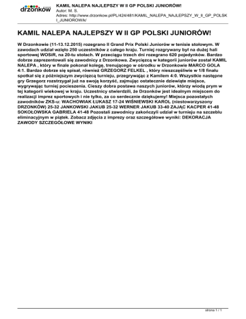 KAMIL NALEPA NAJLEPSZY W II GP POLSKI JUNIORÓW! Autor: M. S. Adres: http://www.drzonkow.pl/PL/424/481/KAMIL_NALEPA_NAJLEPSZY_W_II_GP_POLSK I_JUNIOROW/k/ KAMIL NALEPA NAJLEPSZY W II GP POLSKI JUNIORÓW! W Drzonkowie (11-13.12.2015) rozegrano II Grand Prix Polski Juniorów w tenisie stołowym. W zawodach udział wzięło 250 uczestników z całego kraju. Turniej rozgrywany był na dużej hali sportowej WOSiR, na 20-tu stołach. W przeciągu trzech dni rozegrano 620 pojedynków. Bardzo dobrze zaprezentowali się zawodnicy z Drzonkowa. Zwycięzcą w kategorii juniorów został KAMIL NALEPA , który w finale pokonał kolegę, trenującego w ośrodku w Drzonkowie MARCO GOLA 4:1. Bardzo dobrze się spisał, również GRZEGORZ FELKEL , który nieszczęśliwie w 1/8 finału spotkał się z późniejszym zwycięzcą turnieju, przegrywając z Kamilem 4:0. Wszystkie następne gry Grzegorz rozstrzygał już na swoją korzyść, zajmując ostatecznie dziewiąte miejsce, wygrywając turniej pocieszenia. Cieszy dobra postawa naszych juniorów, którzy wiodą prym w tej kategorii wiekowej w kraju. Uczestnicy stwierdzili, że Drzonków jest idealnym miejscem do realizacji imprez sportowych i nie tylko, za co serdecznie dziękujemy! Miejsca pozostałych zawodników ZKS-u: WACHOWIAK ŁUKASZ 17-24 WIŚNIEWSKI KAROL (niestowarzyszony DRZONKÓW) 25-32 JANKOWSKI JAKUB 25-32 WERNER JAKUB 33-40 ZAJĄC KACPER 41-48 SOKOŁOWSKA GABRIELA 41-48 Pozostali zawodnicy zakończyli udział w turnieju na szczeblu eliminacyjnym w piątek. Zobacz zdjęcia z imprezy oraz szczegółowe wyniki: DEKORACJA ZAWODY SZCZEGÓŁOWE WYNIKI strona 1 / 1 Powered by TCPDF (www.tcpdf.org)