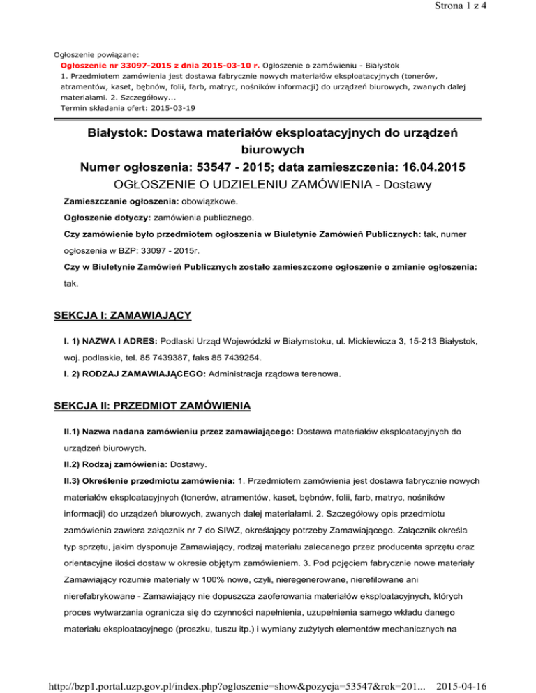 Strona 1 z 4 Ogłoszenie powiązane: Ogłoszenie nr 33097-2015 z dnia 2015-03-10 r. Ogłoszenie o zamówieniu - Białystok 1. Przedmiotem zamówienia jest dostawa fabrycznie nowych materiałów eksploatacyjnych (tonerów, atramentów, kaset, bębnów, folii, farb, matryc, nośników informacji) do urządzeń biurowych, zwanych dalej materiałami. 2. Szczegółowy... Termin składania ofert: 2015-03-19 Białystok: Dostawa materiałów eksploatacyjnych do urządzeń biurowych Numer ogłoszenia: 53547 - 2015; data zamieszczenia: 16.04.2015 OGŁOSZENIE O UDZIELENIU ZAMÓWIENIA - Dostawy Zamieszczanie ogłoszenia: obowiązkowe. Ogłoszenie dotyczy: zamówienia publicznego. Czy zamówienie było przedmiotem ogłoszenia w Biuletynie Zamówień Publicznych: tak, numer ogłoszenia w BZP: 33097 - 2015r. Czy w Biuletynie Zamówień Publicznych zostało zamieszczone ogłoszenie o zmianie ogłoszenia: tak. SEKCJA I: ZAMAWIAJĄCY I. 1) NAZWA I ADRES: Podlaski Urząd Wojewódzki w Białymstoku, ul. Mickiewicza 3, 15-213 Białystok, woj. podlaskie, tel. 85 7439387, faks 85 7439254. I. 2) RODZAJ ZAMAWIAJĄCEGO: Administracja rządowa terenowa. SEKCJA II: PRZEDMIOT ZAMÓWIENIA II.1) Nazwa nadana zamówieniu przez zamawiającego: Dostawa materiałów eksploatacyjnych do urządzeń biurowych. II.2) Rodzaj zamówienia: Dostawy. II.3) Określenie przedmiotu zamówienia: 1. Przedmiotem zamówienia jest dostawa fabrycznie nowych materiałów eksploatacyjnych (tonerów, atramentów, kaset, bębnów, folii, farb, matryc, nośników informacji) do urządzeń biurowych, zwanych dalej materiałami. 2. Szczegółowy opis przedmiotu zamówienia zawiera załącznik nr 7 do SIWZ, określający potrzeby Zamawiającego. Załącznik określa typ sprzętu, jakim dysponuje Zamawiający, rodzaj materiału zalecanego przez producenta sprzętu oraz orientacyjne ilości dostaw w okresie objętym zamówieniem. 3. Pod pojęciem fabrycznie nowe materiały Zamawiający rozumie materiały w 100% nowe, czyli, nieregenerowane, nierefilowane ani nierefabrykowane - Zamawiający nie dopuszcza zaoferowania materiałów eksploatacyjnych, których proces wytwarzania ogranicza się do czynności napełnienia, uzupełnienia samego wkładu danego materiału eksploatacyjnego (proszku, tuszu itp.) i wymiany zużytych elementów mechanicznych na http://bzp1.portal.uzp.gov.pl/index.php?ogloszenie=show&pozycja=53547&rok=201... 2015-04-16 Strona 2 z 4 nowe. Przez materiał równoważny Zamawiający rozumie materiał kompatybilny z urządzeniem, do którego jest zamówiony, o parametrach takich samych lub lepszych (pojemność tuszu/tonera, wydajność i jakość wydruku) w stosunku do materiału zalecanego przez producenta urządzenia. 4. Oferowane materiały muszą posiadać termin ważności (używalności) nie krótszy, niż 12 miesięcy od dnia dostawy. 5. Opakowania materiałów muszą zawierać logo i nazwę producenta, numer katalogowy (symbol), termin ważności lub datę produkcji z okresem używalności, opis zawartości (w tym wykaz urządzeń, do których przeznaczony jest dany materiał), muszą uniemożliwiać kontakt materiału z atmosferą w celu ochrony przed zawilgoceniem. 6. Równoważne materiały eksploatacyjne do drukarek laserowych muszą być przeznaczone do danego urządzenia i posiadać wydajność nie mniejszą niż wydajność materiałów zalecanych przez producenta. Wydajność musi być zmierzona zgodnie z normą ISO/IEC 19752 (drukarki monochromatyczne) i ISO/IEC 19798 (drukarki kolorowe). 7. Równoważne materiały eksploatacyjne do drukarek atramentowych muszą być przeznaczone do danego urządzenia i muszą posiadać wydajność nie mniejszą niż wydajność materiałów zalecanych przez producenta. Wydajność musi być zmierzona zgodnie z normą ISO/IEC 24711 i ISO/IEC 24712. 8. W przypadku, kiedy materiał zalecany przez producenta posiada wbudowany układ scalony, który monitoruje proces druku i zużycie atramentu/tonera, produkt materiał równoważny musi posiadać analogiczny element. 9. W przypadku, gdy dostarczony materiał równoważny nie będzie odpowiadał jakością wydruków i wydajnością materiałom zalecanym przez producenta (np. blady wydruk, brudzenie papieru, mniejsza liczba wydrukowanych stron w stosunku do materiału zalecanego przez producenta) Wykonawca zobowiązany będzie do wymiany tego materiału na nowy w terminie 1 dnia roboczego, od dnia zgłoszenia przez Zamawiającego. 10. W przypadku uszkodzenia urządzenia, spowodowanego używaniem materiałów równoważnych Wykonawca zobowiązany będzie do naprawy w autoryzowanym serwisie producenta urządzenia, na swój koszt, a w przypadku takiej konieczności - także do zwrotu kosztu zleconej przez Zamawiającego ekspertyzy niezależnego rzeczoznawcy. Ponadto Wykonawca zobowiązany będzie do dostarczenia na czas wykonania naprawy, w terminie 2 dni roboczych, urządzenia zastępczego, o takich samych lub lepszych parametrach. W razie stwierdzonego, przez autoryzowany serwis producenta urządzenia, trwałego uszkodzenia uniemożliwiającego eksploatację, Wykonawca pokryje wszystkie koszty zakupu i dostawy nowego urządzenia, o takich samych lub lepszych parametrach. 11. W przypadku urządzeń na gwarancji - jeśli na skutek awarii urządzenia, spowodowanej zastosowaniem materiałów równoważnych, Zamawiający utraci gwarancję producenta urządzenia, Wykonawca będzie zobowiązany do przejęcia obowiązków gwaranta na pozostały okres udzielonej gwarancji, bez zmiany jej warunków. 12. Zamawiający wymaga aby: 1) Wykonawca zagwarantował, że dostarczone materiały będą wysokiej jakości oraz zapewnią kompatybilność pracy z urządzeniami Zamawiającego, należyte bezpieczeństwo oraz będą posiadały właściwe opakowanie i oznakowanie; 2) dostawy materiałów były realizowane na koszt oraz ryzyko Wykonawcy i dostarczone do siedziby Zamawiającego we wskazane miejsce w ciągu 3 dni roboczych od daty zawiadomienia Wykonawcy tel