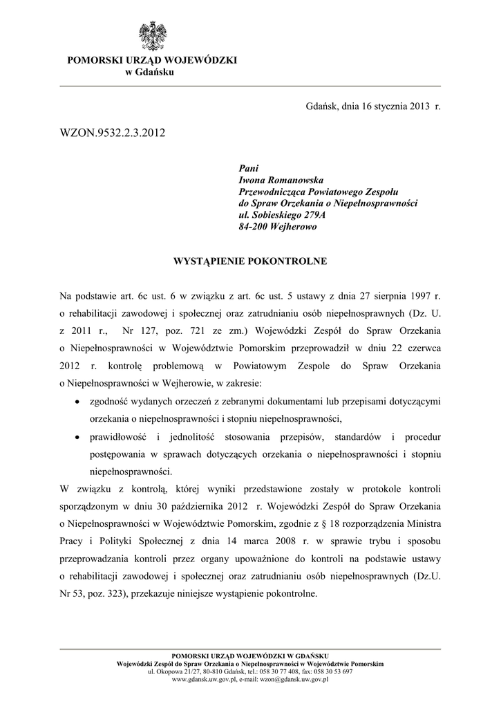 POMORSKI URZĄD WOJEWÓDZKI w Gdańsku Gdańsk, dnia 16 stycznia 2013 r. WZON.9532.2.3.2012 Pani Iwona Romanowska Przewodnicząca Powiatowego Zespołu do Spraw Orzekania o Niepełnosprawności ul. Sobieskiego 279A 84-200 Wejherowo WYSTĄPIENIE POKONTROLNE Na podstawie art. 6c ust. 6 w związku z art. 6c ust. 5 ustawy z dnia 27 sierpnia 1997 r. o rehabilitacji zawodowej i społecznej oraz zatrudnianiu osób niepełnosprawnych (Dz. U. z 2011 r., Nr 127, poz. 721 ze zm.) Wojewódzki Zespół do Spraw Orzekania o Niepełnosprawności w Województwie Pomorskim przeprowadził w dniu 22 czerwca 2012 r. kontrolę problemową w Powiatowym Zespole do Spraw Orzekania o Niepełnosprawności w Wejherowie, w zakresie: zgodność wydanych orzeczeń z zebranymi dokumentami lub przepisami dotyczącymi orzekania o niepełnosprawności i stopniu niepełnosprawności, prawidłowość i jednolitość stosowania przepisów, standardów i procedur postępowania w sprawach dotyczących orzekania o niepełnosprawności i stopniu niepełnosprawności. W związku z kontrolą, której wyniki przedstawione zostały w protokole kontroli sporządzonym w dniu 30 października 2012 r. Wojewódzki Zespół do Spraw Orzekania o Niepełnosprawności w Województwie Pomorskim, zgodnie z § 18 rozporządzenia Ministra Pracy i Polityki Społecznej z dnia 14 marca 2008 r. w sprawie trybu i sposobu przeprowadzania kontroli przez organy upoważnione do kontroli na podstawie ustawy o rehabilitacji zawodowej i społecznej oraz zatrudnianiu osób niepełnosprawnych (Dz.U. Nr 53, poz. 323), przekazuje niniejsze wystąpienie pokontrolne. POMORSKI URZĄD WOJEWÓDZKI W GDAŃSKU Wojewódzki Zespół do Spraw Orzekania o Niepełnosprawności w Województwie Pomorskim ul. Okopowa 21/27, 80-810 Gdańsk, tel.: 058 30 77 408, fax: 058 30 53 697 www.gdansk.uw.gov.pl, e-mail: [email protected] Wojewódzki Zespół do Spraw Orzekania o Niepełnosprawności w Województwie Pomorskim stwierdza następujące nieprawidłowości w zakresie działalności Powiatowego Zespołu do Spraw Orzekania o Niepełnosprawności w Wejherowie: 1. W sześciu sprawach do wniosku o wydanie orzeczenia i zaświadczenia lekarskiego określonego w § 6 ust.2 rozporządzenia Ministra Gospodarki, Pracy i Polityki Społecznej z 15 lipca 2003 r. w sprawie orzekania o niepełnosprawności i stopniu niepełnosprawności (Dz. U. Nr 139, poz.1328 ze zm.) nie załączono żadnej dodatkowej dokumentacji wskazanej w przywołanym przepisie. 2. W większości skontrolowanych spraw na przewodniczącego składu orzekającego nie wyznaczono lekarza ze specjalnością odpowiednią do rozpoznanego schorzenia zasadniczego. 3. W siedmiu sprawach dot. osób będących w wieku produkcyjnym nieprawidłowo określono wskazanie do odpowiedniego zatrudnienia. 4. W ocenach stanu zdrowia osób zainteresowanych, sporządzonych przez lekarzy – przewodniczących składów orzekających stwierdzono następujące nieprawidłowości: - w większości skontrolowanych spraw oceny stanu zdrowia nie były wypełnione w całości (w szesnastu sprawach – niepełny wywiad i badanie lekarskie, w ośmiu sprawach nie wypełniono pozostałych punktów oceny tj. okresu od kiedy datuje się ustalony stopień niepełnosprawności lub określenia wskazań), - w trzech sprawach wątpliwości budzi zaliczenie do orzeczonego stopnia niepełnosprawności, - w części spraw do akt nie dołączono wystarczającej dokumentacji uzasadniającej przyznanie stopnia niepełnosprawności z określonych przyczyn, - w trzech sprawach, mimo braku istotnej dysfunkcji ruchowej, określono wskazanie do spełnienia przesłanek określonych w Prawie o ruchu drogowym, - w jednej sprawie mimo zaznaczenia w ocenie, iż strona nie rokuje poprawy, wydano orzeczenie o charakterze okresowym. 7. W ocenach funkcjonowania społecznego oraz zakresu niezbędnej opieki i pomocy dla potrzeb orzekania o stopniu niepełnosprawności stwierdzono następujące nieprawidłowości: - w siedemnastu ocenach nie uzupełniono wszystkich punktów, - w czternastu sprawach uzasadnienia proponowanego rozstrzygnięcia były zbyt ogólne, - w większości oceny zostały wypełnione w sposób nieprawidłowy, nieadekwatnie do orzeczonego stopnia niepełnosprawności lub zbyt lakonicznie. POMORSKI URZĄD WOJEWÓDZKI W GDAŃSKU Wojewódzki Zespół do Spraw Orzekania o Niepełnosprawności w Województwie Pomorskim ul. Okopowa 21/27, 80-810 Gdańsk, tel.: 058 30 77 408, fax: 058 30 53 697 www.gdansk.uw.gov.pl, e-mail: [email protected] Strona 2 z 4 Przedstawiając powyższe uwagi i oceny, Wojewódzki Zespół do Spraw Orzekania o Niepełnosprawności w Województwie Pomorskim wnosi o: 1) prawidłowe oznaczanie wskazań do odpowiedniego zatrudnienia dla osób będących w wieku produkcyjnym, 2) uzupełnianie w całości ocen stanu zdrowia osób zainteresowanych wypełnianych przez lekarzy – przewodniczących składów orzekających, 3) załączanie do akt sprawy aktualnej dokumentacji potwierdzającej zaliczenie do przyznanych stopni niepełnosprawności z określonych przyczyn, 4) prawidłowe określanie wskazań do spełniania przesłanek określonych w Prawie o ruchu drogowym, 5) spójność pomiędzy wpisem dot. rokowania poprawy, a charakterem orzeczenia, 6) wypełnianie w całości ocen funkcjonowania społecznego, 7) prawidłowe i wyczerpujące wypełnianie ocen przez pracownika socjalnego. Ponadto zobowiązuje się Przewodniczącą Powiatowego Zespołu do Spraw Orzekania o Niepełnosprawności w Wejherowie do: 1) wyznaczanie na przewodniczących składów orzekających lekarzy odpowiednich do chorób zasadniczych stron oraz prawidłowy dobór pozostałych członków składu orzekającego, 2) przeprowadzenia instruktażu dla członków składów orzekających Zespołu dot. przestrzegania stosowania procedur i standardów postępowania w sprawach z zakresu orzekania. Wojewódzki Zespół do Spraw Orzekania o Niepełnosprawności, na podstawie § 18 ust. 6 rozp