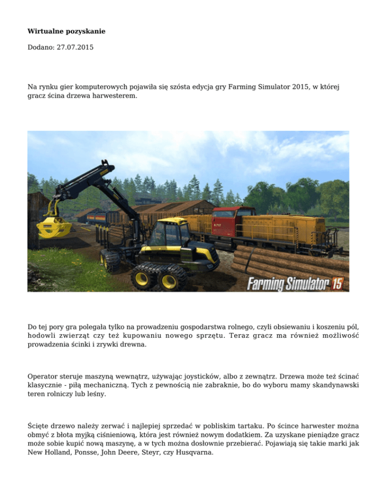 Wirtualne pozyskanie Dodano: 27.07.2015 Na rynku gier komputerowych pojawiła się szósta edycja gry Farming Simulator 2015, w której gracz ścina drzewa harwesterem. Do tej pory gra polegała tylko na prowadzeniu gospodarstwa rolnego, czyli obsiewaniu i koszeniu pól, hodowli zwierząt czy też kupowaniu nowego sprzętu. Teraz gracz ma również możliwość prowadzenia ścinki i zrywki drewna. Operator steruje maszyną wewnątrz, używając joysticków, albo z zewnątrz. Drzewa może też ścinać klasycznie - piłą mechaniczną. Tych z pewnością nie zabraknie, bo do wyboru mamy skandynawski teren rolniczy lub leśny. Ścięte drzewo należy zerwać i najlepiej sprzedać w pobliskim tartaku. Po ścince harwester można obmyć z błota myjką ciśnieniową, która jest również nowym dodatkiem. Za uzyskane pieniądze gracz może sobie kupić nową maszynę, a w tych można dosłownie przebierać. Pojawiają się takie marki jak New Holland, Ponsse, John Deere, Steyr, czy Husqvarna. Zdj. farming-simulator Opr. KB Komentarze (0) Nie dodano jeszcze żadnego komentarza.