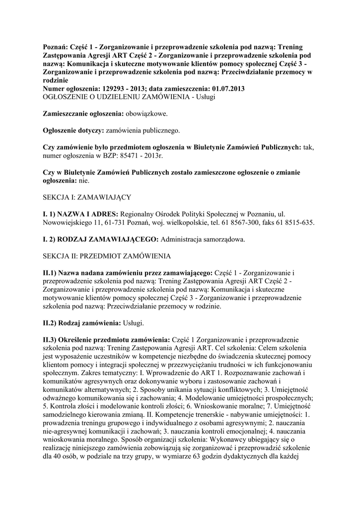 Poznań: Część 1 - Zorganizowanie i przeprowadzenie szkolenia pod nazwą: Trening Zastępowania Agresji ART Część 2 - Zorganizowanie i przeprowadzenie szkolenia pod nazwą: Komunikacja i skuteczne motywowanie klientów pomocy społecznej Część 3 Zorganizowanie i przeprowadzenie szkolenia pod nazwą: Przeciwdziałanie przemocy w rodzinie Numer ogłoszenia: 129293 - 2013; data zamieszczenia: 01.07.2013 OGŁOSZENIE O UDZIELENIU ZAMÓWIENIA - Usługi Zamieszczanie ogłoszenia: obowiązkowe. Ogłoszenie dotyczy: zamówienia publicznego. Czy zamówienie było przedmiotem ogłoszenia w Biuletynie Zamówień Publicznych: tak, numer ogłoszenia w BZP: 85471 - 2013r. Czy w Biuletynie Zamówień Publicznych zostało zamieszczone ogłoszenie o zmianie ogłoszenia: nie. SEKCJA I: ZAMAWIAJĄCY I. 1) NAZWA I ADRES: Regionalny Ośrodek Polityki Społecznej w Poznaniu, ul. Nowowiejskiego 11, 61-731 Poznań, woj. wielkopolskie, tel. 61 8567-300, faks 61 8515-635. I. 2) RODZAJ ZAMAWIAJĄCEGO: Administracja samorządowa. SEKCJA II: PRZEDMIOT ZAMÓWIENIA II.1) Nazwa nadana zamówieniu przez zamawiającego: Część 1 - Zorganizowanie i przeprowadzenie szkolenia pod nazwą: Trening Zastępowania Agresji ART Część 2 Zorganizowanie i przeprowadzenie szkolenia pod nazwą: Komunikacja i skuteczne motywowanie klientów pomocy społecznej Część 3 - Zorganizowanie i przeprowadzenie szkolenia pod nazwą: Przeciwdziałanie przemocy w rodzinie. II.2) Rodzaj zamówienia: Usługi. II.3) Określenie przedmiotu zamówienia: Część 1 Zorganizowanie i przeprowadzenie szkolenia pod nazwą: Trening Zastępowania Agresji ART. Cel szkolenia: Celem szkolenia jest wyposażenie uczestników w kompetencje niezbędne do świadczenia skutecznej pomocy klientom pomocy i integracji społecznej w przezwyciężaniu trudności w ich funkcjonowaniu społecznym. Zakres tematyczny: I. Wprowadzenie do ART 1. Rozpoznawanie zachowań i komunikatów agresywnych oraz dokonywanie wyboru i zastosowanie zachowań i komunikatów alternatywnych; 2. Sposoby unikania sytuacji konfliktowych; 3. Umiejętność odważnego komunikowania się i zachowania; 4. Modelowanie umiejętności prospołecznych; 5. Kontrola złości i modelowanie kontroli złości; 6. Wnioskowanie moralne; 7. Umiejętność samodzielnego kierowania zmianą. II. Kompetencje trenerskie - nabywanie umiejętności: 1. prowadzenia treningu grupowego i indywidualnego z osobami agresywnymi; 2. nauczania nie-agresywnej komunikacji i zachowań; 3. nauczania kontroli emocjonalnej; 4. nauczania wnioskowania moralnego. Sposób organizacji szkolenia: Wykonawcy ubiegający się o realizację niniejszego zamówienia zobowiązują się zorganizować i przeprowadzić szkolenie dla 40 osób, w podziale na trzy grupy, w wymiarze 63 godzin dydaktycznych dla każdej grupy (przy założeniu, że jedna godzina zajęć dydaktycznych to 45 minut). Szkolenie realizowane będzie w cyklu 3 trzydniowych (21 godzinnych) zjazdów wraz z zapewnieniem uczestnikom poszczególnych zjazdów dowozu, zakwaterowania oraz wyżywienia. Zajęcia będą prowadzone wspólnie przez dwóch szkoleniowców z zastrzeżeniem, że przynajmniej jeden z nich posiada certyfikat Trenera Trenerów, Treningu Zastępowania Agresji ART®. Uczestnik, który ukończył szkolenie otrzyma zaświadczenie o ukończeniu kursu trenerskiego wraz z poświadczeniem kompetencji do odbycia praktyki. Materiały szkoleniowe: Wykonawca zobowiązany jest zapewnić każdemu uczestnikowi komplet materiałów szkoleniowych Treningu Zastępowania Agresji ART® wraz ze szczegółowym harmonogramem zajęć. Materiały szkoleniowe zostaną przekazane Zamawiającemu do akceptacji nie później niż 5 dni przed podpisaniem umowy. Rekrutacja i obsługa administracyjna: Współpraca z Zamawiającym w zakresie naboru kandydatów na szkolenie i tworzenie listy uczestników oznacza: - nawiązanie kontaktu Wykonawcy z jednostkami pomocy i integracji społecznej w Wielkopolsce i na podstawie otrzymanych tą drogą zgłoszeń przeprowadzenie wstępnej kwalifikacji uczestników szkolenia oraz sporządzenie listy kandydatów do grupy, - przekazanie sporządzonej listy kandydatów Zamawiającemu w celu uzyskania jej akceptacji. Dostarczenie ww. listy musi nastąpić na 2 dni przed terminem rozpoczęcia pierwszego zjazdu, - poinformowanie kandydatów, po otrzymaniu od Zamawiającego akceptacji zgłoszonych uczestników, o zakwalifikowaniu się na szkolenie. Wykonawca dokonuje ww. czynności posługując się formularzami przygotowanymi przez Zamawiającego i z wykorzystaniem danych kontaktowych udostępnionych przez Zamawiającego (baza e-mail jednostek pomocy i integracji społecznej w Wielkopolsce). Zamawiający prowadzi działania wspierające działania Wykonawcy w formie ogłoszeń, listów oraz informacji na stronie internetowej. Mają one na celu promowanie szkolenia i informowanie o szkoleniu jednostek pomocy społecznej w Wielkopolsce. Organizacja szkolenia Dojazd: Wykonawca jest zobowiązany zorganizować dojazd uczestników na każdy zjazd: - pierwszego dnia zjazdu z miejsca zbiórki uczestników szkolenia do miejsca, w którym realizowane będzie szkolenie oraz - po zakończeniu zjazdu powrót do miejsca zbiórki. Zakwaterowanie: Wykonawca jest zobowiązany zapewnić zakwaterowanie uczestników zjazdów w pokojach 2 lub 1 osobowych, w hotelu trzygwiazdkowym lub ośrodku rekreacyjno-szkoleniowym spełniającym standard hotelu trzygwiazdkowego, położonym w woj. wielkopolskim, w tym w mieście Poznaniu. Sale szkoleniowe: Wykonawca powinien zapewnić uczestnikom szkolenia warunki do nauki w oparciu o zasady BHP. Wyżywienie: Wyżywienie powinno spełniać wymogi aktualnych wytycznych Instytutu Żywności i Żywienia, a dostarczane posiłki powinny zapewniać 100% całodziennego zapotrzebowania na energię i składniki odżywcze. Wykonawca zobowiązany jest zapewnić uczestnikom podczas zjazdu: - pierwszego dnia - obiad dwudaniowy z napojem oraz kolację,