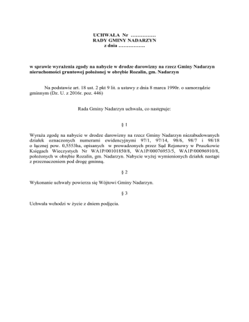 UCHWAŁA Nr …………… RADY GMINY NADARZYN z dnia ……………. w sprawie wyrażenia zgody na nabycie w drodze darowizny na rzecz Gminy Nadarzyn nieruchomości gruntowej położonej w obrębie Rozalin, gm. Nadarzyn Na podstawie art. 18 ust. 2 pkt 9 lit. a ustawy z dnia 8 marca 1990r. o samorządzie gminnym (Dz. U. z 2016r. poz. 446) Rada Gminy Nadarzyn uchwala, co następuje: §1 Wyraża zgodę na nabycie w drodze darowizny na rzecz Gminy Nadarzyn niezabudowanych działek oznaczonych numerami ewidencyjnymi 97/1, 97/14, 98/6, 98/7 i 98/18 o łącznej pow. 0,5553ha, opisanych w prowadzonych przez Sąd Rejonowy w Pruszkowie Księgach Wieczystych Nr WA1P/00101850/8, WA1P/00076953/5, WA1P/00096910/8, położonych w obrębie Rozalin, gm. Nadarzyn. Nabycie wyżej wymienionych działek nastąpi z przeznaczeniem pod drogę gminną. §2 Wykonanie uchwały powierza się Wójtowi Gminy Nadarzyn. §3 Uchwała wchodzi w życie z dniem podjęcia.