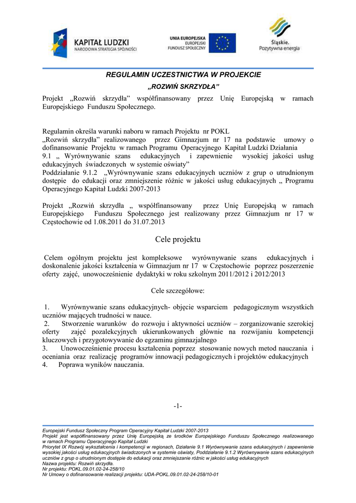 REGULAMIN UCZESTNICTWA W PROJEKCIE „ROZWIŃ SKRZYDŁA” Projekt „Rozwiń skrzydła” współfinansowany przez Unię Europejską w ramach Europejskiego Funduszu Społecznego. Regulamin określa warunki naboru w ramach Projektu nr POKL „Rozwiń skrzydła” realizowanego przez Gimnazjum nr 17 na podstawie umowy o dofinansowanie Projektu w ramach Programu Operacyjnego Kapitał Ludzki Działania 9.1 „ Wyrównywanie szans edukacyjnych i zapewnienie wysokiej jakości usług edukacyjnych świadczonych w systemie oświaty” Poddziałanie 9.1.2 „Wyrównywanie szans edukacyjnych uczniów z grup o utrudnionym dostępie do edukacji oraz zmniejszenie różnic w jakości usług edukacyjnych „ Programu Operacyjnego Kapitał Ludzki 2007-2013 Projekt „Rozwiń skrzydła „ współfinansowany przez Unię Europejską w ramach Europejskiego Funduszu Społecznego jest realizowany przez Gimnazjum nr 17 w Częstochowie od 1.08.2011 do 31.07.2013 Cele projektu Celem ogólnym projektu jest kompleksowe wyrównywanie szans edukacyjnych i doskonalenie jakości kształcenia w Gimnazjum nr 17 w Częstochowie poprzez poszerzenie oferty zajęć, unowocześnienie dydaktyki w roku szkolnym 2011/2012 i 2012/2013 Cele szczegółowe: 1. Wyrównywanie szans edukacyjnych- objęcie wsparciem pedagogicznym wszystkich uczniów mających trudności w nauce. 2. Stworzenie warunków do rozwoju i aktywności uczniów – zorganizowanie szerokiej oferty zajęć pozalekcyjnych ukierunkowanych głównie na rozwijaniu kompetencji kluczowych i przygotowywanie do egzaminu gimnazjalnego 3. Unowocześnienie procesu kształcenia poprzez stosowanie nowych metod nauczania i oceniania oraz realizację programów innowacji pedagogicznych i projektów edukacyjnych 4. Poprawa wyników nauczania. -1- Europejski Fundusz Społeczny Program Operacyjny Kapitał Ludzki 2007-2013 Projekt jest współfinansowany przez Unię Europejską ze środków Europejskiego Funduszu Społecznego realizowanego w ramach Programu Operacyjnego Kapitał Ludzki Priorytet IX Rozwój wykształcenia i kompetencji w regionach, Działanie 9.1 Wyrównywanie szans edukacyjnych i zapewnienie wysokiej jakości usług edukacyjnych świadczonych w systemie oświaty, Poddziałanie 9.1.2 Wyrównywanie szans edukacyjnych uczniów z grup o utrudnionym dostępie do edukacji oraz zmniejszanie różnic w jakości usług edukacyjnych Nazwa projektu: Rozwiń skrzydła. Nr projektu: POKL.09.01.02-24-258/10 Nr Umowy o dofinansowanie realizacji projektu: UDA-POKL.09.01.02-24-258/10-01 Rodzaje zajęć 1. Projekt realizowany będzie na terenie Gimnazjum nr 17 w Częstochowie i skierowany jest do uczniów tej placówki. 2. W projekcie prowadzone będą następujące rodzaje dodatkowych zajęć dla uczniów : - dodatkowe zajęcia pozalekcyjne z języka polskiego - dodatkowe zajęcia pozalekcyjne z języka angielskiego - dodatkowe zajęcia pozalekcyjne z matematyki - dodatkowe zajęcia pozalekcyjne z chemii - dodatkowe zajęcia pozalekcyjne z informatyki 3. W okresie trwania I i II edycji projektu „Rozwiń skrzydła” dopuszcza się zapisanie 3 ocen cząstkowych raz na kwartał tj w I semestrze 3 oceny oraz w II semestrze 3 oceny przedmiotowe z zajęć: język polski, matematyka, chemia, informatyka, język angielski Zasady naboru uczestników 1. Grupą docelową , która zostanie objęta wsparciem stanowią uczniowie Gimnazjum nr 17 w Częstochowie w roku szkolnym 2011/2012 i 2012/2013. Największe korzyści ze wzbogacenia oferty szkoły oraz z udoskonalenia kształcenia powinni odnieść uczniowie słabsi oraz ci , dla których szkoła jest jedynym miejscem edukacji i nie mają możliwości udziału w zajęciach pozaszkolnych. 2. Biuro projektu znajduje się w Gimnazjum nr 17 w Częstochowie przy ulicy Legionów 23. 3. Zgłoszenia do udziału w projekcie przyjmuje : - biuro projektu czynne w godzinach 14-18 - sekretariat szkoły czynny w godzinach 7-15 4. Deklaracje uczestnictwa oraz regulamin są dostępne na stronie internetowej szkoły : - www.gim17.czest.pl - w sekretariacie szkoły - w biurze projektu 5. Rekrutacja zamknięta potrwa miesiąc i będzie prowadzona na podstawie zgłoszeń złożonych na drukach – kwestionariusz zgłoszeniowy , które napłyną w odpowiedzi na podjęte działania promocyjne i rekrutacyjne. Potencjalni uczestnicy będą informowani o projekcie przez ulotki, plakaty. Będą one dystrybuowane na terenie szkoły. Na podstronie wszystkie informacje odnośnie projektu. www. projektu umieszczone zostaną Zorganizowane będą spotkania z uczniami i rodzicami zainteresowanych projektem Europejski Fundusz Społeczny Program Operacyjny Kapitał Ludzki 2007-2013 Projekt jest współfinansowany przez Unię Europejską ze środków Europejskiego Funduszu Społecznego realizowanego w ramach Programu Operacyjnego Kapitał Ludzki Priorytet IX Rozwój wykształcenia i kompetencji w regionach, Działanie 9.1 Wyrównywanie szans edukacyjnych i zapewnienie wysokiej jakości usług edukacyjnych świadczonych w systemie oświaty, Poddziałanie 9.1.2 Wyrównywanie szans edukacyjnych uczniów z grup o utrudnionym dostępie do edukacji oraz zmniejszanie różnic w jakości usług edukacyjnych Nazwa projektu: Rozwiń skrzydła. Nr projektu: POKL.09.01.02-24-258/10 Nr Umowy o dofinansowanie realizacji projektu: UDA-POKL.09.01.02-24-258/10-01 -26. W szkole powołuje się jeden zespół rekrutacyjny. Zespół ten stanowią 3 osoby: Specjalista ds. Promocji i Rekrutacji, Kierownik Projektu, Asystent Kierownika Projektu. 7. Zespół rekrutacyjny sprawdza kompletność złożonych kwestionariuszy zgłoszeniowych, przeprowadza ich analizę pod względem motywacji do nauki ,wyników w nauce z wybranego przedmiotu i wybiera grupę docelową. Zgłoszenia będą weryfikowane pod kątem spełnienia następujących kryteriów: miejsce zamieszkania na terenie woj. śląskiego, kompletność złożonych dokumentów rekrutacyjnych. 8. Rekrutacja jest prowadzona z uwzględnieniem zasad