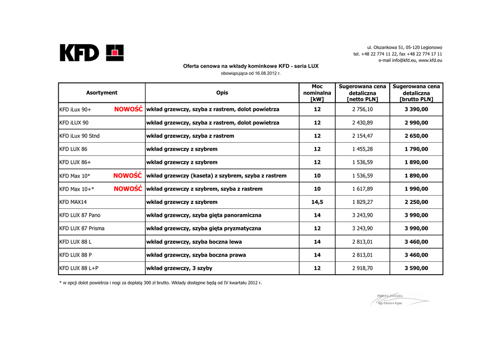 ul. Olszankowa 51, 05-120 Legionowo tel. +48 22 774 11 22, fax +48 22 774 17 11 e-mail [email protected], www.kfd.eu Oferta cenowa na wkłady kominkowe KFD - seria LUX obowiązująca od 16.08.2012 r. Moc nominalna [kW] Sugerowana cena detaliczna [netto PLN] Sugerowana cena detaliczna [brutto PLN] NOWOŚĆ wkład grzewczy, szyba z rastrem, dolot powietrza 12 2 756,10 3 390,00 KFD iLUX 90 wkład grzewczy, szyba z rastrem, dolot powietrza 12 2 430,89 2 990,00 KFD iLux 90 Stnd wkład grzewczy, szyba z rastrem 12 2 154,47 2 650,00 KFD LUX 86 wkład grzewczy z szybrem 12 1 455,28 1 790,00 KFD LUX 86+ wkład grzewczy z szybrem 12 1 536,59 1 890,00 Asortyment KFD iLux 90+ Opis KFD Max 10* NOWOŚĆ wkład grzewczy (kaseta) z szybrem, szyba z rastrem 10 1 536,59 1 890,00 KFD Max 10+* NOWOŚĆ wkład grzewczy z szybrem, szyba z rastrem 10 1 617,89 1 990,00 14,5 1 829,27 2 250,00 KFD MAX14 wkład grzewczy z szybrem KFD LUX 87 Pano wkład grzewczy, szyba gięta panoramiczna 14 3 243,90 3 990,00 KFD LUX 87 Prisma wkład grzewczy, szyba gięta pryzmatyczna 12 3 243,90 3 990,00 KFD LUX 88 L wkład grzewczy, szyba boczna lewa 14 2 813,01 3 460,00 KFD LUX 88 P wkład grzewczy, szyba boczna prawa 14 2 813,01 3 460,00 KFD LUX 88 L+P wkład grzewczy, 3 szyby 12 2 918,70 3 590,00 * w opcji dolot powietrza i nogi za dopłatą 300 zł brutto. Wkłady dostępne będą od IV kwartału 2012 r.