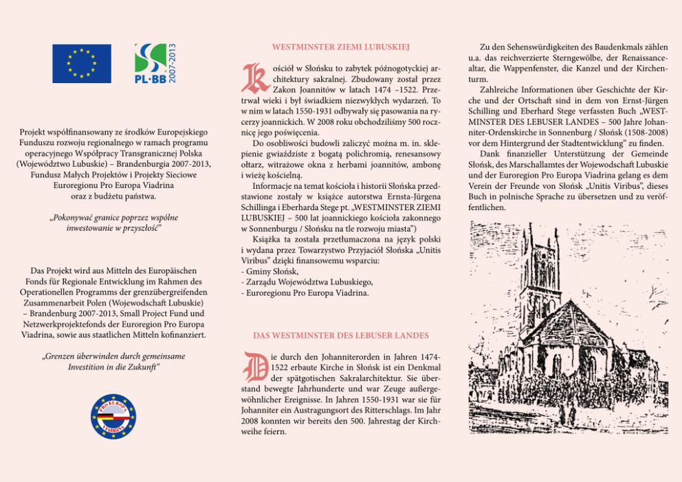 WESTMINSTER ZIEMI LUBUSKIEJ K Projekt współfinansowany ze środków Europejskiego Funduszu rozwoju regionalnego w ramach programu operacyjnego Współpracy Transgranicznej Polska (Województwo Lubuskie) – Brandenburgia 2007-2013, Fundusz Małych Projektów i Projekty Sieciowe Euroregionu Pro Europa Viadrina oraz z budżetu państwa. „Pokonywać granice poprzez wspólne inwestowanie w przyszłość” Das Projekt wird aus Mitteln des Europäischen Fonds für Regionale Entwicklung im Rahmen des Operationellen Programms der grenzübergreifenden Zusammenarbeit Polen (Wojewodschaft Lubuskie) – Brandenburg 2007-2013, Small Project Fund und Netzwerkprojektefonds der Euroregion Pro Europa Viadrina, sowie aus staatlichen Mitteln kofinanziert. „Grenzen überwinden durch gemeinsame Investition in die Zukunft” ościół w Słońsku to zabytek późnogotyckiej architektury sakralnej. Zbudowany został przez Zakon Joannitów w latach 1474 –1522. Przetrwał wieki i był świadkiem niezwykłych wydarzeń. To w nim w latach 1550-1931 odbywały się pasowania na rycerzy joannickich. W 2008 roku obchodziliśmy 500 rocznicę jego poświęcenia. Do osobliwości budowli zaliczyć można m. in. sklepienie gwiaździste z bogatą polichromią, renesansowy ołtarz, witrażowe okna z herbami joannitów, ambonę i wieżę kościelną. Informacje na temat kościoła i historii Słońska przedstawione zostały w książce autorstwa Ernsta-Jürgena Schillinga i Eberharda Stege pt. „WESTMINSTER ZIEMI LUBUSKIEJ – 500 lat joannickiego kościoła zakonnego w Sonnenburgu / Słońsku na tle rozwoju miasta”) Książka ta została przetłumaczona na język polski i wydana przez Towarzystwo Przyjaciół Słońska „Unitis Viribus” dzięki finansowemu wsparciu: - Gminy Słońsk, - Zarządu Województwa Lubuskiego, - Euroregionu Pro Europa Viadrina. DAS WESTMINSTER DES LEBUSER LANDES D ie durch den Johanniterorden in Jahren 14741522 erbaute Kirche in Słońsk ist ein Denkmal der spätgotischen Sakralarchitektur. Sie überstand bewegte Jahrhunderte und war Zeuge außergewöhnlicher Ereignisse. In Jahren 1550-1931 war sie für Johanniter ein Austragungsort des Ritterschlags. Im Jahr 2008 konnten wir bereits den 500. Jahrestag der Kirchweihe feiern. Zu den Sehenswürdigkeiten des Baudenkmals zählen u.a. das reichverzierte Sterngewölbe, der Renaissancealtar, die Wappenfenster, die Kanzel und der Kirchenturm. Zahlreiche Informationen über Geschichte der Kirche und der Ortschaft sind in dem von Ernst-Jürgen Schilling und Eberhard Stege verfassten Buch „WESTMINSTER DES LEBUSER LANDES – 500 Jahre Johanniter-Ordenskirche in Sonnenburg / Słońsk (1508-2008) vor dem Hintergrund der Stadtentwicklung” zu finden. Dank finanzieller Unterstützung der Gemeinde Słońsk, des Marschallamtes der Wojewodschaft Lubuskie und der Euroregion Pro Europa Viadrina gelang es dem Verein der Freunde von Słońsk „Unitis Viribus”, dieses Buch in polnische Sprache zu übersetzen und zu veröffentlichen. MAURYCJADA 2012 24 czerwca 14.00 - 18.00 Spotykamy się w parku wiejskim, aby w kolorowym korowodzie przebierańców przejść ulicami Słońska, podziwiając scenki teatralne przybliżające historię miejscowości. Powróciwszy do parku możemy brać udział w warsztatach budowy kościoła, występach, a także w konkursie na przebranie lub w konkursie wiedzy o kościele – na zwycięzców czekają nagrody!! Organizatorzy zadbali też o poczęstunek, aby uczestnicy Maurycjady nie opadli z sił. Zainteresowanych historią na pewno ucieszy zaplanowana w trakcie imprezy promocja książki o kościele oraz możliwość jej otrzymania wraz z autografem autora. Serdecznie zapraszamy dzieci i dorosłych! Przebrania mile widziane!!! MORITZFEST 2012 24. Juni, 14.00 - 18.00 UhrWir treffen uns im Dorfpark, um in einem farbigen kostümierten Festumzug gemeinsam über die Straßen von Słońsk zu gehen und dank Theaterdarbietungen die Geschichte der Ortschaft näher kennen zu lernen.Zurück im Park können Sie an einem Workshop für kleine Kirchenbauer oder an den Wettbewerben für das beste Kostüm und über die Geschichte der Kirche teilnehmen. Schöne Preise warten auf Gewinner!!! Bei einem von den Veranstaltern organisierten Imbiss können Teilnehmer des Moritzfestes wieder zu Kräften kommen. Alle an Geschichte Interessieren werden sich mit Sicherheit für die geplante Buchvorstellung und Autogrammstunde freuen. Kinder und Erwachsene sind herzlich eingeladen! Kostüme werden gerne gesehen!!! MAURYCJADA to dziecięce święto połączone z przedstawieniami teatralnymi i korowodem przebierańców, które ma na celu przypomnieć historię Słońska oraz sylwetkę Jana Maurycego von Nassau, dla upamiętnienia którego co roku odbywały się w Słońsku „Maurycjady”. Towarzystwo Przyjaciół Słońska „Unitis Viribus” przy wsparciu przedwojennych mieszkańców wznowiło tę tradycję w roku 2004. W tym roku spotykamy się po raz dziewiąty. Nasze spotkanie to podróż w przeszłość i wspaniała dziecięca zabawa. MORITZFEST ist eine traditionelle Kinderveranstaltung. Ein kostümierter Festumzug in Verbindung mit theatralischen Darbietungen erinnert an die Geschichte von Sonnenburg / Słońsk und an die Person des Fürsten Johann Moritz von Nassau, dem die Moritzfeste in der Vergangenheit gewidmet waren. Die Tradition wurde von dem Verein der Freunde von Słońsk „Unitis Viribus” bei Unterstützung der ehemaligen Sonnenburger im Jahre 2004 wiederbelebt. Dieses Jahr treffen wir uns bereits zum neunten mal und hoffen auf eine interessante Reise in die Vergangenheit und ein schönes Kinderspiel. TOWARZYSTWO PRZYJACIÓŁ SŁOŃSKA „UNITIS VIRIBUS” www.tps-unitisviribus.org.pl TOWARZYSTWO PRZYJACIÓŁ SŁOŃSKA „UNITIS VIRIBUS” i KOŁO PRZYJACIÓŁ SZTUKI I ZABYTKÓW NA DWORZE SIEVERSDORF zaprasza do parku 24 czerwca, godz. 14.00 Maurycjada 2012 VEREIN DER FREUNDE VON SŁOŃSK „UNITIS VIRIBUS“ und FREUNDESKREIS DE