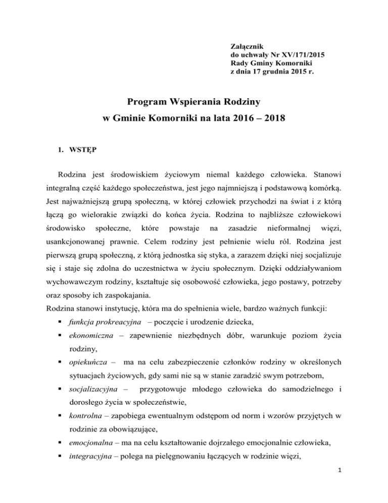 Załącznik do uchwały Nr XV/171/2015 Rady Gminy Komorniki z dnia 17 grudnia 2015 r. Program Wspierania Rodziny w Gminie Komorniki na lata 2016 – 2018 1. WSTĘP Rodzina jest środowiskiem życiowym niemal każdego człowieka. Stanowi integralną część każdego społeczeństwa, jest jego najmniejszą i podstawową komórką. Jest najważniejszą grupą społeczną, w której człowiek przychodzi na świat i z którą łączą go wielorakie związki do końca życia. Rodzina to najbliższe człowiekowi środowisko społeczne, które powstaje na zasadzie nieformalnej więzi, usankcjonowanej prawnie. Celem rodziny jest pełnienie wielu ról. Rodzina jest pierwszą grupą społeczną, z którą jednostka się styka, a zarazem dzięki niej socjalizuje się i staje się zdolna do uczestnictwa w życiu społecznym. Dzięki oddziaływaniom wychowawczym rodziny, kształtuje się osobowość człowieka, jego postawy, potrzeby oraz sposoby ich zaspokajania. Rodzina stanowi instytucję, która ma do spełnienia wiele, bardzo ważnych funkcji: funkcja prokreacyjna – poczęcie i urodzenie dziecka, ekonomiczna – zapewnienie niezbędnych dóbr, warunkuje poziom życia rodziny, opiekuńcza – ma na celu zabezpieczenie członków rodziny w określonych sytuacjach życiowych, gdy sami nie są w stanie zaradzić swym potrzebom, socjalizacyjna – przygotowuje młodego człowieka do samodzielnego i dorosłego życia w społeczeństwie, kontrolna – zapobiega ewentualnym odstępom od norm i wzorów przyjętych w rodzinie za obowiązujące, emocjonalna – ma na celu kształtowanie dojrzałego emocjonalnie człowieka, integracyjna – polega na pielęgnowaniu łączących w rodzinie więzi, 1 stratyfikacyjna – odpowiada za zapewnienie członkom rodziny określonego statusu życiowego, który wyznacza ich przynależność do określonej warstwy społecznej. Konstytucja Rzeczypospolitej Polskiej w art. 71 pkt. 1 mówi: „Państwo w swojej polityce społecznej i gospodarczej uwzględnia dobro rodziny. Rodziny znajdujące się w trudnej sytuacji materialnej i społecznej, zwłaszcza wielodzietne i niepełne, mają prawo do szczególnej pomocy ze strony władz publicznych”. Na poziomie gminy działania te realizują jednostki organizacyjne samorządu terytorialnego wspierane przez organizacje pozarządowe. Program Wspierania Rodziny skierowany jest głównie do rodzin dysfunkcyjnych znajdujących się w grupie podwyższonego ryzyka i zagrożonych wykluczeniem społecznym. Niemniej jednak oddziaływaniem i wsparciem zostaną objęte także rodziny, które na skutek sytuacji życiowych, często kryzysowych, zostały zmuszone do korzystania z pomocy Ośrodka Pomocy Społecznej w Komornikach. Celem nadrzędnym jest wzmocnienie rodzin poprzez udzielenie pomocy i holistycznego wsparcia, by zminimalizować skutki deficytów i zaburzeń równowagi w systemie rodzinnym. Przewidziana praca z rodziną oraz wszelkie formy pomocy mają na celu zaspokojenie podstawowych potrzeb bytowych rodziny, jak również aktywizację jej zasobów przy wzmocnieniu kompetencji i umiejętności społecznych. Działania mają na celu stworzenie optymalnych warunków do życia i rozwoju dziecka oraz podniesienia jakości życia całej rodziny. Należy zaznaczyć, że właściwie funkcjonujące, zdrowe rodziny pozwalają na lepsze funkcjonowanie społeczności lokalnej i dają perspektywę rozwoju i podniesienia standardu życia. Wspieranie i pomoc rodzinie, to jednocześnie wzmacnianie społeczności lokalnej. W rodzinę należy inwestować i wierzyć w możliwość samodzielnego wykonywania podstawowych funkcji i w tym celu zostaje stworzony niniejszy program obejmujący pomocą rodziny zagrożone różnego rodzaju dysfunkcjami oraz dzieci i młodzież zagrożoną niedostosowaniem społecznym. Gminny Program Wspierania Rodziny zakłada, że: 2 1. Opieka nad dziećmi, pozbawionymi wsparcia ze strony rodziny naturalnej, stanowić będzie element szerszego programu wspierania rodzin w środowisku lokalnym. Większe znaczenie będą mieć działania profilaktyczne, a więc wsparcie udzielane rodzinie naturalnej dziecka przed wystąpieniem sytuacji kryzysowej, zmuszającej do zabrania dziecka z domu i umieszczenia go w rodzinie zastępczej lub w placówce opiekuńczo - wychowawczej. Uwzględniono również aspekty ekonomiczne, bo pobyt dziecka w placówce pociąga za sobą niewspółmiernie większe nakłady finansowe ze środków publicznych niż pomoc finansowa adresowana do rodzin. 2. Praca socjalna z rodzicami dziecka będzie również kontynuowana po jego zabraniu z domu tak, aby zwiększyć szansę jego powrotu do rodziny. Pobyt w rodzinie zastępczej traktowany jest więc jako wsparcie okresowe, które nie prowadzi do trwałego zerwania więzi dziecka z jego naturalnymi rodzicami. Również pobyt dziecka w placówce powinien być traktowany jako rozwiązanie czasowe, prowadzące do unormowania sytuacji w rodzinie naturalnej. 3. Wzmożona uwaga i monitoring powinny być związane z procesem usamodzielniania wychowanków rodzin zastępczych i placówek opiekuńczo – wychowawczych, dlatego też zakłada się współpracę z rożnymi instytucjami, między innymi Powiatowym Centrum Pomocy Rodzinie, placówkami opiekuńczo-wychowawczymi itp. 4. W celu wspierania rodziny przeżywającej trudności w wypełnianiu funkcji opiekuńczo–wychowawczych rodzina może zostać objęta pomocą m.in. asystenta rodziny, a także pracownika socjalnego, pedagoga, psychologa itp. 2. PODSTAWY PRAWNE: Ustawa z dnia 9 czerwca 2011r. o wspieraniu rodziny i systemie pieczy zastępczej (tekst jednolity: Dz.U. 2015r., poz. 332), Ustawa z dnia 12 marca 2004r. o pomocy społecznej (tekst jednolity: Dz.U. 2015r. poz. 163), Ustawa z dnia 29 lipca 2005r. o przeciwdziałaniu przemocy w rodzinie (tekst jednolity: Dz. U. 2015r. poz. 1390), Ustawa z dnia 26 października 1982r. o wychowaniu w trzeźwości i przeciwdziałaniu alkoholizmowi (tekst jednolity: Dz.U