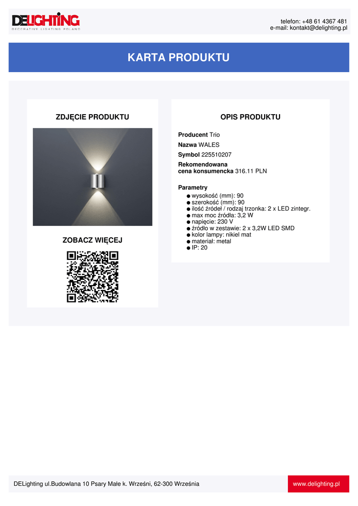 telefon: +48 61 4367 481 e-mail: [email protected] KARTA PRODUKTU ZDJĘCIE PRODUKTU OPIS PRODUKTU Producent Trio Nazwa WALES Symbol 225510207 Rekomendowana cena konsumencka 316.11 PLN ZOBACZ WIĘCEJ Parametry ● wysokość (mm): 90 ● szerokość (mm): 90 ● ilość źródeł / rodzaj trzonka: 2 x LED zintegr. ● max moc źródła: 3,2 W ● napięcie: 230 V ● źródło w zestawie: 2 x 3,2W LED SMD ● kolor lampy: nikiel mat ● materiał: metal ● IP: 20 DELighting ul.Budowlana 10 Psary Małe k. Wrześni, 62-300 Września www.delighting.pl