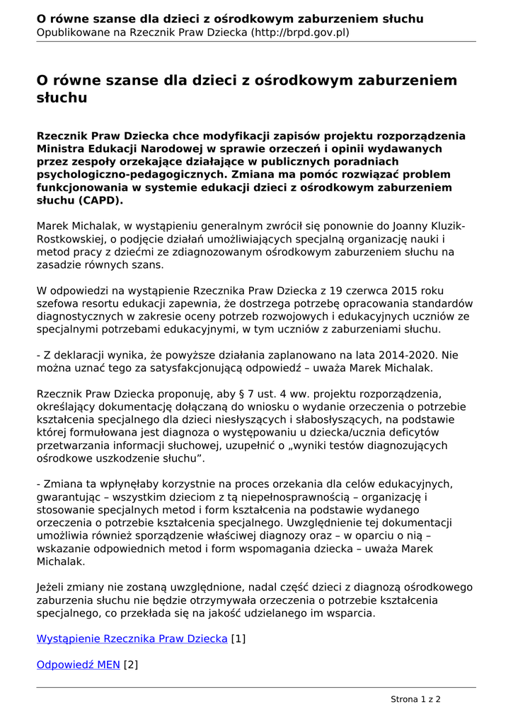 O równe szanse dla dzieci z ośrodkowym zaburzeniem słuchu Opublikowane na Rzecznik Praw Dziecka (http://brpd.gov.pl) O równe szanse dla dzieci z ośrodkowym zaburzeniem słuchu Rzecznik Praw Dziecka chce modyfikacji zapisów projektu rozporządzenia Ministra Edukacji Narodowej w sprawie orzeczeń i opinii wydawanych przez zespoły orzekające działające w publicznych poradniach psychologiczno-pedagogicznych. Zmiana ma pomóc rozwiązać problem funkcjonowania w systemie edukacji dzieci z ośrodkowym zaburzeniem słuchu (CAPD). Marek Michalak, w wystąpieniu generalnym zwrócił się ponownie do Joanny KluzikRostkowskiej, o podjęcie działań umożliwiających specjalną organizację nauki i metod pracy z dziećmi ze zdiagnozowanym ośrodkowym zaburzeniem słuchu na zasadzie równych szans. W odpowiedzi na wystąpienie Rzecznika Praw Dziecka z 19 czerwca 2015 roku szefowa resortu edukacji zapewnia, że dostrzega potrzebę opracowania standardów diagnostycznych w zakresie oceny potrzeb rozwojowych i edukacyjnych uczniów ze specjalnymi potrzebami edukacyjnymi, w tym uczniów z zaburzeniami słuchu. - Z deklaracji wynika, że powyższe działania zaplanowano na lata 2014-2020. Nie można uznać tego za satysfakcjonującą odpowiedź – uważa Marek Michalak. Rzecznik Praw Dziecka proponuję, aby § 7 ust. 4 ww. projektu rozporządzenia, określający dokumentację dołączaną do wniosku o wydanie orzeczenia o potrzebie kształcenia specjalnego dla dzieci niesłyszących i słabosłyszących, na podstawie której formułowana jest diagnoza o występowaniu u dziecka/ucznia deficytów przetwarzania informacji słuchowej, uzupełnić o „wyniki testów diagnozujących ośrodkowe uszkodzenie słuchu”. - Zmiana ta wpłynęłaby korzystnie na proces orzekania dla celów edukacyjnych, gwarantując – wszystkim dzieciom z tą niepełnosprawnością – organizację i stosowanie specjalnych metod i form kształcenia na podstawie wydanego orzeczenia o potrzebie kształcenia specjalnego. Uwzględnienie tej dokumentacji umożliwia również sporządzenie właściwej diagnozy oraz – w oparciu o nią – wskazanie odpowiednich metod i form wspomagania dziecka – uważa Marek Michalak. Jeżeli zmiany nie zostaną uwzględnione, nadal część dzieci z diagnozą ośrodkowego zaburzenia słuchu nie będzie otrzymywała orzeczenia o potrzebie kształcenia specjalnego, co przekłada się na jakość udzielanego im wsparcia. Wystąpienie Rzecznika Praw Dziecka [1] Odpowiedź MEN [2] Strona 1 z 2 O równe szanse dla dzieci z ośrodkowym zaburzeniem słuchu Opublikowane na Rzecznik Praw Dziecka (http://brpd.gov.pl) Udostępnij: Facebook [4] Google Plus [5] Twitter [6] Adres URL źródła: http://brpd.gov.pl/aktualnosci-wystapienia-generalne/o-rowneszanse-dla-dzieci-z-osrodkowym-zaburzeniem-sluchu View the full image [3] Odnośniki: [1] http://brpd.gov.pl/sites/default/files/wyst_2015_07_07_men_0.pdf [2] http://brpd.gov.pl/sites/default/files/men-_odpowiedz_na_wystapienie_zew.422.1 8.2015.es.pdf [3] http://brpd.gov.pl/sites/default/files/podpis_chmurka_25.jpg [4] http://facebook.com/sharer.php?u=http%3A%2F%2Fbrpd.gov.pl%2Faktualnosciwystapienia-generalne%2Fo-rowne-szanse-dla-dzieci-z-osrodkowym-zaburzeniem-sl uchu&t=O%20r%C3%B3wne%20szanse%20dla%20dzieci%20z%20o%C5%9Br odkowym%20zaburzeniem%20s%C5%82uchu [5] https://plus.google.com/share?url=http%3A%2F%2Fbrpd.gov.pl%2Faktualnosciwystapienia-generalne%2Fo-rowne-szanse-dla-dzieci-z-osrodkowym-zaburzeniemsluchu [6] http://twitter.com/intent/tweet?url=http%3A%2F%2Fbrpd.gov.pl%2Faktualnosciwystapienia-generalne%2Fo-rowne-szanse-dla-dzieci-z-osrodkowym-zaburzeniem-sl uchu&text=O%20r%C3%B3wne%20szanse%20dla%20dzieci%20z%20o%C5% 9Brodkowym%20zaburzeniem%20s%C5%82uchu Strona 2 z 2