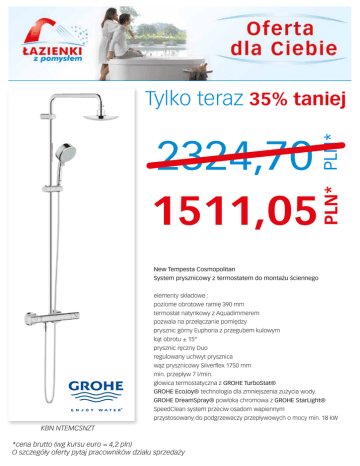 2324,70 1511,05 PLN* PLN* Tylko teraz 35% taniej New Tempesta Cosmopolitan System prysznicowy z termostatem do montażu ściennego elementy składowe : poziome obrotowe ramię 390 mm termostat natynkowy z Aquadimmerem pozwala na przełączanie pomiędzy prysznic górny Euphoria z przegubem kulowym kąt obrotu ± 15° prysznic ręczny Duo regulowany uchwyt prysznica wąż prysznicowy Silverflex 1750 mm min. przepływ 7 l/min. głowica termostatyczna z GROHE TurboStat® GROHE EcoJoy® technologia dla zmniejszenia zużycia wody. GROHE DreamSpray® powłoka chromowa z GROHE StarLight® SpeedClean system przeciw osadom wapiennym przystosowany do podgrzewaczy przepływowych o mocy min. 18 kW KBN NTEMCSNZT *cena brutto (wg kursu euro = 4,2 pln) O szczegóły oferty pytaj pracowników działu sprzedaży