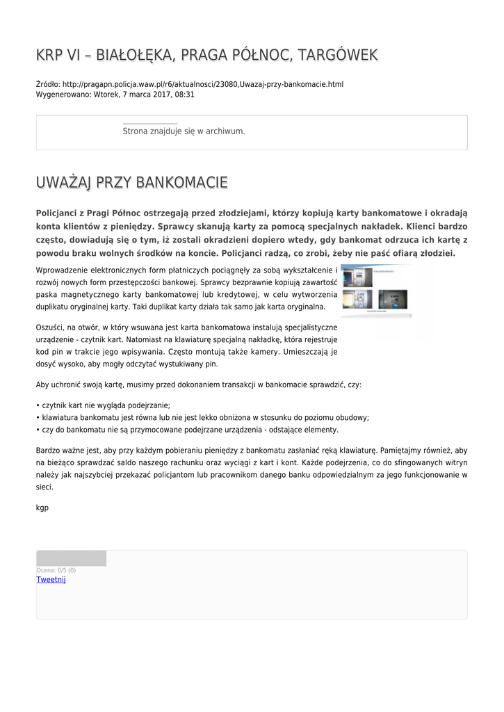 KRP VI – BIAŁOŁĘKA, PRAGA PÓŁNOC, TARGÓWEK Źródło: http://pragapn.policja.waw.pl/r6/aktualnosci/23080,Uwazaj-przy-bankomacie.html Wygenerowano: Wtorek, 7 marca 2017, 08:31 Strona znajduje się w archiwum. UWAŻAJ PRZY BANKOMACIE Policjanci z Pragi Północ ostrzegają przed złodziejami, którzy kopiują karty bankomatowe i okradają konta klientów z pieniędzy. Sprawcy skanują karty za pomocą specjalnych nakładek. Klienci bardzo często, dowiadują się o tym, iż zostali okradzieni dopiero wtedy, gdy bankomat odrzuca ich kartę z powodu braku wolnych środków na koncie. Policjanci radzą, co zrobi, żeby nie paść ofiarą złodziei. Wprowadzenie elektronicznych form płatniczych pociągnęły za sobą wykształcenie i rozwój nowych form przestępczości bankowej. Sprawcy bezprawnie kopiują zawartość paska magnetycznego karty bankomatowej lub kredytowej, w celu wytworzenia duplikatu oryginalnej karty. Taki duplikat karty działa tak samo jak karta oryginalna. Oszuści, na otwór, w który wsuwana jest karta bankomatowa instalują specjalistyczne urządzenie - czytnik kart. Natomiast na klawiaturę specjalną nakładkę, która rejestruje kod pin w trakcie jego wpisywania. Często montują także kamery. Umieszczają je dosyć wysoko, aby mogły odczytać wystukiwany pin. Aby uchronić swoją kartę, musimy przed dokonaniem transakcji w bankomacie sprawdzić, czy: • czytnik kart nie wygląda podejrzanie; • klawiatura bankomatu jest równa lub nie jest lekko obniżona w stosunku do poziomu obudowy; • czy do bankomatu nie są przymocowane podejrzane urządzenia - odstające elementy. Bardzo ważne jest, aby przy każdym pobieraniu pieniędzy z bankomatu zasłaniać ręką klawiaturę. Pamiętajmy również, aby na bieżąco sprawdzać saldo naszego rachunku oraz wyciągi z kart i kont. Każde podejrzenia, co do sfingowanych witryn należy jak najszybciej przekazać policjantom lub pracownikom danego banku odpowiedzialnym za jego funkcjonowanie w sieci. kgp Ocena: 0/5 (0) Tweetnij