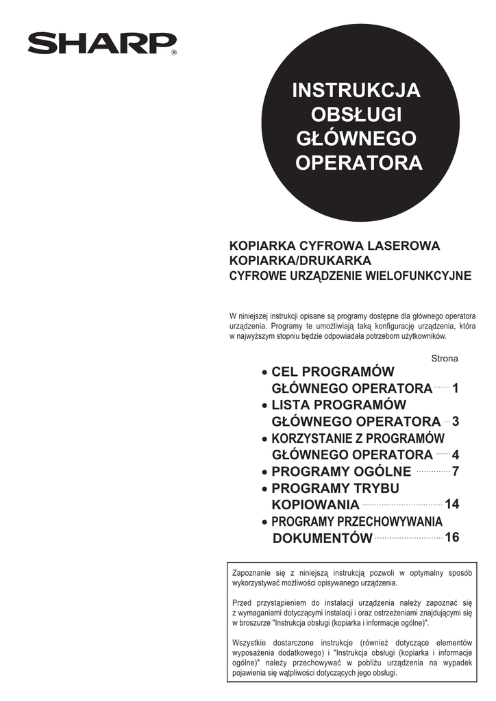 INSTRUKCJA OBSŁUGI GŁÓWNEGO OPERATORA KOPIARKA CYFROWA LASEROWA KOPIARKA/DRUKARKA CYFROWE URZĄDZENIE WIELOFUNKCYJNE W niniejszej instrukcji opisane są programy dostępne dla głównego operatora urządzenia. Programy te umożliwiają taką konfigurację urządzenia, która w najwyższym stopniu będzie odpowiadała potrzebom użytkowników. Strona • CEL PROGRAMÓW GŁÓWNEGO OPERATORA 1 • LISTA PROGRAMÓW GŁÓWNEGO OPERATORA 3 • KORZYSTANIE Z PROGRAMÓW GŁÓWNEGO OPERATORA 4 7 • PROGRAMY OGÓLNE • PROGRAMY TRYBU 14 KOPIOWANIA • PROGRAMY PRZECHOWYWANIA 16 DOKUMENTÓW ....... ... ...... .............. ................................. ............................ Zapoznanie się z niniejszą instrukcją pozwoli w optymalny sposób wykorzystywać możliwości opisywanego urządzenia. Przed przystąpieniem do instalacji urządzenia należy zapoznać się z wymaganiami dotyczącymi instalacji i oraz ostrzeżeniami znajdującymi się w broszurze "Instrukcja obsługi (kopiarka i informacje ogólne)". Wszystkie dostarczone instrukcje (również dotyczące elementów wyposażenia dodatkowego) i "Instrukcja obsługi (kopiarka i informacje ogólne)" należy przechowywać w pobliżu urządzenia na wypadek pojawienia się wątpliwości dotyczących jego obsługi. Spis treści strona ●CEL PROGRAMÓW GŁÓWNEGO OPERATORA ..............................................................................1 ●LISTA PROGRAMÓW GŁÓWNEGO OPERATORA ..........................................................................3 ●KORZYSTANIE Z PROGRAMÓW GŁÓWNEGO OPERATORA ........................................................4 ●PROGRAMY OGÓLNE ........................................................................................................................7 ●PROGRAMY TRYBU KOPIOWANIA.................................................................................................14 ●PROGRAMY PRZECHOWYWANIA DOKUMENTÓW ......................................................................16 CEL PROGRAMÓW GŁÓWNEGO OPERATORA Programy głównego operatora są używane przez głównego operatora (administratora urządzenia) do dopasowania pewnych funkcji urządzenia do potrzeb użytkowników. Ten podręcznik omawia programy odnoszące się do ogólnej obsługi urządzenia, funkcji kopiowania oraz funkcji przechowywania dokumentów. Programy odnoszące się do funkcji drukarki, faksu, skanera sieciowego i faksu internetowego są opisane w następujących instrukcjach obsługi: ●Drukarka . . . . . . . . . . . . . . . . . . . . . . . . . . . . . Instrukcja obsługi (drukarki), rozdział 5 ●Faks . . . . . . . . . . . . . . . . . . . . . . . . . . . . . . . . . Instrukcja obsługi (faksu), rozdział 8 ●Skaner sieciowy / Faks internetowy. . . . . . . . . Instrukcja obsługi (skanera sieciowego), strona 52 Aby wejść w tryb programów głównego operatora, należy wprowadzić kod. Programy ogólnej obsługi urządzenia Te programy są używane do włączania trybu kontroli dostępu, ustawiania trybów oszczędzania energii i dokonywania ustawień urządzeń opcjonalnych. Tryb kontroli dostępu może być włączony oddzielnie dla funkcji kopiowania, drukowania, faksowania/faksowania internetowego/skanowania sieciowego i funkcji przechowywania dokumentów. Gdy w danej funkcji jest włączony tryb kontroli dostępu, trzeba wprowadzić kod dostępu, aby można było korzystać z tej funkcji. Gdy tryb kontroli dostępu jest uaktywniony dla funkcji drukarki, kod dostępu jest wprowadzany na komputerze użytkownika w sterowniku drukarki. (W zależności od ustawienia "Anuluj prace nieważnych kont" (str.8), zadanie może zostać wydrukowane nawet jeśli został wprowadzony nieprawidłowy kod dostępu.) * Kod dostępu jest pięciocyfrową liczbą i może być utworzonych do 500 kont. Programy funkcji kopiowania Te programy są używane do zmiany domyślnych, fabrycznych ustawień kopiowania na te, które bardziej odpowiadają użytkownikom. Gdy tryb kontroli dostępu jest uaktywniony w funkcji kopiowania: ● Musi byś wprowadzony ważny kod dostępu (numer konta), aby wykonywać kopie. (Bez tego kopiowanie jest niemożliwe.) ● Ilości wykonanych kopii są zliczane na każde konto oddzielnie. To pozwala na monitorowanie stopnia korzystania z kopiarki przez każdego użytkownika. (Może być podana również całkowita ilość kopii wykonana przez urządzenie.) ● W każdym koncie można ustawić limit ilości kopii jaka może zostać wykonana. INFO Numer konta musi być również wprowadzony, aby wydrukować dokument, który został zachowany w czasie kopiowania przy użyciu funkcji przechowywania dokumentów. (Wydruk nie będzie możliwy bez wprowadzenia numeru konta.) Ilość wydrukowanych stron zostanie dodana do konta wykonanych kopii. 1 CEL PROGRAMÓW GŁÓWNEGO OPERATORA Programy funkcji przechowywania dokumentów Te programy są używane do zmiany domyślnych, fabrycznych ustawień funkcji przechowywania dokumentów na te, które bardziej odpowiadają użytkownikom. Gdy tryb kontroli dostępu jest uaktywniony w funkcji przechowywania dokumentów: ● Musi być wprowadzony numer konta, aby wydrukować obraz zachowany w skanowaniu. (Bez tego drukowanie nie jest możliwe.) ● Ilości wykonanych wydruków są zliczane na każde konto oddzielnie. To pozwala na monitorowanie stopnia korzystania z urządzenia w funkcji przechowywania dokumentów przez każdego użytkownika. ● W każdym koncie można ustawić limit ilości wydruków obrazów zachowanych podczas skanowania. Programowanie kodu głównego operatora Kodem głównego operatora jest 5-cyfrowy numer, który musi być wprowadzony, aby wejść do programów głównego operatora. Główny operator (administrator urządzenia) powinien zmienić fabryczne ustawienie kodu. Zapamiętaj nowy kod, abyś mógł go wprowadzić za każdym razem gdy wchodzisz w programy. (Może zostać zaprogramowany tylko jeden kod głównego operator