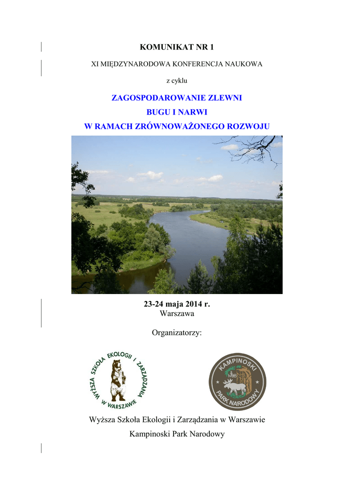 KOMUNIKAT NR 1 XI MIĘDZYNARODOWA KONFERENCJA NAUKOWA z cyklu ZAGOSPODAROWANIE ZLEWNI BUGU I NARWI W RAMACH ZRÓWNOWAŻONEGO ROZWOJU 23-24 maja 2014 r. Warszawa Organizatorzy: Wyższa Szkoła Ekologii i Zarządzania w Warszawie Kampinoski Park Narodowy Tematyka konferencji: • • • • • • • • • • • • • • • • zasoby wodne zlewni Bugu, Narwi lub innych wód powierzchniowych jakość zasobów wodnych monitoring jakości wód uzdatnianie wody oczyszczanie ścieków unieszkodliwianie osadów ściekowych zarządzanie gospodarką wodną zagadnienia ekonomiczne gospodarki wodnej współpraca na wodach granicznych systemy prawne dotyczące gospodarki wodnej gospodarka wodna w lasach wpływ składowania odpadów na jakość wód wpływ antropopresji na stan środowiska różnorodność biologiczna zlewni turystyka a ochrona środowiska inwestycje infrastrukturalne dla środowiska i turystyki Miejsce obrad i sesji terenowej: 23.05.2014 r. - sesja referatowa - Wyższa Szkoła Ekologii i Zarządzania, Warszawa, ul Rejtana 16 24.05.2014 r. - sesja terenowa - Kampinoski Park Narodowy Komitet Naukowy prof. dr hab. inż. Jan Misiak – Prezydent WSEiZ doc. dr Monika Madej – Rektor WSEiZ (przewodnicząca) prof. dr hab. inż. Marek Gromiec prof. dr hab. Igor Gudkov (Kijów) prof. dr hab. inż. Rafał Miłaszewski prof. dr hab. Valentina M. Minarchenko (Kijów) prof. dr hab. inż. Józef Mosiej prof. dr hab. Oleg N. Rusak (Saint-Petersburg) prof. dr hab. Platon Tretiak (Lwów) doc. dr inż. Jan Cetner doc. dr Kazimierz Dyguś doc. dr Piotr Tomaszewski doc. dr inż. Jerzy Wojtatowicz Komitet Organizacyjny doc. dr Kazimierz Dyguś (przewodniczący) doc. dr Piotr Tomaszewski – Dziekan Wydziału Ekologii WSEiZ (wiceprzewodniczący) dr Dawid Marczak mgr Sławomir Baczulis inż. Dorota Pastuszka Monika Bułkowska Streszczenia prezentacji Prosimy o przygotowanie streszczeń referatów w języku polskim w celu opublikowania ich w materiałach konferencyjnych. Teksty o objętości 2000-2500 znaków należy przesłać w wersji elektronicznej e-mailem lub na płycie CD w programie MS Word, czcionką Times New Roman CE 12 pkt. (format A4). Streszczenie należy przesłać w nieprzekraczalnym terminie do 28.02.2014 r. Opłaty Przewidywana opłata konferencyjna (obsługa konferencji, druk materiałów konferencyjnych, publikacja monografii, lunch, wycieczka, autokar, ognisko) – 400 zł, doktoranci – 200 zł, studenci – 100 zł Zakwaterowanie Hotel Reytan, Warszawa, ul. Rejtana 6 – ok. 300 za dobę Hotel Politechniki Warszawskiej, ul. Polna 50 – ok. 150 za dobę Opłatę za zakwaterowanie uczestnicy konferencji dokonują we własnym zakresie Publikacja wygłoszonych referatów Przyjęte do druku artykuły zostaną opublikowane w formie monografii po konferencji. Prosimy nadsyłać teksty w języku angielskim wraz ze streszczeniem w języku polskim. Przysłane do druku artykuły zostaną poddane normalnej procedurze redakcyjnej. Prace należy przesłać pocztą elektroniczną lub listownie (wydruk wraz z nośnikiem elektronicznym). Artykuł należy przesłać do 15.V.2014 r. lub złożyć podczas konferencji Szczegółowe wymogi redakcyjne znajdują się w załączeniu Ważne terminy 15.II.2014 r. - zgłoszenie uczestnictwa 28.II.2014 r. - nadesłanie streszczenia do druku 30.IV.2014 r. - wniesienie opłaty konferencyjnej 15.V.2014 r. - nadesłanie pełnych tekstów prac do publikacji w języku angielskim (wymogi edytorskie w załączeniu) Adres Komitetu Organizacyjnego doc. dr Kazimierz Dyguś Wyższa Szkoła Ekologii i Zarządzania Wydział Ekologii 00-792 Warszawa, ul. Olszewska 12 Tel. (22) 825 63 21; 603 662 620 e-mail: [email protected] Szczegółowe informacje na temat programu konferencji zostaną podane w komunikacie nr 2