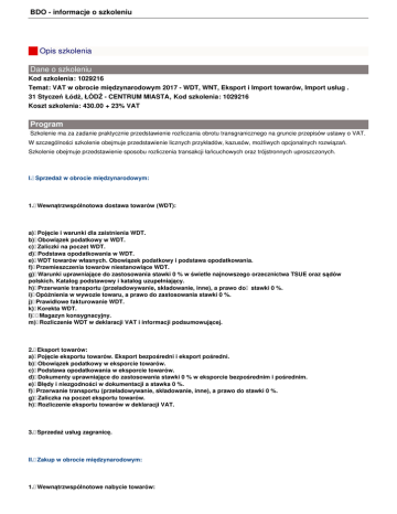 BDO - informacje o szkoleniu Opis szkolenia Dane o szkoleniu Kod szkolenia: 1029216 Temat: VAT w obrocie międzynarodowym 2017 - WDT, WNT, Eksport i Import towarów, Import usług . 31 Styczeń Łódź, ŁÓDŹ - CENTRUM MIASTA, Kod szkolenia: 1029216 Koszt szkolenia: 430.00 + 23% VAT Program Szkolenie ma za zadanie praktycznie przedstawienie rozliczania obrotu transgranicznego na gruncie przepisów ustawy o VAT. W szczególności szkolenie obejmuje przedstawienie licznych przykładów, kazusów, możliwych opcjonalnych rozwiązań. Szkolenie obejmuje przedstawienie sposobu rozliczenia transakcji łańcuchowych oraz trójstronnych uproszczonych. I. Sprzedaż w obrocie międzynarodowym: 1. Wewnątrzwspólnotowa dostawa towarów (WDT): a) Pojęcie i warunki dla zaistnienia WDT. b) Obowiązek podatkowy w WDT. c) Zaliczki na poczet WDT. d) Podstawa opodatkowania w WDT. e) WDT towarów własnych. Obowiązek podatkowy i podstawa opodatkowania. f) Przemieszczenia towarów niestanowiące WDT. g) Warunki uprawniające do zastosowania stawki 0 % w świetle najnowszego orzecznictwa TSUE oraz sądów polskich. Katalog podstawowy i katalog uzupełniający. h) Przerwanie transportu (przeładowywanie, składowanie, inne), a prawo do stawki 0 %. i) Opóźnienia w wywozie towaru, a prawo do zastosowania stawki 0 %. j) Prawidłowe fakturowanie WDT. k) Korekta WDT. l) Magazyn konsygnacyjny. m) Rozliczenie WDT w deklaracji VAT i informacji podsumowującej. 2. Eksport towarów: a) Pojęcie eksportu towarów. Eksport bezpośredni i eksport pośredni. b) Obowiązek podatkowy w eksporcie towarów. c) Podstawa opodatkowania w eksporcie towarów. d) Dokumenty uprawniające do zastosowania stawki 0 % w eksporcie bezpośrednim i pośrednim. e) Błędy i niezgodności w dokumentacji a stawka 0 %. f) Przerwanie transportu (przeładowywanie, składowanie, inne), a prawo do stawki 0 %. g) Zaliczka na poczet eksportu towarów. h) Rozliczenie eksportu towarów w deklaracji VAT. 3. Sprzedaż usług zagranicę. II. Zakup w obrocie międzynarodowym: 1. Wewnątrzwspólnotowe nabycie towarów: BDO - informacje o szkoleniu a) Pojęcie i warunki dla zaistnienia WNT. b) Wyłączenia z WNT. c) Przemieszczenia towarów niestanowiące WNT. d) WNT towarów własnych. e) Obowiązek podatkowy w WNT. f) Zaliczki na poczet WNT. g) Faktura proforma od dostawcy, faktura zaliczkowa na 100 %, faktura przed dostawą a obowiązek podatkowy z tytułu WNT. h) Podstawa opodatkowania w WNT. i) Korekta WNT. j) Odliczenie podatku naliczonego z tytułu WNT - nowe, istotne zmiany obowiązujące od 2017 r. Zasady postępowania w przypadku braku faktury oraz w przypadku późniejszego otrzymania faktury. 2. Import towarów: a) Pojęcie importu towarów. b) Podatnik VAT z tytułu importu towarów. c) Obowiązek podatkowy w imporcie towarów. d) Podstawa opodatkowania. e) Procedura uproszczona rozliczania importu towarów. 3. Import usług: a) Pojęcie i warunki stanowiące o imporcie usług. b) Obowiązek podatkowy w imporcie usług. Określenie momentu wykonania usługi. c) Faktura od kontrahenta zagranicznego, a obowiązek podatkowy. Prawidłowy kurs. d) Odliczenie podatku naliczonego przy imporcie usług nowe, istotne zmiany obowiązujące od 2017 r. e) Pomyłki w rozliczaniu impostu usług jako przykład nowej regulacji o dodatkowych sankcji pieniężnych za błędy w VAT od 2017 r. d) Podstawa opodatkowania w imporcie usług. e) Import usług w deklaracji VAT - 7. III. Transakcje łańcuchowe: 1. Definicja. 2. Dostawa ruchoma - jak rozpoznać i jak określić miejsce opodatkowania? 3. Dostawa (dostawy) nieruchoma -jak rozpoznać i jak określić miejsce opodatkowania? 4. Zasady przyporządkowania transportu do dostaw łańcuchowych Komu przypisać organizację transportu? 5. Moment powstania obowiązku podatkowego w dostawach łańcuchowych. 6. Studium praktycznych przypadków: a) transport organizowany przez pierwszego lub pośrednika lub ostatniego w kolejności podatnika - skutki podatkowe, b) transporty w jednej transakcji według różnych warunków Incoterms, c) transport kombinowany, d) transport do Unii Europejskiej i poza terytorium Unii Europejskiej. 7. Zasady fakturowania dostaw łańcuchowych. 8. Wewnątrzwspólnotowe transakcje trójstronne (WTT) jako odmiana dostaw łańcuchowych. a) Istota procedury i korzyści z niej płynące. b) Warunki konieczne do zastosowania procedury. c) Identyfikacja obszarów ryzyka podatkowego, gdy nie spełniono warunków procedury. BDO - informacje o szkoleniu d) Transport organizowany przez ostatecznego nabywcę a możliwość skorzystania z WTT. e) Zasady wystawiania faktur w transakcjach trójstronnych. 9. Prezentowanie dostaw łańcuchowych, w tym transakcji trójstronnych uproszczonych (WTT) w deklaracji VAT oraz informacji podsumowującej. IV. JPK - VAT w obrocie międzynarodowym. Prowadzący Hubert Grzyb doradca podatkowy, partner w spółce adwokackiej oraz spółce doradztwa podatkowego. Ukończył Wydział Prawa i Administracji Uniwersytetu Kardynała Stefana Wyszyńskiego w Warszawie. Doświadczenie zdobywał pracując w Kancelarii Adwokackiej specjalizującej się w obsłudze prawno - podatkowej podmiotów gospodarczych działających w branży przemysłowej, produkcyjnej, budowlanej, ubezpieczeniowej, farmaceutycznej, ubezpieczeniowej oraz gospodarki odpadami. Brał udział w złożonych transakcjach gospodarczych, w szczególności takich jak: przejęcia i podziały spółek kapitałowych oraz audyty podatkowe. Doradzał Klientom w zakresie prawidłowego rozliczania i optymalizacji w podatku od towarów i usług w związku z dużymi nowelizacjami ustawy o VAT w latach 2010/2011 oraz 2013/2014. Posiada bogate doświadczenie szkoleniowe w zakresie podatku od towarów i usług, w szczególności w zakresie transakcji zagranicznych oraz prawidłowego dokumentowania transakcji opodatkowanych VAT, jak również w zakresie podatku dochodowego. Prowadził szkolenia zarówno dla podmiotów prywatnyc