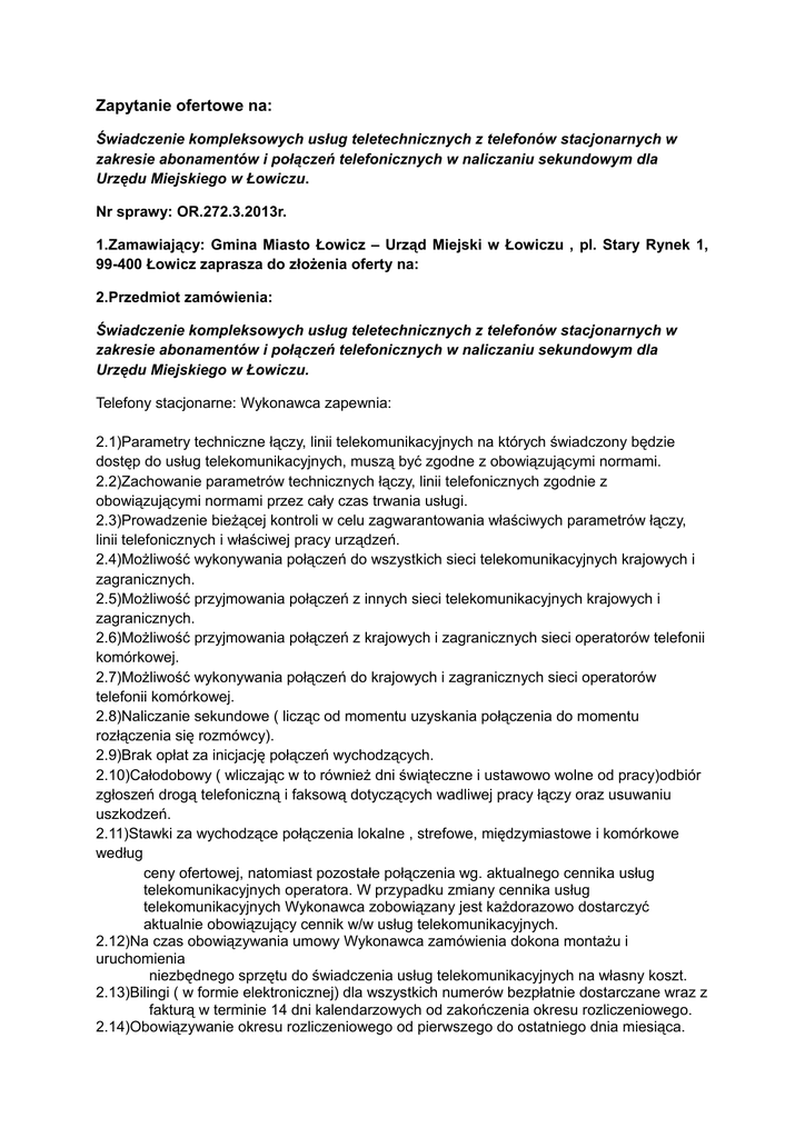 Zapytanie ofertowe na: Świadczenie kompleksowych usług teletechnicznych z telefonów stacjonarnych w zakresie abonamentów i połączeń telefonicznych w naliczaniu sekundowym dla Urzędu Miejskiego w Łowiczu. Nr sprawy: OR.272.3.2013r. 1.Zamawiający: Gmina Miasto Łowicz – Urząd Miejski w Łowiczu , pl. Stary Rynek 1, 99-400 Łowicz zaprasza do złożenia oferty na: 2.Przedmiot zamówienia: Świadczenie kompleksowych usług teletechnicznych z telefonów stacjonarnych w zakresie abonamentów i połączeń telefonicznych w naliczaniu sekundowym dla Urzędu Miejskiego w Łowiczu. Telefony stacjonarne: Wykonawca zapewnia: 2.1)Parametry techniczne łączy, linii telekomunikacyjnych na których świadczony będzie dostęp do usług telekomunikacyjnych, muszą być zgodne z obowiązującymi normami. 2.2)Zachowanie parametrów technicznych łączy, linii telefonicznych zgodnie z obowiązującymi normami przez cały czas trwania usługi. 2.3)Prowadzenie bieżącej kontroli w celu zagwarantowania właściwych parametrów łączy, linii telefonicznych i właściwej pracy urządzeń. 2.4)Możliwość wykonywania połączeń do wszystkich sieci telekomunikacyjnych krajowych i zagranicznych. 2.5)Możliwość przyjmowania połączeń z innych sieci telekomunikacyjnych krajowych i zagranicznych. 2.6)Możliwość przyjmowania połączeń z krajowych i zagranicznych sieci operatorów telefonii komórkowej. 2.7)Możliwość wykonywania połączeń do krajowych i zagranicznych sieci operatorów telefonii komórkowej. 2.8)Naliczanie sekundowe ( licząc od momentu uzyskania połączenia do momentu rozłączenia się rozmówcy). 2.9)Brak opłat za inicjację połączeń wychodzących. 2.10)Całodobowy ( wliczając w to również dni świąteczne i ustawowo wolne od pracy)odbiór zgłoszeń drogą telefoniczną i faksową dotyczących wadliwej pracy łączy oraz usuwaniu uszkodzeń. 2.11)Stawki za wychodzące połączenia lokalne , strefowe, międzymiastowe i komórkowe według ceny ofertowej, natomiast pozostałe połączenia wg. aktualnego cennika usług telekomunikacyjnych operatora. W przypadku zmiany cennika usług telekomunikacyjnych Wykonawca zobowiązany jest każdorazowo dostarczyć aktualnie obowiązujący cennik w/w usług telekomunikacyjnych. 2.12)Na czas obowiązywania umowy Wykonawca zamówienia dokona montażu i uruchomienia niezbędnego sprzętu do świadczenia usług telekomunikacyjnych na własny koszt. 2.13)Bilingi ( w formie elektronicznej) dla wszystkich numerów bezpłatnie dostarczane wraz z fakturą w terminie 14 dni kalendarzowych od zakończenia okresu rozliczeniowego. 2.14)Obowiązywanie okresu rozliczeniowego od pierwszego do ostatniego dnia miesiąca. 2.15)Identyfikacje numeru dzwoniącego i prezentacje numerów. 2.16)Zachowanie dotychczasowych numerów. 2.17)Ewentualne koszty związane z przenoszeniem numerów ponosi Wykonawca . 2.18)Posiadamy centralę software-ową Elastix, która obsługuje linię PRAE1 oraz protokoły VoIP takie jak SIP czy IAX2 oraz łącze internetowe o przepustowości 60/60 Mbit. Zakres numeracji PSTN 46 830 91 00 do 830 91 79 – operator NETIA SA, Zakres numeracji ISDN DDI 46 830 91 81 do 46 830 91 99 ( nr stacji 46 830 91 80). – operator TP SA. 2.19) Dotychczasowy Wykonawca NETIA SA – umowa na 24 m-ce. 2.20) Średni ruch z połączeń realizowanych przez Zamawiającego w okresie trwania umowy: - Połączenia lokalne 28 161 minut, -Połączenia międzymiastowe 34 851 minut. -Połączenia do sieci komórkowych 47 893 minuty. 2.21) Podana powyżej ilość minut jest szacowana i nie stanowi zobowiązania Zamawiającego do utrzymania podanej struktury ruchu w czasie realizacji umowy. 2.22) Dla pozostałych , nie wymienionych połączeń ( typu: biuro numerów, numery informacyjne, infolinie) Zamawiający wymaga podania cen zgodnie z cennikiem danego operatora, który będzie stanowił załącznik do oferty i umowy. 3.Czas trwania umowy 24 m-ce, od dn. 2.10.2013r do dn. 30.09.2015r. 4.Miejsce i sposób uzyskania zapytania ofertowego: www.lowicz.eu, 5.Miejsce lub sposób uzyskania informacji: Urząd Miejski w Łowiczu,99-400 Łowicz, pl. Stary Rynek 1, pokój nr 13 lub adres e-milowy: [email protected] i [email protected] 6.Kryteria wyboru ofert: najniższa cena ofertowa, 7.Wymagania, jakie powinni spełniać Wykonawcy zamówienia w zakresie dokumentów i oświadczeń: • oświadczenie posiadania uprawnień do wykonywania określonej działalności lub czynności, • • • jeżeli przepisy prawa nakładają obowiązek ich posiadania; oświadczenie posiadania wiedzy i doświadczenia; oświadczenie dysponowania odpowiednim potencjałem technicznym oraz osobami zdolnymi do wykonania zamówienia; oświadczenie o sytuacji ekonomicznej i finansowej 8.Opis sposobu obliczania ceny: W cenę oferty należy wliczyć wszystkie koszty wykonania zamówienia. Wykonawca jest zobowiązany do podania ceny netto usługi będącej przedmiotem zamówienia powiększonej o obowiązujący podatek VAT. Cena podana przez Wykonawcę za świadczoną usługę obowiązuje przez cały okres obowiązywania umowy i nie będzie podlegała waloryzacji. 9. Sposób przygotowania oferty: Ofertę należy sporządzić według załączonego formularza ofertowego ( załącznik nr 1), opisanej w następujący sposób: Nazwa i adres Zamawiającego, nazwa i adres Wykonawcy, z adnotacją : Zapytanie ofertowe nr sprawy……… do postepowania o udzielenie zamówienia publicznego na: Świadczenie kompleksowych usług teletechnicznych z telefonów stacjonarnych w zakresie abonamentów i połączeń telefonicznych w naliczaniu sekundowym dla Urzędu Miejskiego w Łowiczu. Do oferty należy załączyć poświadczone za zgodność z oryginałem przez osobę podpisującą ofertę następujące dokumenty: 1. Kserokopię ( skan) KRS lub wpisu do CEIDG, 2. Kserokopie ( skan) nadania numeru NIP, 3. Kserokopie ( skan) nadania numeru REGON, 4. Oświadczenie czy jesteście Państwo płatnikiem podatku VA