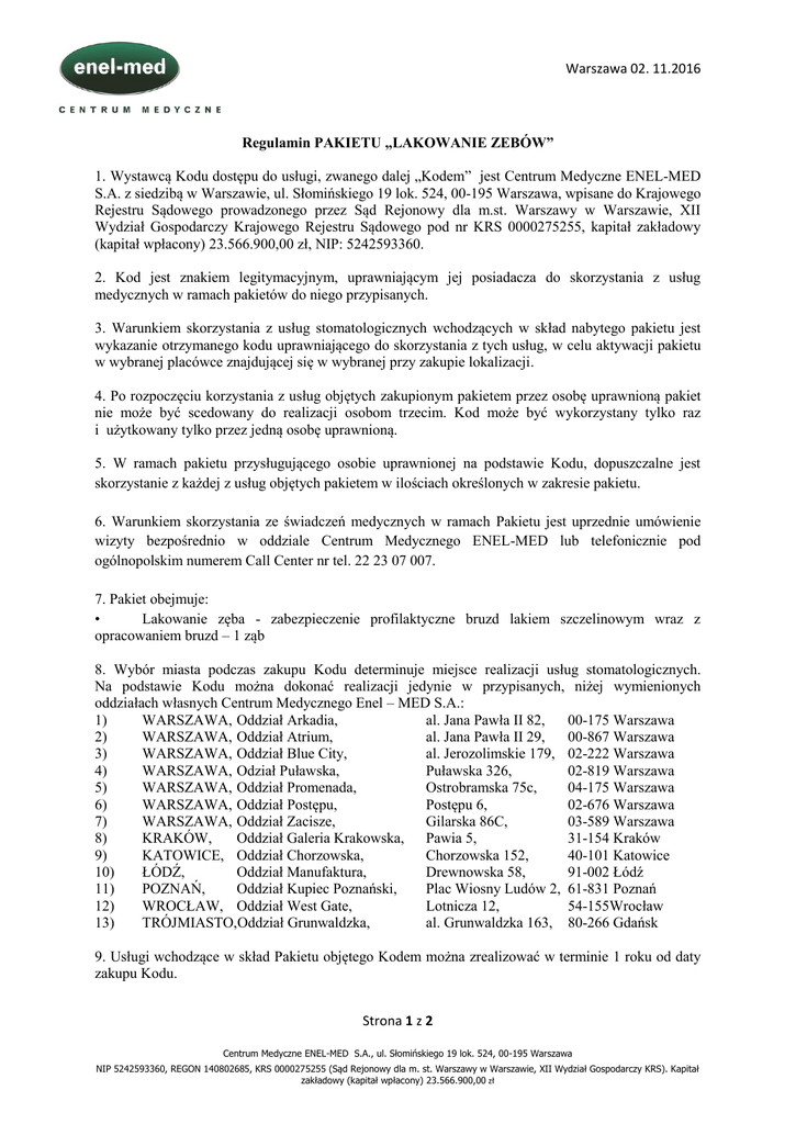 Warszawa 02. 11.2016 Regulamin PAKIETU „LAKOWANIE ZEBÓW” 1. Wystawcą Kodu dostępu do usługi, zwanego dalej „Kodem” jest Centrum Medyczne ENEL-MED S.A. z siedzibą w Warszawie, ul. Słomińskiego 19 lok. 524, 00-195 Warszawa, wpisane do Krajowego Rejestru Sądowego prowadzonego przez Sąd Rejonowy dla m.st. Warszawy w Warszawie, XII Wydział Gospodarczy Krajowego Rejestru Sądowego pod nr KRS 0000275255, kapitał zakładowy (kapitał wpłacony) 23.566.900,00 zł, NIP: 5242593360. 2. Kod jest znakiem legitymacyjnym, uprawniającym jej posiadacza do skorzystania z usług medycznych w ramach pakietów do niego przypisanych. 3. Warunkiem skorzystania z usług stomatologicznych wchodzących w skład nabytego pakietu jest wykazanie otrzymanego kodu uprawniającego do skorzystania z tych usług, w celu aktywacji pakietu w wybranej placówce znajdującej się w wybranej przy zakupie lokalizacji. 4. Po rozpoczęciu korzystania z usług objętych zakupionym pakietem przez osobę uprawnioną pakiet nie może być scedowany do realizacji osobom trzecim. Kod może być wykorzystany tylko raz i użytkowany tylko przez jedną osobę uprawnioną. 5. W ramach pakietu przysługującego osobie uprawnionej na podstawie Kodu, dopuszczalne jest skorzystanie z każdej z usług objętych pakietem w ilościach określonych w zakresie pakietu. 6. Warunkiem skorzystania ze świadczeń medycznych w ramach Pakietu jest uprzednie umówienie wizyty bezpośrednio w oddziale Centrum Medycznego ENEL-MED lub telefonicznie pod ogólnopolskim numerem Call Center nr tel. 22 23 07 007. 7. Pakiet obejmuje: • Lakowanie zęba - zabezpieczenie profilaktyczne bruzd lakiem szczelinowym wraz z opracowaniem bruzd – 1 ząb 8. Wybór miasta podczas zakupu Kodu determinuje miejsce realizacji usług stomatologicznych. Na podstawie Kodu można dokonać realizacji jedynie w przypisanych, niżej wymienionych oddziałach własnych Centrum Medycznego Enel – MED S.A.: 1) WARSZAWA, Oddział Arkadia, al. Jana Pawła II 82, 00-175 Warszawa 2) WARSZAWA, Oddział Atrium, al. Jana Pawła II 29, 00-867 Warszawa 3) WARSZAWA, Oddział Blue City, al. Jerozolimskie 179, 02-222 Warszawa 4) WARSZAWA, Odział Puławska, Puławska 326, 02-819 Warszawa 5) WARSZAWA, Oddział Promenada, Ostrobramska 75c, 04-175 Warszawa 6) WARSZAWA, Oddział Postępu, Postępu 6, 02-676 Warszawa 7) WARSZAWA, Oddział Zacisze, Gilarska 86C, 03-589 Warszawa 8) KRAKÓW, Oddział Galeria Krakowska, Pawia 5, 31-154 Kraków 9) KATOWICE, Oddział Chorzowska, Chorzowska 152, 40-101 Katowice 10) ŁÓDŹ, Oddział Manufaktura, Drewnowska 58, 91-002 Łódź 11) POZNAŃ, Oddział Kupiec Poznański, Plac Wiosny Ludów 2, 61-831 Poznań 12) WROCŁAW, Oddział West Gate, Lotnicza 12, 54-155Wrocław 13) TRÓJMIASTO,Oddział Grunwaldzka, al. Grunwaldzka 163, 80-266 Gdańsk 9. Usługi wchodzące w skład Pakietu objętego Kodem można zrealizować w terminie 1 roku od daty zakupu Kodu. Strona 1 z 2 Centrum Medyczne ENEL-MED S.A., ul. Słomińskiego 19 lok. 524, 00-195 Warszawa NIP 5242593360, REGON 140802685, KRS 0000275255 (Sąd Rejonowy dla m. st. Warszawy w Warszawie, XII Wydział Gospodarczy KRS). Kapitał zakładowy (kapitał wpłacony) 23.566.900,00 zł Warszawa 02. 11.2016 10. Rabaty związane z Kodem nie łączą się z innymi rabatami i promocjami udzielanymi przez Centrum Medyczne ENEL-MED. S.A. 11. Postanowienia niniejszego Regulaminu określające uprawnienia lub obowiązki Kupującego sprzecznie z prawami Konsumentów wynikającymi z powszechnie obowiązujących przepisów prawa lub też naruszające interesy konsumentów nie dotyczą Konsumentów. Strona 2 z 2 Centrum Medyczne ENEL-MED S.A., ul. Słomińskiego 19 lok. 524, 00-195 Warszawa NIP 5242593360, REGON 140802685, KRS 0000275255 (Sąd Rejonowy dla m. st. Warszawy w Warszawie, XII Wydział Gospodarczy KRS). Kapitał zakładowy (kapitał wpłacony) 23.566.900,00 zł