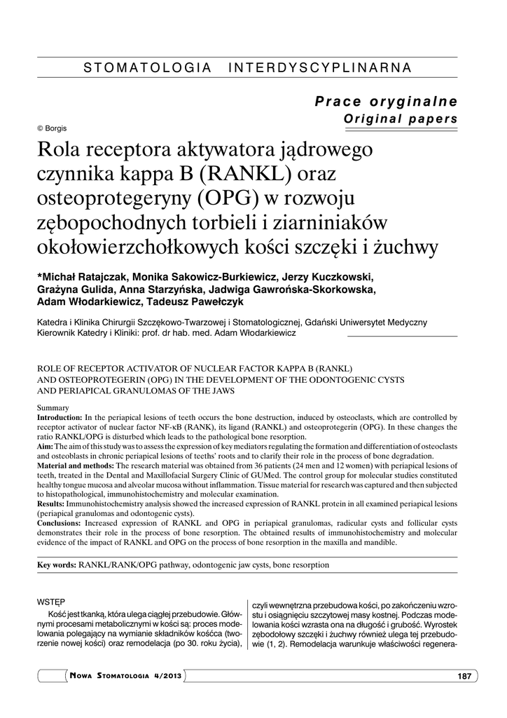 STOMATOLOGIA INTERDYSCYPLINARNA Prace oryginalne Original papers © Borgis Rola receptora aktywatora jądrowego czynnika kappa B (RANKL) oraz osteoprotegeryny (OPG) w rozwoju zębopochodnych torbieli i ziarniniaków okołowierzchołkowych kości szczęki i żuchwy *Michał Ratajczak, Monika Sakowicz-Burkiewicz, Jerzy Kuczkowski, Grażyna Gulida, Anna Starzyńska, Jadwiga Gawrońska-Skorkowska, Adam Włodarkiewicz, Tadeusz Pawełczyk Katedra i Klinika Chirurgii Szczękowo-Twarzowej i Stomatologicznej, Gdański Uniwersytet Medyczny Kierownik Katedry i Kliniki: prof. dr hab. med. Adam Włodarkiewicz Role of receptor activator of nuclear factor kappa B (RANKL) and osteoprotegerin (OPG) in the development of the odontogenic cysts and periapical granulomas of the jaws Summary Introduction: In the periapical lesions of teeth occurs the bone destruction, induced by osteoclasts, which are controlled by receptor activator of nuclear factor NF-κB (RANK), its ligand (RANKL) and osteoprotegerin (OPG). In these changes the ratio RANKL/OPG is disturbed which leads to the pathological bone resorption. Aim: The aim of this study was to assess the expression of key mediators regulating the formation and differentiation of osteoclasts and osteoblasts in chronic periapical lesions of teeths’ roots and to clarify their role in the process of bone degradation. Material and methods: The research material was obtained from 36 patients (24 men and 12 women) with periapical lesions of teeth, treated in the Dental and Maxillofacial Surgery Clinic of GUMed. The control group for molecular studies constituted healthy tongue mucosa and alveolar mucosa without inflammation. Tissue material for research was captured and then subjected to histopathological, immunohistochemistry and molecular examination. Results: Immunohistochemistry analysis showed the increased expression of RANKL protein in all examined periapical lesions (periapical granulomas and odontogenic cysts). Conclusions: Increased expression of RANKL and OPG in periapical granulomas, radicular cysts and follicular cysts demonstrates their role in the process of bone resorption. The obtained results of immunohistochemistry and molecular evidence of the impact of RANKL and OPG on the process of bone resorption in the maxilla and mandible. Key words: RANKL/RANK/OPG pathway, odontogenic jaw cysts, bone resorption Wstęp Kość jest tkanką, która ulega ciągłej przebudowie. Głównymi procesami metabolicznymi w kości są: proces modelowania polegający na wymianie składników kośćca (tworzenie nowej kości) oraz remodelacja (po 30. roku życia), N OWA S TOMATOLOGIA 4/2013 czyli wewnętrzna przebudowa kości, po zakończeniu wzrostu i osiągnięciu szczytowej masy kostnej. Podczas modelowania kości wzrasta ona na długość i grubość. Wyrostek zębodołowy szczęki i żuchwy również ulega tej przebudowie (1, 2). Remodelacja warunkuje właściwości regenera- 187 Michał Ratajczak i wsp. cyjne kości. Istotą procesów modelowania i remodelowania są następujące po sobie resorpcja i nawarstwianie kości (3). W warunkach fizjologicznych procesy te podlegają ścisłej kontroli, za którą odpowiada szlak RANKL/RANK/OPG. Elementami tego układu są: receptor aktywujący jądrowy czynnik NF-κB (ang. Receptor Activator of Nuclear Factor NF-κB – RANK), jego ligand RANK (ang. Receptor Activator of Nuclear Factor NF-κB Ligand – RANKL) oraz osteoprotegeryna (ang. Osteoprotegerin – OPG) (4, 5). RANKL należy do nadrodziny białek czynników martwicy nowotworów (ang. Tumor Necrosis Factor – TNF). Na poziom ekspresji RANKL wpływ mają cytokiny (IL-1α, IL-6, IL-11, TNF-α) i glikokortykosteroidy oraz komórki podścieliska, osteoblasty, osteoklasty, komórki mezenchymalne okostnej, chondrocyty i komórki śródbłonka (6). RANKL kontroluje różnicowanie osteoklastów poprzez specyficzny receptor znajdujący się na powierzchni komórek prekursorowych osteoklastów. Jest czynnikiem, który wraz z M-CSF (ang. Macrophage Colony-Stimulating Factor) aktywuje cały proces tworzenia dojrzałych osteoklastów, czyli różnicowanie i przeżywanie komórek resorpcyjnych (hamuje apoptozę osteoklastów). RANKL ponadto stymuluje uwalnianie niedojrzałych prekursorów osteoklastów (7). Receptor aktywujący jądrowy czynnik NF-κB jest białkiem przezbłonowym. Obecność RANK wykazują komórki linii monocytarno-makrofagowej, limfocyty T i B, proteosteoklasty i osteoblasty, komórki dendrytyczne, fibroblasty, chondrocyty i komórki śródbłonka naczyniowego. Ponadto obecność tego białka stwierdzono w szpiku kostnym, kościach, mózgu, wątrobie, sercu, nerkach, płucach, tkankach sutka, mięśniach szkieletowych i skórze (8-10). Połączenie RANK ze swym ligandem na powierzchni osteoklastów doprowadza do uruchomienia kaskady sygnałów, które aktywują swoiste geny odpowiadające za przeżycie i różnicowanie osteoklastów, a także za resorpcję kości (10). OPG należy do nadrodziny receptorów czynników martwicy nowotworów (ang. Tumor Necrosis Factor Receptor – TNFR) (3, 6, 11, 12). Transkrypty mRNA dla OPG stwierdzono w osteoblastach i komórkach podścieliska szpiku kostnego, a także w komórkach limfoidalnych, śródbłonka, limfocytach T i B oraz megakariocytach. OPG jest receptorem kompetycyjnym (ang. Decoy Receptor) dla RANKL, stanowi dla niego swoisty receptor-pułapkę (atrapę) (10). Łącząc się z nim, blokuje połączenie z RANK, tym samym zapobiega jego aktywacji na powierzchni osteoklasta i wystąpieniu resorpcji kości (11) poprzez modulację syntezy osteoklastów (10). W warunkach fizjologicznych istnieje ścisła równowaga pomiędzy ilością białka RANKL i OPG. Równowaga ta może zostać zaburzona w wielu chorobach układu kostnego. Wśród chorób kości szczęki i żuchwy często występują zmiany okołowierzchołkowe o charakterze zapalnym rozwijające się na skutek infekcji bakteryjnej kanałów korzeniowych. Prz