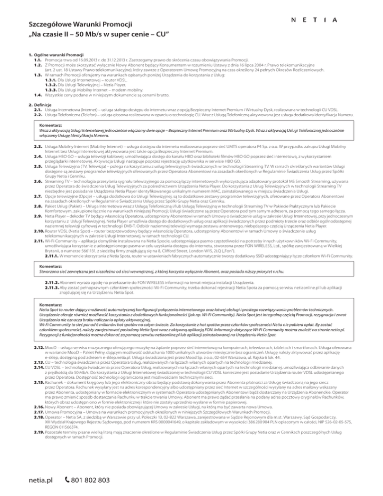 Szczegółowe Warunki Promocji „Na czasie II – 50 Mb/s w super cenie – CU” 1. Ogólne warunki Promocji 1.1. Promocja trwa od 16.09.2013 r. do 31.12.2013 r. Zastrzegamy prawo do skrócenia czasu obowiązywania Promocji. 1.2.Z Promocji może skorzystać wyłącznie Nowy Abonent będący Konsumentem w rozumieniu Ustawy z dnia 16 lipca 2004 r. Prawo telekomunikacyjne (art. 2 ust. 18 Ustawy Prawo telekomunikacyjne), który zawrze z Operatorem Umowę Promocyjną na czas określony 24 pełnych Okresów Rozliczeniowych. 1.3.W ramach Promocji oferujemy na warunkach opisanych poniżej Urządzenia do korzystania z Usług: 1.3.1.Dla Usługi Internetowej – router VDSL. 1.3.2.Dla Usługi Telewizyjnej – Netia Player. 1.3.3.Dla Usługi Mobilny Internet – modem mobilny. 1.4. Wszystkie ceny podane w niniejszym dokumencie są cenami brutto. 2.Definicje 2.1.Usługa Internetowa (Internet) – usługa stałego dostępu do internetu wraz z opcją Bezpieczny Internet Premium i Wirtualny Dysk, realizowana w technologii CU VDSL. 2.2.Usługa Telefoniczna (Telefon) – usługa głosowa realizowana w oparciu o technologię CU. Wraz z Usługą Telefoniczną aktywowana jest usługa dodatkowa Identyfikacja Numeru. Komentarz: Wraz z aktywacją Usługi Internetowej jednocześnie włączamy dwie opcje – Bezpieczny Internet Premium oraz Wirtualny Dysk. Wraz z aktywacją Usługi Telefonicznej jednocześnie włączamy Usługę Identyfikacja Numeru. 2.3.Usługa Mobilny Internet (Mobilny Internet) – usługa dostępu do internetu realizowana poprzez sieć UMTS operatora P4 Sp. z o.o. W przypadku zakupu Usługi Mobilny Internet bez Usługi Internetowej aktywowana jest także opcja Bezpieczny Internet Premium. 2.4.Usługa HBO GO – usługa telewizji kablowej, umożliwiająca dostęp do kanału HBO oraz biblioteki filmów HBO GO poprzez sieć internetową, z wykorzystaniem przeglądarki internetowej. Aktywacja Usługi następuje poprzez rejestrację użytkownika w serwisie HBO GO. 2.5.Usługa Telewizyjna (TV, Telewizja) – polega na korzystaniu z usług telewizyjnych świadczonych w technologii Streaming TV. W ramach określonych wariantów Usługi dostępne są zestawy programów telewizyjnych oferowanych przez Operatora Abonentowi na zasadach określonych w Regulaminie Świadczenia Usług przez Spółki Grupy Netia i Cenniku. 2.6.Streaming TV – technologia przesyłania sygnału telewizyjnego za pomocą łączy internetowych wykorzystująca adaptowany protokół MS Smooth Streaming, używana przez Operatora do świadczenia Usług Telewizyjnych za pośrednictwem Urządzenia Netia Player. Do korzystania z Usług Telewizyjnych w technologii Streaming TV niezbędne jest posiadanie Urządzenia Netia Player identyfikowanego unikalnym numerem MAC, zainstalowanego w miejscu świadczenia Usługi. 2.7.Opcje telewizyjne (Opcje) – usługa dodatkowa do Usługi Telewizyjnej, są to dodatkowe zestawy programów telewizyjnych, oferowane przez Operatora Abonentowi na zasadach określonych w Regulaminie Świadczenia Usług przez Spółki Grupy Netia oraz Cenniku. 2.8.Pakiet Usług (Pakiet) – Usługa Internetowa wraz z Usługą Telefoniczną i/lub Usługą Telewizyjną w technologii Streaming TV w Pakiecie Praktycznym lub Pakiecie Komfortowym, zakupione łącznie na warunkach niniejszej Promocji; Usługi świadczone są przez Operatora pod tym samym adresem, za pomocą tego samego łącza. 2.9.Netia Player – dekoder TV będący własnością Operatora, udostępniony Abonentowi w ramach Umowy o świadczenie usług w zakresie Usługi Internetowej, przy jednoczesnym korzystaniu z Usługi Telewizyjnej. Netia Player umożliwia dostęp do dodatkowych usług oraz aplikacji świadczonych przez podmioty trzecie oraz odbiór ogólnodostępnej naziemnej telewizji cyfrowej w technologii DVB-T. Odbiór naziemnej telewizji wymaga zestawu antenowego, niebędącego częścią Urządzenia Netia Player. 2.10.Router VDSL (Netia Spot) – router bezprzewodowy będący własnością Operatora, udostępniony Abonentowi w ramach Umowy o świadczenie usług telekomunikacyjnych w zakresie Usługi Internetowej, w ramach technologii CU. 2.11.Wi-Fi Community – aplikacja domyślnie instalowana na Netia Spocie, udostępniająca pasmo częstotliwości na potrzeby innych użytkowników Wi-Fi Community, umożliwiająca korzystanie z udostępnionego pasma w celu uzyskania dostępu do internetu, stworzona przez FON WIRELESS, Ltd., spółkę zarejestrowaną w Wielkiej Brytanii, o numerze 5661131, z siedzibą firmy znajdującą się na 8, Clifford Street, London W1S, 2LQ („Fon”). 2.11.1.W momencie skorzystania z Netia Spota, router w ustawieniach fabrycznych automatycznie tworzy dodatkowy SSID udostępniający łącze członkom Wi-Fi Community. Komentarz: Stworzona sieć zewnętrzna jest niezależna od sieci wewnętrznej, z której korzysta wyłącznie Abonent, oraz posiada niższy priorytet ruchu. 2.11.2.Abonent wyraża zgodę na przekazanie do FON WIRELESS informacji na temat miejsca instalacji Urządzenia. 2.11.3.Aby zostać pełnoprawnym członkiem społeczności Wi-Fi Community, trzeba dokonać rejestracji Netia Spota za pomocą serwisu netiaonline.pl lub aplikacji znajdującej się na Urządzeniu Netia Spot. Komentarz: Netia Spot to router dający możliwość automatycznej konfiguracji połączenia internetowego oraz łatwej obsługi i prostego rozwiązywania problemów technicznych. Urządzenie oferuje również możliwość korzystania z dodatkowych funkcjonalności (jak np. Wi-Fi Community). Netia Spot jest integralną częścią Promocji, rezygnacja i zwrot Urządzenia nie oznacza braku naliczania opłaty aktywacyjnej. Wi-Fi Community to sieć ponad 6 milionów hot spotów na całym świecie. Za korzystanie z hot spotów przez członków społeczności Netia nie pobiera opłat. By zostać członkiem społeczności, należy zarejestrować posiadany Netia Spot wraz z aktywną aplikacją FON. Informacje dotyczące Wi-Fi Community można znale