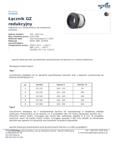 Kod strony: XC320181 Łącznik GZ redukcyjny Połączenie rur o róznej średnicy lub ustawionych nieosiowo Zakres średnic: Max ciśnienie pracy: Materiał stali: Materiał uszczelniający: Temperatura pracy: - 100 - 2640 mm 0,025 MPa Stal kwasoodporna 1.4307 EPDM, NBR, SILIKON EPDM (-30°C - +100°C) NBR (-20°C - +90°C) SILIKON (-55°C do +230°C) Łącznik redukcyjny jest uszczelnieniem przeznaczonym do łączenia rur o różnych średnicach. Występuje w dwóch typach: Typ I Uszczelnienie składające sie ze specjalnie wyprofilowanej manszety wraz z opaskami, przeznaczone do łączenia standardowych rur. Lp. Symbol Zakres A: Wymiar B: 1 GZ 110 100 - 110 90 2 GZ 220 201 - 220 200 3 GZ 240 236 - 245 200 4 GZ 260 246 - 265 200 5 GZ 280 266 - 290 242 Typ II Uszczelnienie składające się z standardowego łącznika GZ wyposażonego w dodatkową wkładkę redukcyjną. Przeznaczone są do łączenia rur w przypadach gdy nie można zastosować łącznika typ I. Miniamlna różnica średnic rurociągów aby można było zastosować wkładkę to 8 mm. W przypadku znacznych róznic lub bardzo dużych średnic rurociągów (powyżej fi 800 mm) wkładki są wzmacniane blachami aby zapewnić ich sztywność oraz szczelność na łączeniu segmentów. Łączniki redukcyjne przeznaczone są do łączenia bosych końców rur w kilku przypadkach: Integra Gliwice 1. Rury mają różną średnicę, ale są ustawione osiowo - łącznik redukcyjny, ul.Metalowców 26 44-100 Gliwice NIP 631-00-14-241 tel. +48 (32) 2345 954 E-mail:[email protected] 2. Rury mają różną lub taką samą średnicę lecz są ustawione nie osiowo - łącznik mimośrodowy, 3. Łączymy kilka mniejszych rur z jedną większą - trójnik GZ. Jak zamawiać: Aby poprawnie zamówić uszczelnienie wymagane są następujące informacje: ● Średnice rur oraz ich wzajemne położenie. Integra Gliwice ul.Metalowców 26 44-100 Gliwice NIP 631-00-14-241 tel. +48 (32) 2345 954 E-mail:[email protected]