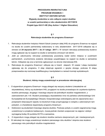PROCEDURA REKRUTACYJNA PROGRAM ERASMUS + INSTYTUT HISTORII SZTUKI Wyjazdy studentów w celu odbycia części studiów w uczelni partnerskiej w roku akademickim 2017/2018 Projekt typu KA1/1-HE (Key Action 1 Higher Education) §1 Rekrutacja studentów do programu Erasmus+ 1. Rekrutacja studentów Instytutu Historii Sztuki (zwanym dalej IHS) do programu Erasmus na wyjazd na studia do uczelni partnerskiej realizowany w roku akademickim 2017-2018 odbędzie się w okresie od 24 stycznia 2017 r. do 21 lutego 2017 r. W ramach rekrutacji podstawowej studenci mogą zgłaszać się na wyjazd na studia w semestrze zimowym lub letnim. 2. Jeśli po zakończeniu rekrutacji podstawowej pozostaną nadal wolne miejsca w uczelniach partnerskich, uruchomiona zostanie rekrutacja uzupełniająca na wyjazd na studia w semestrze letnim. Odbędzie się ona w terminie ogłoszonym na stronie internetowej IHS. 3. Rekrutacja do programu Erasmus+ odbywa się w trzech etapach. W czasie I etapu kandydaci zgłaszają się do programu, II etap obejmuje egzamin z języka obcego, podczas III etapu przeprowadza się rozmowę kwalifikacyjną z kandydatami w ramach komisji wydziałowych. §2 Studenci, którzy mogą uczestniczyć w procedurze rekrutacyjnej 1. O stypendium programu Erasmus+ mogą ubiegać się wszyscy studenci (niezależnie od obywatelstwa), którzy są studentami IHS, przyjętymi na studia prowadzące do uzyskania dyplomu studiów pierwszego, drugiego i trzeciego stopnia lub jednolitych studiów magisterskich, z zastrzeżeniem pkt. 4-8. Student posiadający obywatelstwo inne niż państwa członkowskiego Unii Europejskiej lub Europejskiego Obszaru Gospodarczego zobowiązany jest do zapoznania się z przepisami dotyczącymi wjazdu na terytorium kraju przyjmującego w związku z planowanym tam pobytem, w charakterze stypendysty programu Erasmus+. 2. Doktoranci są studentami trzeciego stopnia studiów. Podczas pobytu w uczelni zagranicznej mogą uczestniczyć w projekcie badawczym, muszą jednak również uczęszczać na zajęcia i zdobyć wymaganą liczbę 30 punktów ECTS w semestrze. 3. O stypendium mogą ubiegać się studenci studiów zarówno stacjonarnych, jak i niestacjonarnych. 4. W rekrutacji nie mogą uczestniczyć studenci pierwszego roku studiów I stopnia oraz studenci pierwszego roku jednolitych studiów magisterskich. 1 5. W rekrutacji mogą uczestniczyć studenci trzeciego roku studiów I stopnia, pod warunkiem udokumentowania przed wyjazdem, że zostali przyjęci przez UKSW na studia II stopnia. Wskazane jest, aby studenci ci byli rekrutowani na wyjazdy, mające nastąpić w semestrze letnim pierwszego roku studiów II stopnia. 6. W rekrutacji nie mogą uczestniczyć studenci ostatniego roku studiów II stopnia, ostatniego roku jednolitych studiów magisterskich oraz ostatniego roku studiów doktoranckich. 7. Stypendium nie może być przyznane słuchaczowi studiów podyplomowych. 8. Do rekrutacji na realizację części toku studiów nie mogą przystąpić studenci, którzy nie rozliczyli się z wyjazdu w celu odbycia części studiów lub na praktyki w ramach Programu LLP-Erasmus oraz Programu Erasmus+, za wyjątkiem wyjazdów, które aktualnie trwają. §3 I Etap - Rejestracja kandydatów on-line 1. Kandydaci do Programu Erasmus – wyjazd na studia – rejestrują się on-line w systemie USOSweb (https://usosweb.uksw.edu.pl) w dniach 24.01.2017 – 21.02.2017 (do godz. 23.59) w ramach rekrutacji podstawowej W ramach rekrutacji uzupełniającej, terminy zostaną ogłoszone na stronie internetowej Instytutu Historii Sztuki, jeśli rekrutacja zostanie uruchomiona. 2. Wniosek on-line w systemie USOSweb składa się z następujących obowiązkowych części: 2.1. Wybór uczelni partnerskiej. Student wybiera tylko jedną uczelnię spośród uczelni partnerskich dostępnych w aktywnej rekrutacji. 2.2. Deklaracja poziomu znajomości języków obcych. Obowiązkowo należy określić poziom znajomości języka wykładowego w uczelni partnerskiej. 2.3. Wybór zrealizowanych przedmiotów obcojęzycznych wliczonych w tok studiów danego studenta na UKSW. 2.4. Opinia pracownika UKSW o kandydacie składającym aplikację. 2.4.1. Pracownik opiniuje kandydata, logując się na swoim profilu w systemie USOSweb (instrukcja dostępna na stronie internetowej Instytutu Historii Sztuki oraz Działu Współpracy Międzynarodowej UKSW zwanego dalej DWM). 2.4.2. Studenci trzeciego roku studiów licencjackich, drugiego roku uzupełniających studiów magisterskich oraz piątego roku jednolitych studiów magisterskich obowiązkowo zwracają się z prośbą o opinię do swego promotora, studenci młodszych lat, jeżeli uczestniczą w proseminarium magisterskim, obowiązkowo zwracają się z prośbą o opinię do osoby prowadzącej proseminarium. W innym przypadku student musi zwrócić się z prośbą o opinię do nauczyciela akademickiego z kierunku macierzystego UKSW, legitymującego się co najmniej tytułem doktora. 2.4.3. Opinii nie może wystawić koordynator wydziałowy/instytutowy ds. Programu Erasmus. 2.5. CV w języku polskim (maksimum jedna strona). 2.6. CV w języku obcym (maksimum jedna strona). 2.7. List motywacyjny w języku polskim. 2 3. Uzupełnienie pól: „List motywacyjny w języku obcym”, „Staże zagraniczne” oraz „Inne doświadczenia” jest nieobowiązkowe. 4. Złożenie wniosku jest jednoznaczne ze złożeniem deklaracji o zapoznaniu się i akceptacji procedury rekrutacyjnej pt. „PROGRAM ERASMUS – INSTYTUT HISTORII SZTUKI. Wyjazdy studentów w celu odbycia części studiów w uczelni partnerskiej w roku akademickim 2017/2018 zamieszczonej na stronie internetowej Instytutu Historii Sztuki oraz Ogólnych zasad wstępnej kwalifikacji studentów i doktorantów na stypendium Erasmus+ (typu ka1/1-he) i skierowania na zagraniczne studia częściowe, Mobilność Edukacyjna – rok akademicki 2017/2018 zamieszczonej na stronie internetowej DWM (www.dwm.uksw.edu.pl). Informacje zawarte w obu 