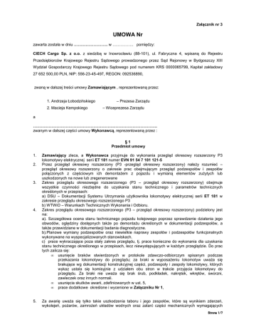 Załącznik nr 3 UMOWA Nr zawarta została w dniu …………………….. w ……………. pomiędzy: CIECH Cargo Sp. z o.o. z siedzibą w Inowrocławiu (88-101), ul. Fabryczna 4, wpisaną do Rejestru Przedsiębiorców Krajowego Rejestru Sądowego prowadzonego przez Sąd Rejonowy w Bydgoszczy XIII Wydział Gospodarczy Krajowego Rejestru Sądowego pod numerem KRS 0000065799, Kapitał zakładowy 27 652 500,00 PLN, NIP: 556-23-45-497, REGON: 092536890, zwaną w dalszej treści umowy Zamawiającym , reprezentowaną przez: 1. Andrzeja Łobodzińskiego 2. Macieja Kempskiego – Prezesa Zarządu – Wiceprezesa Zarządu a ………………………………………………………………………………….. zwanym w dalszej części umowy Wykonawcą, reprezentowaną przez : §1 Przedmiot umowy 1. 2. 3. 4. 5. Zamawiający zleca, a Wykonawca przyjmuje do wykonania przegląd okresowy rozszerzony P3 lokomotywy elektrycznej serii ET 181 numer EVN 91 54 7 181 121-5 Przez przegląd okresowy rozszerzony (P3 -przegląd okresowy rozszerzony) należy rozumieć – przegląd okresowy rozszerzony o zakresie prac obejmującym przegląd podzespołów i zespołów połączonych z częściowym ich demontażem z pojazdu i wymianą elementów zużytych lub uszkodzonych na nowe lub zregenerowane Zakres przeglądu okresowego rozszerzonego (P3 – przegląd okresowy rozszerzony) obejmuje wszystkie czynności niezbędne do uzyskania stanu technicznego i parametrów technicznych określonych w przepisach: a) DSU – Dokumentacji Systemu Utrzymania użytkownika lokomotywy elektrycznej serii ET 181 w zakresie przeglądu okresowego rozszerzonego P3 b) WTWiO – Warunkach Technicznych Wykonania i Odbioru. Zakres przeglądu okresowego rozszerzonego (P3 – przegląd okresowy rozszerzony) podzielony jest na: a). Szczegółowa ocena stanu technicznego pojazdu kolejowego poprzez sprawdzenie działania jego obwodów, oględziny dostępnych także po demontażu określonych w dokumentacji podzespołów, a także przewidziane w dokumentacji badania diagnostyczne. b).Planowe wymiany podzespołów oraz niewielkie naprawy zespołów i podzespołów funkcjonalnych wykonywane na wyspecjalizowanych stanowiskach. c) prace wykraczające poza stały zakres przeglądu, tj. prace konieczne do wykonania dla uzyskania stanu technicznego określonego w przepisach, lecz niewystępujących w każdym przeglądzie. Do prac tych zalicza się: • usunięcie braków stwierdzonych w protokole zdawczo-odbiorczym spisanym podczas przekazania lokomotywy do przeglądu; za braki w wyposażeniu lokomotyw uważa się brakujące wg dokumentacji konstrukcyjnej części, podzespoły i zespoły lokomotywy, których wykaz ustala się komisyjnie z udziałem obu stron w trakcie przyjęcia lokomotywy do przeglądu. Za braki nie uważa się brak śrub, podkładek, nakrętek, wkrętów, sworzni, zawleczek oraz innych normali. • usunięcia skutków awarii, zdefiniowanych w ust. 5, • prace dodatkowe określone i wycenione w Załączniku Nr 1, Za awarię uważa się tylko takie uszkodzenia taboru i jego zespołów, które są wynikiem zderzeń, wykolejeń, pożarów, zamrożeń układów wodnych oraz zatarć części mechanicznych wymagających Strona 1/7 ciągłego smarowania w trakcie eksploatacji, a spowodowanych brakiem czynników smarnych, a także zmiany konstrukcyjne wprowadzone bez dokumentacji zatwierdzonej do stosowania przez właściwe jednostki dopuszczające wymienione w rozporządzeniu do ustawy o Transporcie Kolejowym lub Zamawiającego oraz uszkodzenia o charakterze nagłym spowodowane wadami ukrytymi materiału lub nadmiernej korozji, niemożliwe do zdiagnozowania podczas przyjęcia lokomotywy do przeglądu. Zamawiający przekaże Wykonawcy dokumentację w zakresie wprowadzonych zmian na lokomotywie. 6. Wykonawca w całości samodzielnie wykona cały zakres prac objętych niniejszą Umową. Dopuszcza się regenerację podzespołów u Podwykonawców, za co Wykonawca przejmuje wobec Zamawiającego pełną odpowiedzialność. 7. Na prace wykraczające poza stały zakres przeglądu Zamawiający wystawi dodatkowe zamówienia zgodnie z Załącznikiem Nr 1. 8. W przypadku stwierdzenia przez Wykonawcę potrzeby wykonania prac dodatkowych wychodzących poza stały zakres zobowiązany jest niezwłocznie poinformować na piśmie/faxem lub droga elektroniczna na adres [email protected] o tym Zamawiającego, a Strony sporządzą protokół, który będzie podstawą do ostatecznego rozliczenia za wykonany przegląd lokomotywy. Wykonanie prac dodatkowych Zamawiający uzgadnia z Wykonawcą w ciągu siedmiu dni kalendarzowych od powiadomienia, o którym mowa wyżej. W przypadku niedotrzymania terminu uzgodnień czas postoju lokomotywy wydłuża się o czas liczony od ósmego dnia od daty zgłoszenia. 9. Zamawiający zobowiązany jest do odpowiedniego zorganizowania transportu lokomotywy do naprawy do Wykonawcy i po wykonanej naprawie zwrotnie do Zamawiającego. 10. Zamawiający zobowiązany jest przygotować lokomotywę do transportu w zakresie umożliwiającym jej transport w stanie hamownym ( sprawny układ hamulca ) 11. Koszt konwojowania lokomotywy do naprawy do Wykonawcy i po wykonanej naprawie do Zamawiającego ponosi Zamawiający, koszt pierwszej jazdy próbnej ponosi Wykonawca, w przypadku konieczności powtórzenia jazdy próbnej luzem ze względu na powstałe z winy Wykonawcy nieprawidłowości stwierdzone podczas pierwszej jazdy próbnej luzem, koszty następnych jazd próbnych luzem są ponoszone przez Wykonawcę. 12. Wszystkie prace wynikłe podczas przeglądu lokomotywy, które nie są objęte stałym zakresem prac będą każdorazowo uzgadniane z Zamawiającym. §2 Termin realizacji przedmiotu Umowy 1. 2. 3. Przekazanie lokomotywy do przeglądu przez Zamawiającego nastąpi na terenie Wykonawcy na podstawie protokołu zdawczo-odbiorczego, który powinien zawierać datę przekazania lokomotywy.(załącznik nr 2) Termin realizacji przedmi