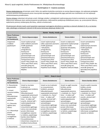 Klasa 6, Język angielski, Szkoła Podstawowa Im. Władysława Broniewskiego World Explorer 3 – kryteria oceniania Ocenę niedostateczną otrzymuje uczeo, który nie spełnia kryteriów oceniania na ocenę dopuszczającą, nie wykazuje postępów w nauce pomimo dostosowania przez nauczyciela wymagao edukacyjnychdo jego potrzeb oraz możliwości ani nie wykazuje zainteresowania przedmiotem. Ocenę celującą natomiast otrzymuje uczeo, którego wiedza i umiejętności wykraczają poza kryteria oceniania na ocenę bardzo dobrą oraz wykazuje duże zainteresowanie przedmiotem, dobrowolnie podejmuje dodatkowe prace, np. przeczytanie lektury, wykonanie pomocy edukacyjnej dla klasy, udział w konkursach. W pierwszym okresie nauki uczeo powinien opanowad wymagania określone w poniżej w czterech działach (1-4), a na koniec roku szkolnego w kolejnych czterech (4-8) ocena koocowa obejmuje działy (1-8). Starter Ready, steady, go! Nowa Podstawa Programowa. Cel kształcenia Znajomośd środków językowych Ocena dopuszczająca Uczeo wykorzystuje tylko niektóre poznane środki językowe –leksykalne, ortograficzne, fonetyczne i gramatyczne (presentsimple and presentcontinuous; Comparisons;How much? Past simple: be; There was/There were; must;Be going to). Popełnia bardzo dużo błędów. Ocena dostateczna Ocena dobra Uczeo wykorzystuje tylko częściowo poznane środki językowe –leksykalne, ortograficzne, fonetyczne i gramatyczne (presentsimple and presentcontinuous; Comparisons;How much? Past simple: be; There was/There were; must;Be going to). Popełnia liczne błędy. Uczeo w większości poprawnie wykorzystuje poznane środki językowe leksykalne, ortograficzne, fonetyczne i gramatyczne (presentsimple and presentcontinuous; Comparisons;How much? Past simple: be; There was/There were; must;Be going to). Popełnia nieliczne błędy. Unit 1 Nowa Podstawa Programowa. Cel kształcenia II. Rozumienie wypowiedzi. 3. Uczeo rozumie krótkie, proste kilkuzdaniowe wypowiedzi pisemne. 3.1. Rozumie ogólny sens tekstu. 3.2. Wyszukuje proste informacje szczegółowe w tekście. II. Rozumienie Ocena dopuszczająca Ocena bardzo dobra Uczeo samodzielnie i poprawnie wykorzystuje poznane środki językowe –leksykalne, ortograficzne, fonetyczne i gramatyczne (presentsimple and presentcontinuous; Comparisons;How much? Past simple: be; There was/There were; must;Be going to). Sporadycznie popełnia błędy. Keep in touch Ocena dostateczna Ocena dobra Ocena bardzo dobra Uczeo w ma duże trudności ze zrozumieniem krótkich, prostych kilkuzdaniowych wypowiedzi pisemnych z rozdziału 1a „Teens’ time – A video call” oraz1b „Animal talk”; wykonujepolecenia sprawdzające zrozumienie ogólnego sensu oraz wyszukuje proste informacje szczegółowe zawarte w tekście, popełniając bardzo dużo błędów. Zna podstawowe słownictwo związane ze środkami komunikacji. Uczeo w ma trudności ze zrozumieniem krótkich, prostych kilkuzdaniowych wypowiedzi pisemnych z rozdziału 1a „Teens’ time – A video call” oraz1b „Animal talk”; wykonujepolecenia sprawdzające zrozumienie ogólnego sensu oraz wyszukuje proste informacje szczegółowe zawarte w tekście, popełniając liczne błędy. Uczeo na ogół rozumie krótkie, proste kilkuzdaniowe wypowiedzi pisemne z rozdziału 1a „Teens’ time – A video call” oraz1b „Animal talk”; wykonujepolecenia sprawdzające zrozumienie ogólnego sensu oraz wyszukuje proste informacje szczegółowe zawarte w tekście, popełniając nieliczne błędy. Uczeo w pełni rozumie krótkie, proste kilkuzdaniowe wypowiedzi pisemne z rozdziału 1a „Teens’ time – A video call” oraz1b „Animal talk”; bezbłędnie wykonujepolecenia sprawdzające zrozumienie ogólnego sensu oraz bezbłędnie wyszukuje proste informacje szczegółowe zawarte w tekście. Uczeo ma duże Uczeo ma trudności ze Uczeo rozumie ogólny Uczeo w pełni rozumie Klasa 6, Język angielski, Szkoła Podstawowa Im. Władysława Broniewskiego wypowiedzi. 2.3. Rozumie ogólny sens tekstu słuchanego. 2.4. Wyszukuje proste informacje szczegółowe zawarte w tekście słuchanym. trudności ze zrozumieniem tekstów słuchanych z rozdziału pierwszego i łączeniemobrazków zrozmówcami, popełnia bardzo dużo błędów,uzupełniając dialogi oraz rozpoznając intencje rozmówców na podstawie dialogów. zrozumieniem tekstów słuchanych z rozdziału pierwszego i łączeniemobrazków zrozmówcami, popełnia liczne błędy,uzupełniając dialogi oraz rozpoznając intencje rozmówców na podstawie dialogów. sens tekstów słuchanych z rozdziału pierwszego i bezbłędniełączy obrazki zrozmówcami, uzupełnia dialogi oraz rozpoznaje intencje rozmówców na podstawie dialogów, popełniając nieliczne błędy. ogólny sens tekstów słuchanych z rozdziału pierwszego i bezbłędniełączy obrazki zrozmówcami, uzupełnia dialogi oraz rozpoznaje intencje rozmówców na podstawie dialogów. Uczeo potrzebuje dużego wsparcia przy tworzeniu dialogu, popełnia liczne błędy wpływające znacząco na zrozumienie tekstu. Zamieszcza tylko niektóre potrzebne informacje. Uczeo potrzebuje wsparcia nauczyciela, tworząc tekst dialogu, popełnia przy tym liczne błędy wpływające na zrozumienie wypowiedzi. Zamieszcza połowę potrzebnych informacji. Uczeo pisze tekst samodzielnie, przedstawia rozmówcę, wymienia przedmioty, które planuje zakupid, oraz jak i o której godzinie zamierza dostad się do sklepu, zachowując formę dialogu i popełniając błędy niewpływające na zrozumienie wypowiedzi. Uczeo pisze tekst samodzielnie, przedstawia rozmówcę, wymienia przedmioty, które planuje zakupid, oraz jak i o której godzinie zamierza dostad się do sklepu, zachowując formę dialogu i sporadycznie popełniając błędy. Uczeo wykorzystuje tylko niektóre poznane środki językowe –leksykalne, ortograficzne, fonetyczne i gramatyczne (present simple, present continuous, stative verbs, have to/don’t h
