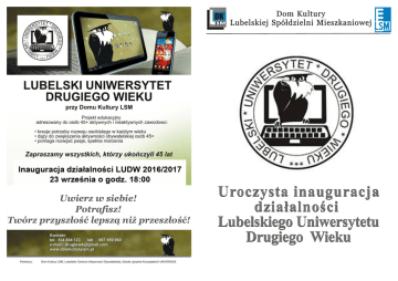 Dom Kultury Lubelskiej Spółdzielni Mieszkaniowej Uwierz w siebie! Potrafisz! Twórz przyszłość lepszą niż przeszłość! U ro c z y s t a i n a u g u r a c j a działalności Lubelskiego Uniwersytetu Drugiego Wieku Lubelski Uniwersytet Drugiego Wieku Dom Kultury Lubelskiej Spółdzielni Mieszkaniowej Zapisy w dniach 516 września od poniedziałku do piątku w godz. 16:0018:30 w Domu Kultury LSM LUBELSKI UNIWERSYTET DRUGIEGO WIEKU to projekt edukacyjny skierowany do osób dojrzałych, w wieku 45+, aktywnych i nieaktywnych zawodowo. Do dyspozycji uczestników są trzy rodzaje zajęć: edukacja, integracja oraz zdrowie i rekreacja /każde z nich odbywa się raz w tygodniu/. LUBELSKI UNIWERSYTET DRUGIEGO WIEKU: kreuje potrzeby rozwoju osobistego w każdym wieku, dąży do zwiększenia aktywności obywatelskiej osób 45+, stwarza szansę szybkiego opanowania języków obcych / j. angielski, j. włoski/ w oparciu o autorskie programy lektora, w przyjaznej atmosferze, w gronie rówieśników, pomaga dogonić świat nowych technologii, pogłębić wiedzę z dziedziny prawa,psychologii pozytywnej, profilaktyki prozdrowotnej, współpracuje z instytucjami kultury zapewniając swoim członkom aktywne uczestnictwo w życiu kulturalnym. EDUKACJA język angielski język włoski zarządzanie finansami prawo na co dzień literatura wiedza o świecie zasady funkcjonowania społeczeń stwa obywatelskiego psychologia ZDROWIE I REKREACJA cykl: „Drogi do zdrowia” gimnastyka przy muzyce spacery po zdrowie/z trenerem/ INTEGRACJA KLUB KADR 45+ kreatywni, aktywni, dojrzali, ra dośni Tu: ciekawie spędzisz czas, znajdziesz bratnia duszę rozwiniesz swoje zainteresowania porozmawiasz na tematy ważkie i błahe o wartościach, o sztuce, o tm, jak zachować zdrowie i pie lęgnować urodę nauczysz się pozytywnych postaw, posłuchasz poezji, podyskutujesz o przeczytanych książkach, zrelaksujesz się w świecie gier i zabaw integracyjnych LUDW współpracuje z instytucjami kulturalnymi zapewniając swoim członkom aktywne uczestnictwo w życiu kulturalnym ZAPRASZAMY ! U ro c z y s t a i n a u g u r a c j a d z i a ł a l n o ś c i Lubelskiego Uniwersytetu Drugiego Wieku W programie: „Drugi wiek to jest początek...”, o działalności Lubelskiego Uniwersytetu Drugiego Wieku opowie Halina Kobylarz prezes LUDW KONCERT „Piosenka jest dobra na wszystko” występują: Zespól PASJONATA pod dyrekcją Aliny Famares DUET niespodzianka /debiut/ grupa muzyczna „ZŁOTE PRZEBOJE” w składzie: Zofia WronkoMitrut, Leszek Strzępioł, Janusz Karpiński W KONCERCIE usłyszymy popularne, od lat chętnie słuchane piosenki z dużą dawką liryki, romantyzmu i humoru. Uroczystość i koncert odbędą się w piątek 23 września 2016 r. o godz. 18.00 w sali widowiskowej Domu Kultury LSM w Lublinie, ul. K. Wallenroda 4a, tel. 81 743 48 29 www.domkulturylsm.pl W s t ę p w ol n y