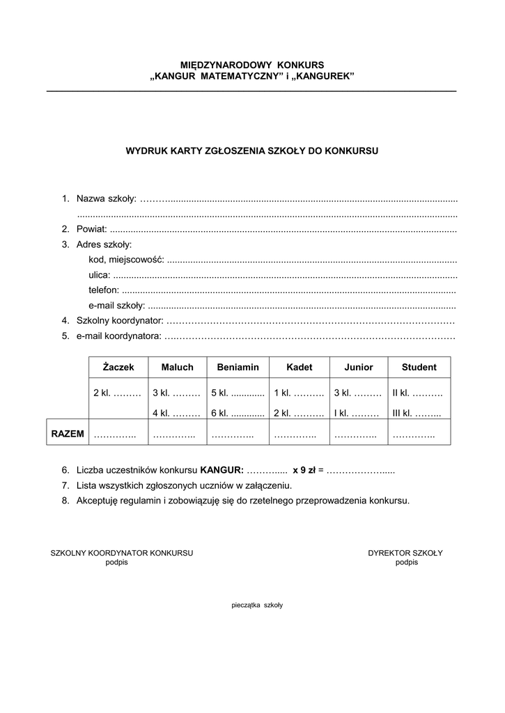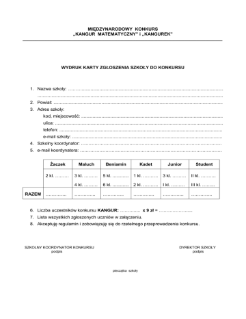 MIĘDZYNARODOWY KONKURS „KANGUR MATEMATYCZNY” i „KANGUREK” _______________________________________________________________________________ WYDRUK KARTY ZGŁOSZENIA SZKOŁY DO KONKURSU 1. Nazwa szkoły: ………................................................................................................................ ................................................................................................................................................... 2. Powiat: ...................................................................................................................................... 3. Adres szkoły: kod, miejscowość: ................................................................................................................ ulica: ..................................................................................................................................... telefon: ................................................................................................................................. e-mail szkoły: ....................................................................................................................... 4. Szkolny koordynator: ………………………………………………………………………………… 5. e-mail koordynatora: ….……………………………………………………………………………… Żaczek Maluch 2 kl. ……… 3 kl. ……… RAZEM ………….. Beniamin Kadet Junior Student 5 kl. ............. 1 kl. ………. 3 kl. ……… II kl. ………. 4 kl. ……… 6 kl. ............. 2 kl. ………. I kl. ……… III kl. ……... ………….. ………….. ………….. ………….. ………….. 6. Liczba uczestników konkursu KANGUR: ………..... x 9 zł = ………………..... 7. Lista wszystkich zgłoszonych uczniów w załączeniu. 8. Akceptuję regulamin i zobowiązuję się do rzetelnego przeprowadzenia konkursu. DYREKTOR SZKOŁY podpis SZKOLNY KOORDYNATOR KONKURSU podpis pieczątka szkoły