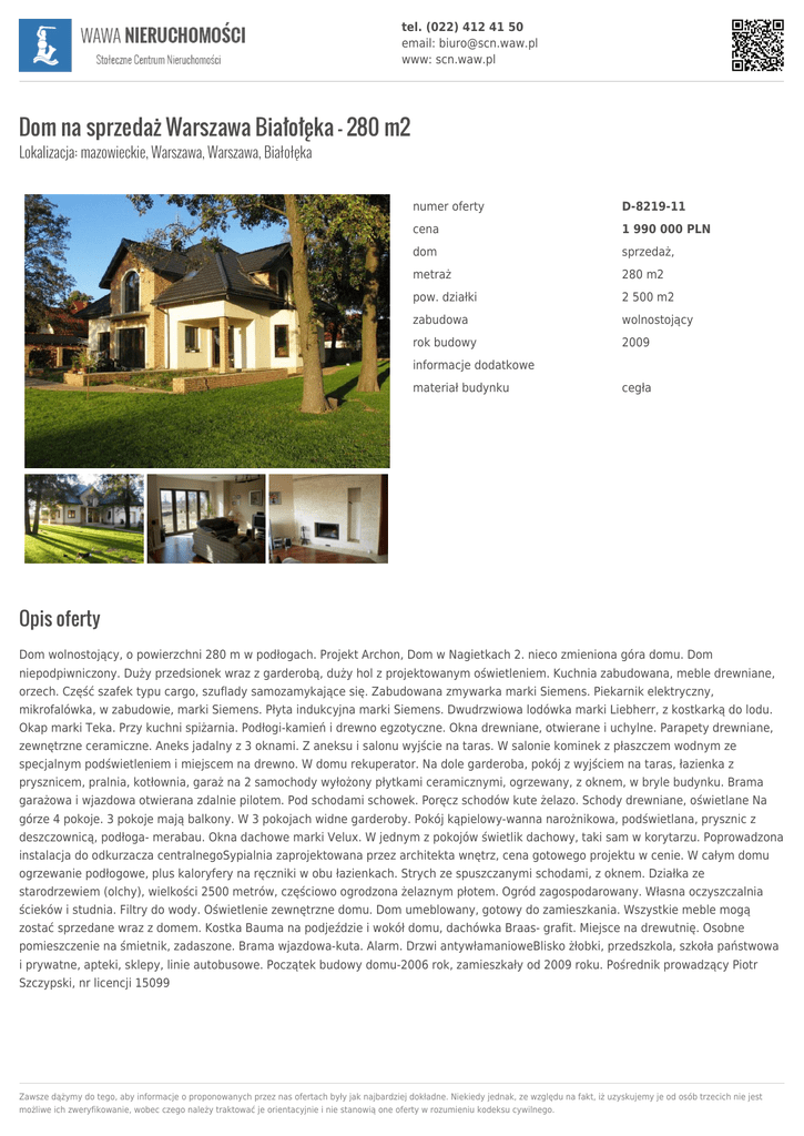 tel. (022) 412 41 50 email: [email protected] www: scn.waw.pl Dom na sprzedaż Warszawa Białołęka - 280 m2 Lokalizacja: mazowieckie, Warszawa, Warszawa, Białołęka numer oferty D-8219-11 cena 1 990 000 PLN dom sprzedaż, metraż 280 m2 pow. działki 2 500 m2 zabudowa wolnostojący rok budowy 2009 informacje dodatkowe materiał budynku cegła Opis oferty Dom wolnostojący, o powierzchni 280 m w podłogach. Projekt Archon, Dom w Nagietkach 2. nieco zmieniona góra domu. Dom niepodpiwniczony. Duży przedsionek wraz z garderobą, duży hol z projektowanym oświetleniem. Kuchnia zabudowana, meble drewniane, orzech. Część szafek typu cargo, szuflady samozamykające się. Zabudowana zmywarka marki Siemens. Piekarnik elektryczny, mikrofalówka, w zabudowie, marki Siemens. Płyta indukcyjna marki Siemens. Dwudrzwiowa lodówka marki Liebherr, z kostkarką do lodu. Okap marki Teka. Przy kuchni spiżarnia. Podłogi-kamień i drewno egzotyczne. Okna drewniane, otwierane i uchylne. Parapety drewniane, zewnętrzne ceramiczne. Aneks jadalny z 3 oknami. Z aneksu i salonu wyjście na taras. W salonie kominek z płaszczem wodnym ze specjalnym podświetleniem i miejscem na drewno. W domu rekuperator. Na dole garderoba, pokój z wyjściem na taras, łazienka z prysznicem, pralnia, kotłownia, garaż na 2 samochody wyłożony płytkami ceramicznymi, ogrzewany, z oknem, w bryle budynku. Brama garażowa i wjazdowa otwierana zdalnie pilotem. Pod schodami schowek. Poręcz schodów kute żelazo. Schody drewniane, oświetlane Na górze 4 pokoje. 3 pokoje mają balkony. W 3 pokojach widne garderoby. Pokój kąpielowy-wanna narożnikowa, podświetlana, prysznic z deszczownicą, podłoga- merabau. Okna dachowe marki Velux. W jednym z pokojów świetlik dachowy, taki sam w korytarzu. Poprowadzona instalacja do odkurzacza centralnegoSypialnia zaprojektowana przez architekta wnętrz, cena gotowego projektu w cenie. W całym domu ogrzewanie podłogowe, plus kaloryfery na ręczniki w obu łazienkach. Strych ze spuszczanymi schodami, z oknem. Działka ze starodrzewiem (olchy), wielkości 2500 metrów, częściowo ogrodzona żelaznym płotem. Ogród zagospodarowany. Własna oczyszczalnia ścieków i studnia. Filtry do wody. Oświetlenie zewnętrzne domu. Dom umeblowany, gotowy do zamieszkania. Wszystkie meble mogą zostać sprzedane wraz z domem. Kostka Bauma na podjeździe i wokół domu, dachówka Braas- grafit. Miejsce na drewutnię. Osobne pomieszczenie na śmietnik, zadaszone. Brama wjazdowa-kuta. Alarm. Drzwi antywłamanioweBlisko żłobki, przedszkola, szkoła państwowa i prywatne, apteki, sklepy, linie autobusowe. Początek budowy domu-2006 rok, zamieszkały od 2009 roku. Pośrednik prowadzący Piotr Szczypski, nr licencji 15099 Zawsze dążymy do tego, aby informacje o proponowanych przez nas ofertach były jak najbardziej dokładne. Niekiedy jednak, ze względu na fakt, iż uzyskujemy je od osób trzecich nie jest możliwe ich zweryfikowanie, wobec czego należy traktować je orientacyjnie i nie stanowią one oferty w rozumieniu kodeksu cywilnego. tel. (022) 412 41 50 email: [email protected] www: scn.waw.pl Lokalizacja Osoba kontaktowa Zofia Grzybek województwo mazowieckie powiat Warszawa [email protected] miasto Warszawa dzielnica Białołęka Chętnie udzielę dodatkowych informacji związanych z tą ofertą. Zapraszam do kontaktu! tel. 725 56 56 05 Zawsze dążymy do tego, aby informacje o proponowanych przez nas ofertach były jak najbardziej dokładne. Niekiedy jednak, ze względu na fakt, iż uzyskujemy je od osób trzecich nie jest możliwe ich zweryfikowanie, wobec czego należy traktować je orientacyjnie i nie stanowią one oferty w rozumieniu kodeksu cywilnego.