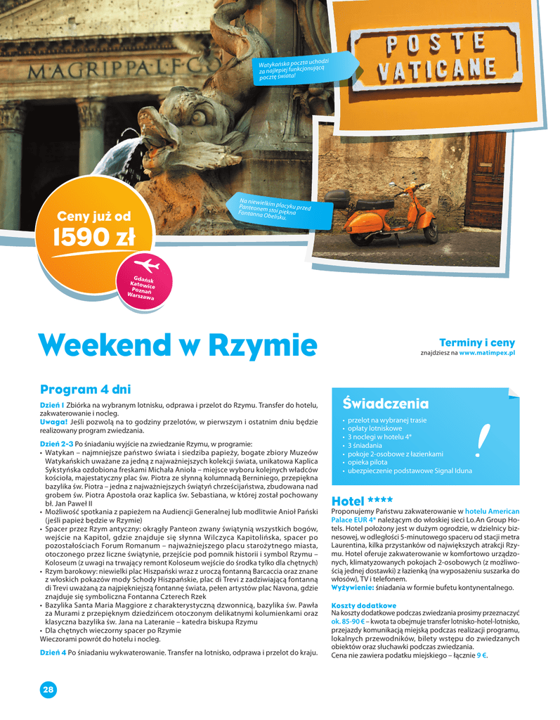 uchodzi Watykańska poc zta onującą za najlepiej funkcj poc ztę świata! Ceny już od Na niewielk Panteonem im plac yku przed Fontanna O stoi piękna belisku. 1590 zł Gdań Katow sk ic Pozna e Warsza ń wa Weekend w Rzymie Program 4 dni Dzień 1 Zbiórka na wybranym lotnisku, odprawa i przelot do Rzymu. Transfer do hotelu, zakwaterowanie i nocleg. Uwaga! Jeśli pozwolą na to godziny przelotów, w pierwszym i ostatnim dniu będzie realizowany program zwiedzania. Dzień 2-3 Po śniadaniu wyjście na zwiedzanie Rzymu, w programie: • Watykan – najmniejsze państwo świata i siedziba papieży, bogate zbiory Muzeów Watykańskich uważane za jedną z najważniejszych kolekcji świata, unikatowa Kaplica Sykstyńska ozdobiona freskami Michała Anioła – miejsce wyboru kolejnych władców kościoła, majestatyczny plac św. Piotra ze słynną kolumnadą Berniniego, przepiękna bazylika św. Piotra – jedna z najważniejszych świątyń chrześcijaństwa, zbudowana nad grobem św. Piotra Apostoła oraz kaplica św. Sebastiana, w której został pochowany bł. Jan Paweł II • Możliwość spotkania z papieżem na Audiencji Generalnej lub modlitwie Anioł Pański (jeśli papież będzie w Rzymie) • Spacer przez Rzym antyczny: okrągły Panteon zwany świątynią wszystkich bogów, wejście na Kapitol, gdzie znajduje się słynna Wilczyca Kapitolińska, spacer po pozostałościach Forum Romanum – najważniejszego placu starożytnego miasta, otoczonego przez liczne świątynie, przejście pod pomnik historii i symbol Rzymu – Koloseum (z uwagi na trwający remont Koloseum wejście do środka tylko dla chętnych) • Rzym barokowy: niewielki plac Hiszpański wraz z uroczą fontanną Barcaccia oraz znane z włoskich pokazów mody Schody Hiszpańskie, plac di Trevi z zadziwiającą fontanną di Trevi uważaną za najpiękniejszą fontannę świata, pełen artystów plac Navona, gdzie znajduje się symboliczna Fontanna Czterech Rzek • Bazylika Santa Maria Maggiore z charakterystyczną dzwonnicą, bazylika św. Pawła za Murami z przepięknym dziedzińcem otoczonym delikatnymi kolumienkami oraz klasyczna bazylika św. Jana na Lateranie – katedra biskupa Rzymu • Dla chętnych wieczorny spacer po Rzymie Wieczorami powrót do hotelu i nocleg. Dzień 4 Po śniadaniu wykwaterowanie. Transfer na lotnisko, odprawa i przelot do kraju. 28 Terminy i ceny znajdziesz na www.matimpex.pl Świadczenia • przelot na wybranej trasie • opłaty lotniskowe • 3 noclegi w hotelu 4* • 3 śniadania • pokoje 2-osobowe z łazienkami • opieka pilota • ubezpieczenie podstawowe Signal Iduna Hotel **** Proponujemy Państwu zakwaterowanie w hotelu American Palace EUR 4* należącym do włoskiej sieci Lo.An Group Hotels. Hotel położony jest w dużym ogrodzie, w dzielnicy biznesowej, w odległości 5-minutowego spaceru od stacji metra Laurentina, kilka przystanków od największych atrakcji Rzymu. Hotel oferuje zakwaterowanie w komfortowo urządzonych, klimatyzowanych pokojach 2-osobowych (z możliwością jednej dostawki) z łazienką (na wyposażeniu suszarka do włosów), TV i telefonem. Wyżywienie: śniadania w formie bufetu kontynentalnego. Koszty dodatkowe Na koszty dodatkowe podczas zwiedzania prosimy przeznaczyć ok. 85-90 € – kwota ta obejmuje transfer lotnisko-hotel-lotnisko, przejazdy komunikacją miejską podczas realizacji programu, lokalnych przewodników, bilety wstępu do zwiedzanych obiektów oraz słuchawki podczas zwiedzania. Cena nie zawiera podatku miejskiego – łącznie 9 €.