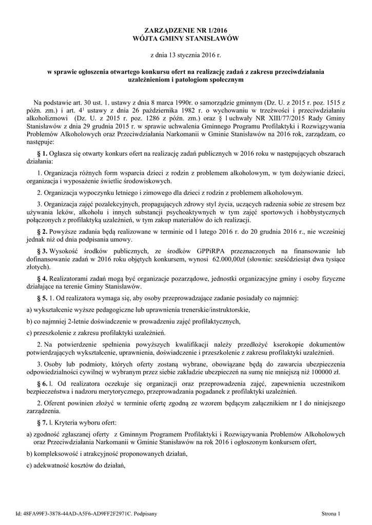 ZARZĄDZENIE NR 1/2016 WÓJTA GMINY STANISŁAWÓW z dnia 13 stycznia 2016 r. w sprawie ogłoszenia otwartego konkursu ofert na realizację zadań z zakresu przeciwdziałania uzależnieniom i patologiom społecznym Na podstawie art. 30 ust. 1. ustawy z dnia 8 marca 1990r. o samorządzie gminnym (Dz. U. z 2015 r. poz. 1515 z późn. zm.) i art. 41 ustawy z dnia 26 października 1982 r. o wychowaniu w trzeźwości i przeciwdziałaniu alkoholizmowi (Dz. U. z 2015 r. poz. 1286 z późn. zm.) oraz § l uchwały NR XIII/77/2015 Rady Gminy Stanisławów z dnia 29 grudnia 2015 r. w sprawie uchwalenia Gminnego Programu Profilaktyki i Rozwiązywania Problemów Alkoholowych oraz Przeciwdziałania Narkomanii w Gminie Stanisławów na 2016 rok, zarządzam, co następuje: § 1. Ogłasza się otwarty konkurs ofert na realizację zadań publicznych w 2016 roku w następujących obszarach działania: 1. Organizacja różnych form wsparcia dzieci z rodzin z problemem alkoholowym, w tym dożywianie dzieci, organizacja i wyposażenie świetlic środowiskowych. 2. Organizacja wypoczynku letniego i zimowego dla dzieci z rodzin z problemem alkoholowym. 3. Organizacja zajęć pozalekcyjnych, propagujących zdrowy styl życia, uczących radzenia sobie ze stresem bez używania leków, alkoholu i innych substancji psychoaktywnych w tym zajęć sportowych i hobbystycznych połączonych z profilaktyką uzależnień, w tym zakup materiałów do ich realizacji. § 2. Powyższe zadania będą realizowane w terminie od l lutego 2016 r. do 20 grudnia 2016 r., nie wcześniej jednak niż od dnia podpisania umowy. § 3. Wysokość środków publicznych, ze środków GPPiRPA przeznaczonych na finansowanie lub dofinansowanie zadań w 2016 roku objętych konkursem, wynosi 62.000,00zł (słownie: sześćdziesiąt dwa tysiące złotych). § 4. Realizatorami zadań mogą być organizacje pozarządowe, jednostki organizacyjne gminy i osoby fizyczne działające na terenie Gminy Stanisławów. § 5. 1. Od realizatora wymaga się, aby osoby przeprowadzające zadanie posiadały co najmniej: a) wykształcenie wyższe pedagogiczne lub uprawnienia trenerskie/instruktorskie, b) co najmniej 2-letnie doświadczenie w prowadzeniu zajęć profilaktycznych, c) przeszkolenie z zakresu profilaktyki uzależnień. 2. Na potwierdzenie spełnienia powyższych kwalifikacji należy przedłożyć kserokopie dokumentów potwierdzających wykształcenie, uprawnienia, doświadczenie i przeszkolenie z zakresu profilaktyki uzależnień. 3. Osoby lub podmioty, których oferty zostaną wybrane, obowiązane będą do zawarcia ubezpieczenia odpowiedzialności cywilnej w wybranym przez siebie zakładzie ubezpieczeń na sumę nie mniejszą niż 100000 zł. § 6. l. Od realizatora oczekuje się organizacji oraz przeprowadzenia zajęć, zapewnienia uczestnikom bezpieczeństwa i nadzoru merytorycznego, przeprowadzania pogadanek z profilaktyki uzależnień. 2. Oferent powinien złożyć w terminie ofertę zgodną ze wzorem będącym załącznikiem nr l do niniejszego zarządzenia. § 7. l. Kryteria wyboru ofert: a) zgodność zgłaszanej oferty z Gminnym Programem Profilaktyki i Rozwiązywania Problemów Alkoholowych oraz Przeciwdziałania Narkomanii w Gminie Stanisławów na rok 2016 i ogłoszonym konkursem ofert, b) kompleksowość i atrakcyjność proponowanych działań, c) adekwatność kosztów do działań, Id: 48FA99F3-3878-44AD-A5F6-AD9FF2F2971C. Podpisany Strona 1 d) rzetelność i celowość przedstawionego kosztorysu, e) uzasadnienie potrzeby realizacji zadania, f) kwalifikacje osób odpowiedzialnych za realizację działania, g) doświadczenie w prowadzeniu podobnych działań, h) ilość uczestników objętych zakresem działań, 2. Organizator zastrzega sobie prawo do odwołania konkursu bez podania przyczyny, przesunięcia terminu składania ofert oraz zmiany terminu rozpoczęcia i zakończenia postępowania konkursowego. § 8. 1. Oferent może złożyć oferty na 1, 2 lub wszystkie części konkursu 2. Oferty nie spełniające wymogów formalnych lub złożone po terminie nie będą rozpatrywane. § 9. Oferty wraz z niezbędnymi dokumentami w tym potwierdzającymi kwalifikacje osób należy składać do dnia 22 stycznia 2016 r. do godz. 16.00 w zamkniętej kopercie z napisem „Konkurs ofert na realizację zadań w zakresie przeciwdziałania uzależnieniom i patologiom społecznym” w sekretariacie Urzędu Gminy Stanisławów ul. Rynek 32, p. 19. § 10. 1. Do oceny ofert powołuję komisję w składzie: 1) Jadwiga Będkowska - przewodnicząca komisji 2) Tomasz Zdanowicz - sekretarz komisji 3) Beata Wąsowska - członek komisji. 2. Ocenę oferty przeprowadza się za pomocą karty oceny formalnej i karty oceny merytorycznej – załączników nr 2 i 3 do niniejszego zarządzenia. § 11. Zarządzenie wchodzi w życie z dniem podpisania. Wójt Gminy Adam Sulewski Id: 48FA99F3-3878-44AD-A5F6-AD9FF2F2971C. Podpisany Strona 2 Załącznik Nr 1 do Zarządzenia Nr 1/2016 Wójta Gminy Stanisławów z dnia 13 stycznia 2016 r. Stanisławów, …………………………… (data i miejsce złożenia wniosku) WNIOSEK O DOFINANSOWANIE ZADANIA PUBLICZNEGO POD NAZWĄ: ........................................................................................................................................................................... REALIZOWANEGO W RAMACH GMINNEGO PROGRAMU PROFILAKTYKI I ROZWIĄZYWANIA PROBLEMÓW ALKOHOLOWYCH ORAZ PRZECIWDZIAŁANIA NARKOMANII W GMINIE STANISŁAWÓW W ROKU 2016 I. Dane wnioskodawcy: 1) Nazwa jednostki/imię i nazwisko …………………………………………………………………….. 2) Adres ……………………………………………………………………………………………………. numer telefonu ……………………………..... …………; e-mail ................................................. 3) Imię i nazwisko oraz dane kontaktowe osoby odpowiedzialnej za realizację merytory