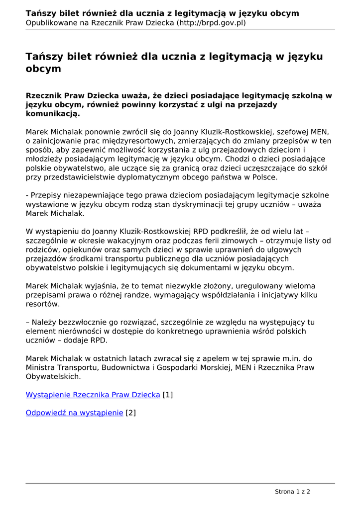 Tańszy bilet również dla ucznia z legitymacją w języku obcym Opublikowane na Rzecznik Praw Dziecka (http://brpd.gov.pl) Tańszy bilet również dla ucznia z legitymacją w języku obcym Rzecznik Praw Dziecka uważa, że dzieci posiadające legitymację szkolną w języku obcym, również powinny korzystać z ulgi na przejazdy komunikacją. Marek Michalak ponownie zwrócił się do Joanny Kluzik-Rostkowskiej, szefowej MEN, o zainicjowanie prac międzyresortowych, zmierzających do zmiany przepisów w ten sposób, aby zapewnić możliwość korzystania z ulg przejazdowych dzieciom i młodzieży posiadającym legitymację w języku obcym. Chodzi o dzieci posiadające polskie obywatelstwo, ale uczące się za granicą oraz dzieci uczęszczające do szkół przy przedstawicielstwie dyplomatycznym obcego państwa w Polsce. - Przepisy niezapewniające tego prawa dzieciom posiadającym legitymacje szkolne wystawione w języku obcym rodzą stan dyskryminacji tej grupy uczniów – uważa Marek Michalak. W wystąpieniu do Joanny Kluzik-Rostkowskiej RPD podkreślił, że od wielu lat – szczególnie w okresie wakacyjnym oraz podczas ferii zimowych – otrzymuje listy od rodziców, opiekunów oraz samych dzieci w sprawie uprawnień do ulgowych przejazdów środkami transportu publicznego dla uczniów posiadających obywatelstwo polskie i legitymujących się dokumentami w języku obcym. Marek Michalak wyjaśnia, że to temat niezwykle złożony, uregulowany wieloma przepisami prawa o różnej randze, wymagający współdziałania i inicjatywy kilku resortów. – Należy bezzwłocznie go rozwiązać, szczególnie ze względu na występujący tu element nierówności w dostępie do konkretnego uprawnienia wśród polskich uczniów – dodaje RPD. Marek Michalak w ostatnich latach zwracał się z apelem w tej sprawie m.in. do Ministra Transportu, Budownictwa i Gospodarki Morskiej, MEN i Rzecznika Praw Obywatelskich. Wystąpienie Rzecznika Praw Dziecka [1] Odpowiedź na wystąpienie [2] Strona 1 z 2 Tańszy bilet również dla ucznia z legitymacją w języku obcym Opublikowane na Rzecznik Praw Dziecka (http://brpd.gov.pl) Udostępnij: Facebook [4] Google Plus [5] Twitter [6] Adres URL źródła: http://brpd.gov.pl/aktualnosci-wystapienia-generalne/tanszyView the full image [3] bilet-rowniez-dla-ucznia-z-legitymacja-w-jezyku-obcym Odnośniki: [1] http://brpd.gov.pl/sites/default/files/wyst_2015_09_01_men.pdf [2] http://brpd.gov.pl/sites/default/files/odp._na_wystapienie_ulgowe_przejazdy_srod kami_publicznego_transportuzss_422_15_2015_mw.pdf [3] http://brpd.gov.pl/sites/default/files/podpis_chmurka_31.jpg [4] http://facebook.com/sharer.php?u=http%3A%2F%2Fbrpd.gov.pl%2Faktualnosciwystapienia-generalne%2Ftanszy-bilet-rowniez-dla-ucznia-z-legitymacja-w-jezyku-o bcym&t=Ta%C5%84szy%20bilet%20r%C3%B3wnie%C5%BC%20dla%20ucznia %20z%20legitymacj%C4%85%20w%20j%C4%99zyku%20obcym [5] https://plus.google.com/share?url=http%3A%2F%2Fbrpd.gov.pl%2Faktualnosciwystapienia-generalne%2Ftanszy-bilet-rowniez-dla-ucznia-z-legitymacja-w-jezykuobcym [6] http://twitter.com/intent/tweet?url=http%3A%2F%2Fbrpd.gov.pl%2Faktualnosciwystapienia-generalne%2Ftanszy-bilet-rowniez-dla-ucznia-z-legitymacja-w-jezyku-o bcym&text=Ta%C5%84szy%20bilet%20r%C3%B3wnie%C5%BC%20dla%20uc znia%20z%20legitymacj%C4%85%20w%20j%C4%99zyku%20obcym Strona 2 z 2