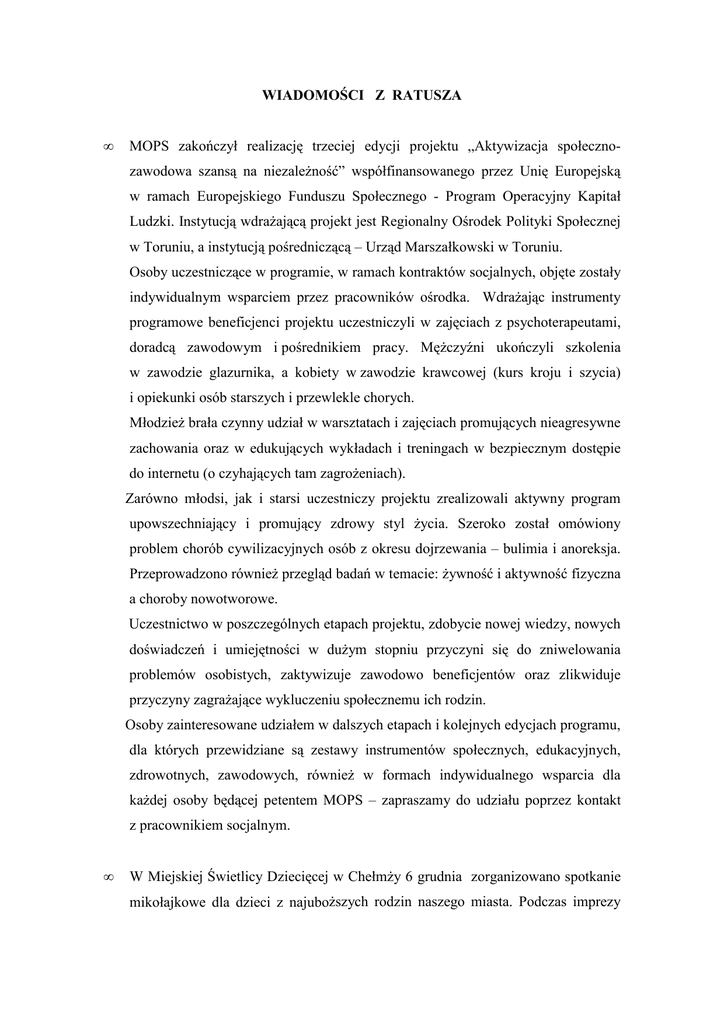 WIADOMOŚCI Z RATUSZA • MOPS zakończył realizację trzeciej edycji projektu „Aktywizacja społecznozawodowa szansą na niezaleŜność” współfinansowanego przez Unię Europejską w ramach Europejskiego Funduszu Społecznego - Program Operacyjny Kapitał Ludzki. Instytucją wdraŜającą projekt jest Regionalny Ośrodek Polityki Społecznej w Toruniu, a instytucją pośredniczącą – Urząd Marszałkowski w Toruniu. Osoby uczestniczące w programie, w ramach kontraktów socjalnych, objęte zostały indywidualnym wsparciem przez pracowników ośrodka. WdraŜając instrumenty programowe beneficjenci projektu uczestniczyli w zajęciach z psychoterapeutami, doradcą zawodowym i pośrednikiem pracy. MęŜczyźni ukończyli szkolenia w zawodzie glazurnika, a kobiety w zawodzie krawcowej (kurs kroju i szycia) i opiekunki osób starszych i przewlekle chorych. MłodzieŜ brała czynny udział w warsztatach i zajęciach promujących nieagresywne zachowania oraz w edukujących wykładach i treningach w bezpiecznym dostępie do internetu (o czyhających tam zagroŜeniach). Zarówno młodsi, jak i starsi uczestniczy projektu zrealizowali aktywny program upowszechniający i promujący zdrowy styl Ŝycia. Szeroko został omówiony problem chorób cywilizacyjnych osób z okresu dojrzewania – bulimia i anoreksja. Przeprowadzono równieŜ przegląd badań w temacie: Ŝywność i aktywność fizyczna a choroby nowotworowe. Uczestnictwo w poszczególnych etapach projektu, zdobycie nowej wiedzy, nowych doświadczeń i umiejętności w duŜym stopniu przyczyni się do zniwelowania problemów osobistych, zaktywizuje zawodowo beneficjentów oraz zlikwiduje przyczyny zagraŜające wykluczeniu społecznemu ich rodzin. Osoby zainteresowane udziałem w dalszych etapach i kolejnych edycjach programu, dla których przewidziane są zestawy instrumentów społecznych, edukacyjnych, zdrowotnych, zawodowych, równieŜ w formach indywidualnego wsparcia dla kaŜdej osoby będącej petentem MOPS – zapraszamy do udziału poprzez kontakt z pracownikiem socjalnym. • W Miejskiej Świetlicy Dziecięcej w ChełmŜy 6 grudnia zorganizowano spotkanie mikołajkowe dla dzieci z najuboŜszych rodzin naszego miasta. Podczas imprezy 2 obfitującej w liczne gry i zabawy kaŜde z trzystu dzieci otrzymało paczkę ze słodyczami. W tym samym dniu Burmistrz Miasta ChełmŜy i Przewodniczący Rady Miejskiej ChełmŜy oraz kierownictwo MOPS odwiedziło dzieci w Placówce OpiekuńczoWychowawczej w ChełmŜy. Oprócz Ŝyczeń mikołajkowych i świątecznych kaŜdemu z wychowanków wręczono słodkie upominki. • Miejski Ośrodek Pomocy Społecznej zorganizował Wigilię dla 50 osób samotnych i bezdomnych, która odbyła się 17 grudnia o godz. 1300 w restauracji „Mistral”. Świąteczne i noworoczne Ŝyczenia dla tych osób składali przedstawiciele władz miasta oraz kierownictwo Miejskiego Ośrodka Pomocy Społecznej. KaŜda z 50 osób otrzymała równieŜ świąteczną paczkę. • Miejski Ośrodek Pomocy Społecznej w ChełmŜy przygotował się do pomocy potrzebującym w okresie zimy. Pomoc ta moŜe mieć charakter pracy socjalnej lub formę: udzielenia schronienia, posiłku, ubrania, a takŜe zasiłku celowego na leczenie lub opał. Ośrodek nawiązał współpracę ze schroniskami dla bezdomnych, gdzie schronienie i opiekę w tym okresie znalazło 14 osób. Część osób bezdomnych odmawia przyjęcia skierowań do schronisk i noclegowni naraŜając się jednocześnie na utratę zdrowia i Ŝycia. Osoby te są monitorowane przez pracowników socjalnych i straŜ miejską. MOPS zwraca się z apelem do mieszkańców ChełmŜy, aby informowali pracowników ośrodka o osobach, które w nadchodzącej porze roku wymagają pomocy, a same o nią nie wystąpiły oraz o przypadkach, które ze względu na swój charakter wymagają doraźnej interwencji socjalnej. W nadchodzącym okresie zimowym Miejski Ośrodek Pomocy Społecznej w ChełmŜy będzie monitorował ze szczególną troską i wnikliwością sytuację osób bezdomnych oraz potrzebujących wsparcia i w miarę posiadanych środków finansowych i instrumentów ustawowych będzie pomagał wszystkim osobom, które się o pomoc do ośrodka zwrócą. • Ponownie informuję, Ŝe osoba, która wyjeŜdŜa za granicę na okres dłuŜszy niŜ 3 miesiące, jest obowiązana zgłosić swój wyjazd oraz powrót właściwemu ze 3 względu na miejsce pobytu stałego organowi. Zgłoszenia wyjazdu dokonuje się najpóźniej w dniu opuszczenia dotychczasowego miejsca pobytu, a zgłoszenia powrotu najpóźniej przed upływem czwartej doby, licząc od dnia powrotu. JeŜeli okres pobytu czasowego trwającego ponad 3 miesiące odpowiada okresowi zgłoszonemu przy zameldowaniu, osoba opuszczająca miejsce tego pobytu jest zwolniona od obowiązku wymeldowania się. • Ponownie przypominam mieszkańcom ChełmŜy o konieczności wymiany dowodu osobistego. Wydanie dowodu osobistego jest bezpłatne. Na terenie miasta do wymiany pozostało 147 ksiąŜeczkowych dowodów osobistych. Dowody te straciły waŜność. Osoby, które dotychczas nie wymieniły starego dowodu osobistego powinny dokonać czynności tej niezwłocznie. Natomiast posiadacz aktualnie obowiązującego dowodu osobistego ma obowiązek wymienić ten dokument w następujących przypadkach: a) zmiany danych, które zamieszcza się w dowodzie osobistym tj. zmiany imienia, nazwiska, daty urodzenia, imion rodziców, miejsca zamieszkania, w ciągu 14 dni. Niedokonanie wymiany dowodu osobistego w w/w terminie skutkuje uniewaŜnieniem z urzędu tego dokumentu po upływie 3 miesięcy. b) uszkodzenia dowodu osobistego lub zaistnienia innej okoliczności utrudniającej ustalenie toŜsamości osoby, niezwłocznie. c) upływu terminu waŜności dokumentu, nie później niŜ na 30 dni przed upływem terminu waŜności dokumentu. • Zgodnie z ustawą z dnia 17 października 2008 r. o zmianie imienia i nazwiska w drodze decyzji administracyjnej mo
