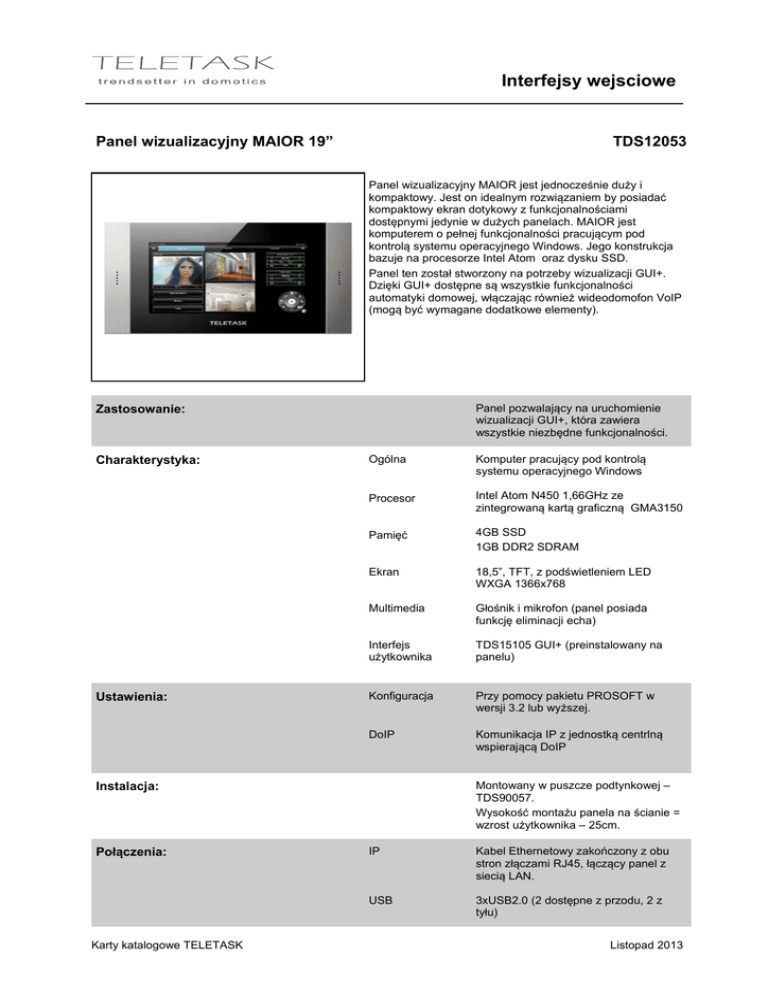 Interfejsy wejsciowe Panel wizualizacyjny MAIOR 19” TDS12053 Panel wizualizacyjny MAIOR jest jednocześnie duży i kompaktowy. Jest on idealnym rozwiązaniem by posiadać kompaktowy ekran dotykowy z funkcjonalnościami dostępnymi jedynie w dużych panelach. MAIOR jest komputerem o pełnej funkcjonalności pracującym pod kontrolą systemu operacyjnego Windows. Jego konstrukcja bazuje na procesorze Intel Atom oraz dysku SSD. Panel ten został stworzony na potrzeby wizualizacji GUI+. Dzięki GUI+ dostępne są wszystkie funkcjonalności automatyki domowej, włączając również wideodomofon VoIP (mogą być wymagane dodatkowe elementy). Panel pozwalający na uruchomienie wizualizacji GUI+, która zawiera wszystkie niezbędne funkcjonalności. Zastosowanie: Charakterystyka: Ustawienia: Ogólna Komputer pracujący pod kontrolą systemu operacyjnego Windows Procesor Intel Atom N450 1,66GHz ze zintegrowaną kartą graficzną GMA3150 Pamięć 4GB SSD 1GB DDR2 SDRAM Ekran 18,5”, TFT, z podświetleniem LED WXGA 1366x768 Multimedia Głośnik i mikrofon (panel posiada funkcję eliminacji echa) Interfejs użytkownika TDS15105 GUI+ (preinstalowany na panelu) Konfiguracja Przy pomocy pakietu PROSOFT w wersji 3.2 lub wyższej. DoIP Komunikacja IP z jednostką centrlną wspierającą DoIP Montowany w puszcze podtynkowej – TDS90057. Wysokość montażu panela na ścianie = wzrost użytkownika – 25cm. Instalacja: Połączenia: Karty katalogowe TELETASK IP Kabel Ethernetowy zakończony z obu stron złączami RJ45, łączący panel z siecią LAN. USB 3xUSB2.0 (2 dostępne z przodu, 2 z tyłu) Listopad 2013 Interfejsy wejsciowe Zasilanie Max. 35W Zużycie energii: Wymiary: Waga netto | brutto: Parametry pracy: 100-230V AC; 50Hz lub 60Hz Panel + płyta czołowa 600 szer. x 345 wys. x 80 gr Puszka podtynkowa 582 szer. x 327 wys. x 80 gr Panel + płyta czołowa 7,1 kg |8,8 kg Puszka podtynkowa 3,8 kg |4,4 kg Temperatura 0ºC - 30ºC Wilgotność 5% - 80% przy 25ºC (bez kondensacji) Ochrona IP: IP20 Zawartość opakowania: TDS12053 MAIOR 19” + płyta czołowa TDS15105 licencja GUI+ (preinstalowana) Schemat połączeń: Karty katalogowe TELETASK Listopad 2013
