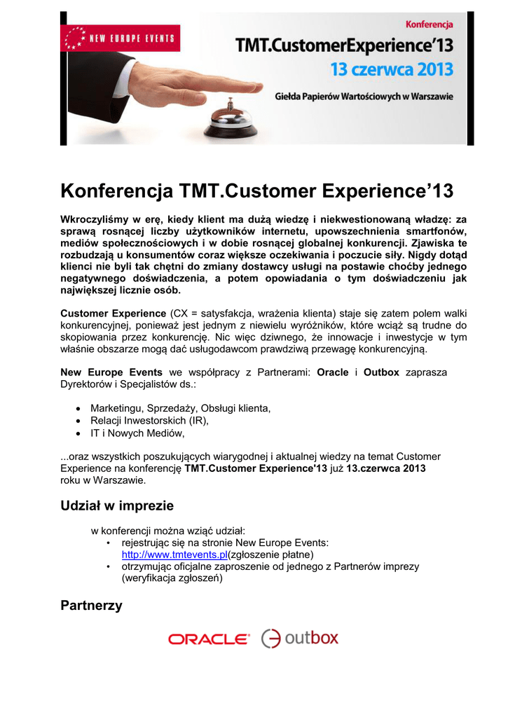 Konferencja TMT.Customer Experience’13 Wkroczyliśmy w erę, kiedy klient ma dużą wiedzę i niekwestionowaną władzę: za sprawą rosnącej liczby użytkowników internetu, upowszechnienia smartfonów, mediów społecznościowych i w dobie rosnącej globalnej konkurencji. Zjawiska te rozbudzają u konsumentów coraz większe oczekiwania i poczucie siły. Nigdy dotąd klienci nie byli tak chętni do zmiany dostawcy usługi na postawie choćby jednego negatywnego doświadczenia, a potem opowiadania o tym doświadczeniu jak największej licznie osób. Customer Experience (CX = satysfakcja, wrażenia klienta) staje się zatem polem walki konkurencyjnej, ponieważ jest jednym z niewielu wyróżników, które wciąż są trudne do skopiowania przez konkurencję. Nic więc dziwnego, że innowacje i inwestycje w tym właśnie obszarze mogą dać usługodawcom prawdziwą przewagę konkurencyjną. New Europe Events we współpracy z Partnerami: Oracle i Outbox zaprasza Dyrektorów i Specjalistów ds.: Marketingu, Sprzedaży, Obsługi klienta, Relacji Inwestorskich (IR), IT i Nowych Mediów, ...oraz wszystkich poszukujących wiarygodnej i aktualnej wiedzy na temat Customer Experience na konferencję TMT.Customer Experience'13 już 13.czerwca 2013 roku w Warszawie. Udział w imprezie w konferencji można wziąć udział: • rejestrując się na stronie New Europe Events: http://www.tmtevents.pl(zgłoszenie płatne) • otrzymując oficjalne zaproszenie od jednego z Partnerów imprezy (weryfikacja zgłoszeń) Partnerzy Program konferencji: TMT.Customer Experience'13, 13 czerwca 2013, Warszawa 09.00 - 10:00 Rejestracja uczestników i poranna kawa / powitalna herbata 10:00 Powitanie i przedstawienie agendy dnia Michał Faber, moderator 10:00 - 10:30 Prezentacja: Korporacje wchodzą w świat social media: dlaczego Oracle zainwestowało w RightNow? Allan Rechtman, Oracle 10:30 - 11:00 Prezentacja: Czy CRM rzeczywiście może napędzać cross-channel customer experience? Richard Thomas, Outbox 11:00 - 11:30 Prezentacja: Satysfakcja klientów a wycena przedsiębiorstwa i wartość dla akcjonariuszy Damian Atroszczak, Grant Thornton 11:30 - 12:00 Prezentacja: Wpływ wykorzystania smartfonów i social media na zachowania klientów Yuri Drabent , Lubię to 12.00 - 12:20 Przerwa na kawę i networking 12.20 - 13:45 Dyskusja panelowa: Case studies zarządzania emocjami i customer experience w sytuacjach kryzysowych. Czy warto inwestować w customer experience? Jakich efektów oczekiwać? Goście panelu: Marcin Gruszka, Play Ilona Grzywińska, Webkomunikacja Arkadiusz Mierzwa, nc+ Marcin Nowak, Orange Richard Thomas, Outbox 13.45 - 14:00 Podsumowanie i zakończenie konferencji O New Europe Events New Europe Events specjalizuje się w zarządzaniu projektami event marketingowymi realizującymi cele zleceniodawców prowadzących działalność w nowych krajach członkowskich Unii Europejskiej. Spółka organizuje zarówno otwarte konferencje tematyczne, konferencje prasowe jak i wydarzenia o nietypowej formule. Flagowym produktem konferencyjnym New Europe Events są cykliczne imprezy "TMT Executive Seminar" organizowane dla branży telekomunikacji, nowych mediów oraz innowacyjnych technologii. Kontakt Ewa Stępień, New Europe Events, http://www.tmtevents.pl [email protected], tel. 22 853 37 76, kom. 607 805 239