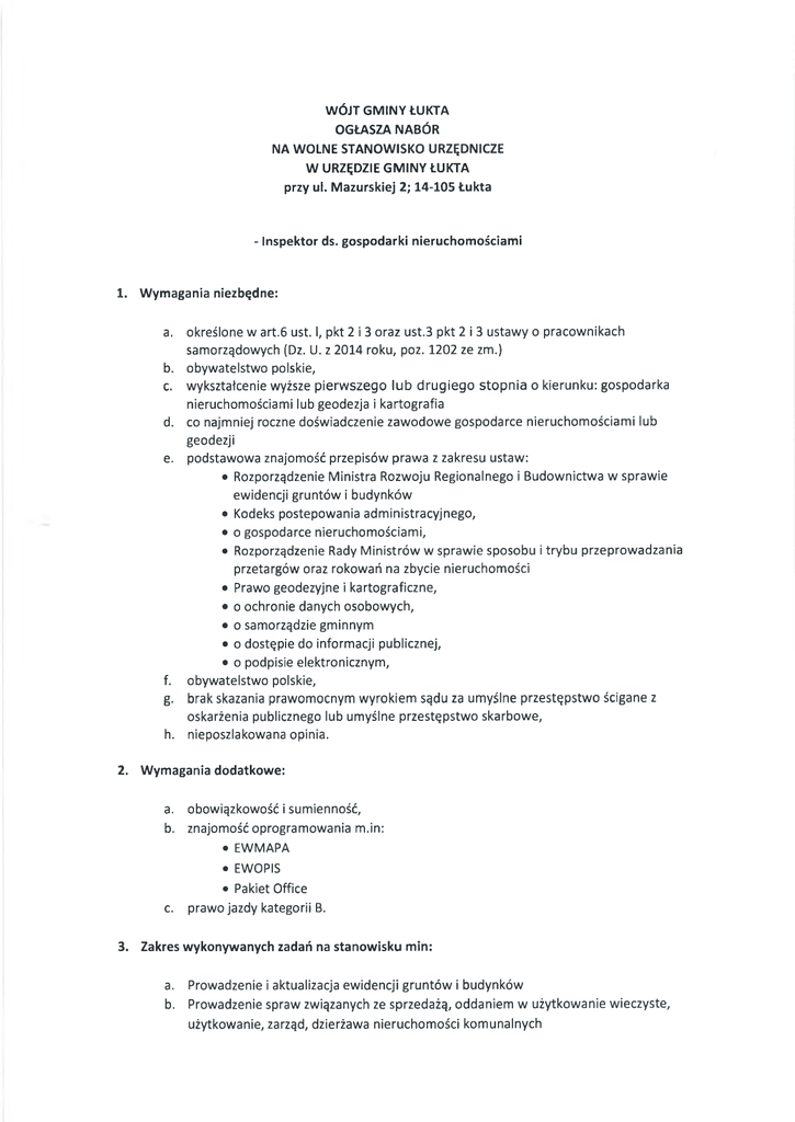 WÓJT GMINY ŁUKTA OGŁASZA NABÓR NA WOLNE STANOWISKO URZĘDNICZE W URZĘDZIE GMINY ŁUKTA przy ul. Mazurskiej 2; 14-105 Łukta - Inspektor ds. gospodarki nieruchomościami 1. Wymagania niezbędne: a. b. c. d. e. f. g. h. określone w art.6 ust. I, pkt 2 i 3 oraz ust.3 pkt 2 i 3 ustawy o pracownikach samorządowych (Dz. U. z 2014 roku, poz. 1202 ze zm.) obywatelstwo polskie, wykształcenie wyższe pierw szego lub drugiego stopnia o kierunku: gospodarka nieruchomościami lub geodezja i kartografia co najmniej roczne doświadczenie zawodowe gospodarce nieruchomościami lub geodezji podstawowa znajomość przepisów prawa z zakresu ustaw: • Rozporządzenie Ministra Rozwoju Regionalnego i Budownictwa w sprawie ewidencji gruntów i budynków • Kodeks postępowania administracyjnego, • o gospodarce nieruchomościami, • Rozporządzenie Rady Ministrów w sprawie sposobu i trybu przeprowadzania przetargów oraz rokowań na zbycie nieruchomości • Prawo geodezyjne i kartograficzne, • o ochronie danych osobowych, • o samorządzie gminnym • o dostępie do informacji publicznej, • o podpisie elektronicznym, obywatelstwo polskie, brak skazania prawomocnym wyrokiem sądu za umyślne przestępstwo ścigane z oskarżenia publicznego lub umyślne przestępstwo skarbowe, nieposzlakowana opinia. 2. Wymagania dodatkowe: a. b. obowiązkowość i sumienność, znajomość oprogramowania m.in: • EWMAPA • EWOPIS c. • Pakiet Office prawo jazdy kategorii B. 3. Zakres wykonywanych zadań na stanowisku min: a. b. Prowadzenie i aktualizacja ewidencji gruntów i budynków Prowadzenie spraw związanych ze sprzedażą, oddaniem w użytkowanie wieczyste, użytkowanie, zarząd, dzierżawa nieruchomości komunalnych c. d. Regulowanie stanów prawnych nieruchomości stanowiących własność Gminy, Prowadzenie spraw związanych z przyjmowaniem, bądź wykupem nieruchomości na rzecz Gminy, e. Prowadzenie spraw związanych z podziałem i rozgraniczeniem nieruchomości, f. Naliczanie opłat adiacenckich w związku z wzrostem wartości nieruchomości z tytułu podziału lub wybudowania infrastruktury technicznej, a także ustalanie odszkodowań za przejmowane z mocy prawa nieruchomości pod drogi gminne, g. Prowadzenie spraw związanych z ochroną gruntów rolnych, h. Opiniowanie planu ruchu kopalin, i. Inicjowanie i opracowywanie koncepcji gospodarowania mieniem gminnym j. Numeracja porządkowa nieruchomości 4. Warunki pracy: praca biurowa na stanowisku urzędniczym o wymiarze pełnego etatu. Stanowisko pracy wyposażone w urządzenia biurowe: komputer i urządzenie wielofunkcyjne 5. Wskaźnik zatrudnienia osób niepełnosprawnych w jednostce - w rozumieniu przepisów o rehabilitacji zawodowej i społecznej oraz zatrudnianiu osób niepełnosprawnych, w miesiącu poprzedzającym upublicznienie ogłoszenia o naborze jest niższy niż 6%. 6. Wymagane dokumenty: a. wniosek o zatrudnienie i list motywacyjny, b. życiorys (CV), c. kserokopia dokumentu potwierdzającego wykształcenie, d. kwestionariusz osobowy, e. kserokopie świadectw pracy i kserokopia dowodu osobistego, f. inne dodatkowe dokumenty o posiadanych kwalifikacjach i umiejętnościach (kserokopie zaświadczeń o ukończonych kursach, szkoleniach), jeżeli są w dyspozycji kandydata, g. oświadczenie o pełnej zdolności do czynności prawnych oraz korzystaniu z pełni praw publicznych, h. oświadczenie, że osoba nie była skazana prawomocnym wyrokiem sądu za umyślne przestępstwo ścigane z oskarżenia publicznego lub umyślne przestępstwo skarbowe, i. oświadczenie o braku przeciwwskazań zdrowotnych do wykonywania pracy na danym stanowisku, j. ewentualnie kopia dokumentu potwierdzającego niepełnosprawność 7. Termin i miejsce składania dokumentów: Ofertę ze wszystkimi wymaganymi dokumentami aplikacyjnymi, w zamkniętej kopercie z dopiskiem: „Nabór na stanowisko Inspektor ds. gospodarki nieruchomościami" należy przesłać na adres: Urząd Gminy Łukta, ul. Mazurska 2, 14-105 Łukta, lub złożyć osobiście w siedzibie Urzędu Gminy Łukta, w sekretariacie (I piętro, pokój nr 6), w terminie do dnia 07 sierpnia 2015 r., włącznie. Aplikacje, które wpłyną do Urzędu po określonym terminie nie będą rozpatrywane Informacja o wyniku naboru będzie umieszczona na stronie internetowej Biuletynu Informacji Publicznej http://www.bip.warmia.mazury.pl/lukta gmina wiejska/ oraz na tablicy informacyjnej w siedzibie Urzędu Gminy Łukta, ul. Mazurska 2,14-105 Łukta. Wymagane dokumenty aplikacyjne: list motywacyjny, szczegółowe CV (z uwzględnieniem dokładnego przebiegu kariery zawodowej), powinny być opatrzone klauzulą: "Wyrażam zgodę na przetwarzanie moich danych osobowych zawartych w ofercie pracy dla potrzeb niezbędnych do realizacji procesu rekrutacji zgodnie z Ustawą z dnia 29.08.1997 r. o ochronie danych osobowych (t.j. Dz. U. z 2014 r., poz. 1182 ze zm.) oraz ustawę z dn. 21.11.2008 r. o pracownikach samorządowych (t.j. Dz. U. z 2014 r., poz. 1202)". W Ó J T Łukta, dnia 21.07.2015 r.