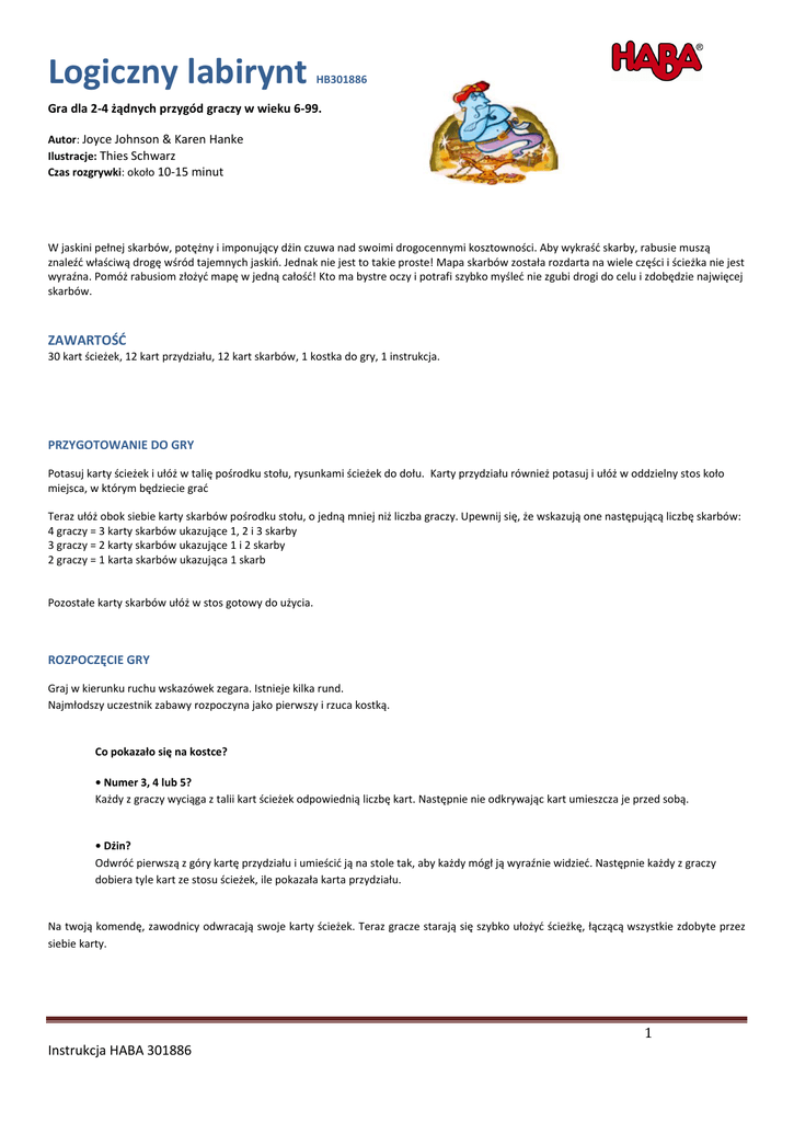 Logiczny labirynt HB301886 Gra dla 2-4 żądnych przygód graczy w wieku 6-99. Autor: Joyce Johnson & Karen Hanke Ilustracje: Thies Schwarz Czas rozgrywki: około 10-15 minut W jaskini pełnej skarbów, potężny i imponujący dżin czuwa nad swoimi drogocennymi kosztowności. Aby wykraść skarby, rabusie muszą znaleźć właściwą drogę wśród tajemnych jaskiń. Jednak nie jest to takie proste! Mapa skarbów została rozdarta na wiele części i ścieżka nie jest wyraźna. Pomóż rabusiom złożyć mapę w jedną całość! Kto ma bystre oczy i potrafi szybko myśleć nie zgubi drogi do celu i zdobędzie najwięcej skarbów. ZAWARTOŚĆ 30 kart ścieżek, 12 kart przydziału, 12 kart skarbów, 1 kostka do gry, 1 instrukcja. PRZYGOTOWANIE DO GRY Potasuj karty ścieżek i ułóż w talię pośrodku stołu, rysunkami ścieżek do dołu. Karty przydziału również potasuj i ułóż w oddzielny stos koło miejsca, w którym będziecie grać Teraz ułóż obok siebie karty skarbów pośrodku stołu, o jedną mniej niż liczba graczy. Upewnij się, że wskazują one następującą liczbę skarbów: 4 graczy = 3 karty skarbów ukazujące 1, 2 i 3 skarby 3 graczy = 2 karty skarbów ukazujące 1 i 2 skarby 2 graczy = 1 karta skarbów ukazująca 1 skarb Pozostałe karty skarbów ułóż w stos gotowy do użycia. ROZPOCZĘCIE GRY Graj w kierunku ruchu wskazówek zegara. Istnieje kilka rund. Najmłodszy uczestnik zabawy rozpoczyna jako pierwszy i rzuca kostką. Co pokazało się na kostce? • Numer 3, 4 lub 5? Każdy z graczy wyciąga z talii kart ścieżek odpowiednią liczbę kart. Następnie nie odkrywając kart umieszcza je przed sobą. • Dżin? Odwróć pierwszą z góry kartę przydziału i umieścić ją na stole tak, aby każdy mógł ją wyraźnie widzieć. Następnie każdy z graczy dobiera tyle kart ze stosu ścieżek, ile pokazała karta przydziału. Na twoją komendę, zawodnicy odwracają swoje karty ścieżek. Teraz gracze starają się szybko ułożyć ścieżkę, łączącą wszystkie zdobyte przez siebie karty. 1 Instrukcja HABA 301886 Ważne zasady dżina: • Brzegi kart muszą być dopasowane idealnie. • Jeśli na kostce pojawi się dżin, karty ścieżek muszą być rozmieszczone tak, jak pokazano na karcie przydziału. • Jeżeli nie masz możliwości poprawnego ułożenia kart ścieżek, to możesz dokonać zamiany. Odłóż dowolną liczbę kart na stos kart odrzuconych i wyciągnij taką samą ilość kart ze stosu kart ścieżek. Mapa skarbów Pierwszy gracz, który poprawnie ułoży ścieżkę, otrzymuje kartę przedstawiającą największe skarby. Drugi rabuś otrzymuje kolejną kartę z największą ilością skarbów i tak dalej, dopóki nie zabraknie kart skarbów. Najwolniejszy rabuś niestety odchodzi z pustymi rękami. Teraz wspólnie sprawdźcie, kto poprawnie ułożył swoją ścieżkę: • Ktokolwiek wykonał zadanie poprawnie, może zachować właśnie zdobytą kartę skarbów. • Kto popełnił błąd, musi zwrócić kartę skarbów na środek stołu. Gracz, który pozostał z pustymi rękami może teraz cieszyć się, gdyż karty skarbów znów znalazły się na stole. Może on teraz zabrać jedną z nich, niezależnie od tego, czy udało mu się skończyć układać swoją ścieżkę czy też nie. KONIEC RUNDY Wszystkie karty ścieżki należy z powrotem zebrać, potasować i ułożyć w talię pośrodku stołu, rysunkami ścieżek do dołu. Rozpoczyna się nowa runda. Do gry przystępuje kolejny zawodnik, który rzuca kostką. KONIEC GRY Gra kończy się po czterech rundach. Każdy gracz liczy zdobyte skarby na kartach skarbu. Osoba z największą ilością skarbów wygrywa zabawę. Możliwy jest remis. 2 Instrukcja HABA 301886