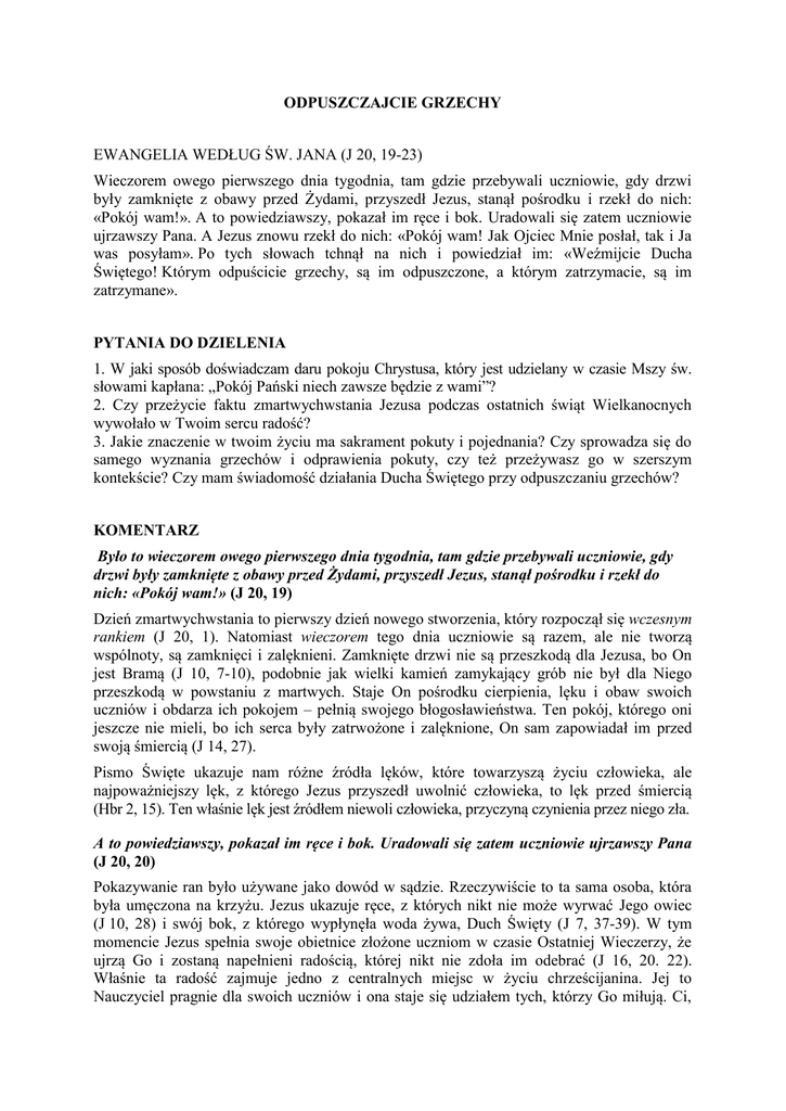 ODPUSZCZAJCIE GRZECHY EWANGELIA WEDŁUG ŚW. JANA (J 20, 19-23) Wieczorem owego pierwszego dnia tygodnia, tam gdzie przebywali uczniowie, gdy drzwi były zamknięte z obawy przed Żydami, przyszedł Jezus, stanął pośrodku i rzekł do nich: «Pokój wam!». A to powiedziawszy, pokazał im ręce i bok. Uradowali się zatem uczniowie ujrzawszy Pana. A Jezus znowu rzekł do nich: «Pokój wam! Jak Ojciec Mnie posłał, tak i Ja was posyłam». Po tych słowach tchnął na nich i powiedział im: «Weźmijcie Ducha Świętego! Którym odpuścicie grzechy, są im odpuszczone, a którym zatrzymacie, są im zatrzymane». PYTANIA DO DZIELENIA 1. W jaki sposób doświadczam daru pokoju Chrystusa, który jest udzielany w czasie Mszy św. słowami kapłana: „Pokój Pański niech zawsze będzie z wami”? 2. Czy przeżycie faktu zmartwychwstania Jezusa podczas ostatnich świąt Wielkanocnych wywołało w Twoim sercu radość? 3. Jakie znaczenie w twoim życiu ma sakrament pokuty i pojednania? Czy sprowadza się do samego wyznania grzechów i odprawienia pokuty, czy też przeżywasz go w szerszym kontekście? Czy mam świadomość działania Ducha Świętego przy odpuszczaniu grzechów? KOMENTARZ Było to wieczorem owego pierwszego dnia tygodnia, tam gdzie przebywali uczniowie, gdy drzwi były zamknięte z obawy przed Żydami, przyszedł Jezus, stanął pośrodku i rzekł do nich: «Pokój wam!» (J 20, 19) Dzień zmartwychwstania to pierwszy dzień nowego stworzenia, który rozpoczął się wczesnym rankiem (J 20, 1). Natomiast wieczorem tego dnia uczniowie są razem, ale nie tworzą wspólnoty, są zamknięci i zalęknieni. Zamknięte drzwi nie są przeszkodą dla Jezusa, bo On jest Bramą (J 10, 7-10), podobnie jak wielki kamień zamykający grób nie był dla Niego przeszkodą w powstaniu z martwych. Staje On pośrodku cierpienia, lęku i obaw swoich uczniów i obdarza ich pokojem – pełnią swojego błogosławieństwa. Ten pokój, którego oni jeszcze nie mieli, bo ich serca były zatrwożone i zalęknione, On sam zapowiadał im przed swoją śmiercią (J 14, 27). Pismo Święte ukazuje nam różne źródła lęków, które towarzyszą życiu człowieka, ale najpoważniejszy lęk, z którego Jezus przyszedł uwolnić człowieka, to lęk przed śmiercią (Hbr 2, 15). Ten właśnie lęk jest źródłem niewoli człowieka, przyczyną czynienia przez niego zła. A to powiedziawszy, pokazał im ręce i bok. Uradowali się zatem uczniowie ujrzawszy Pana (J 20, 20) Pokazywanie ran było używane jako dowód w sądzie. Rzeczywiście to ta sama osoba, która była umęczona na krzyżu. Jezus ukazuje ręce, z których nikt nie może wyrwać Jego owiec (J 10, 28) i swój bok, z którego wypłynęła woda żywa, Duch Święty (J 7, 37-39). W tym momencie Jezus spełnia swoje obietnice złożone uczniom w czasie Ostatniej Wieczerzy, że ujrzą Go i zostaną napełnieni radością, której nikt nie zdoła im odebrać (J 16, 20. 22). Właśnie ta radość zajmuje jedno z centralnych miejsc w życiu chrześcijanina. Jej to Nauczyciel pragnie dla swoich uczniów i ona staje się udziałem tych, którzy Go miłują. Ci, którzy smucili się ze śmierci Zbawiciela, doświadczą tej prawdziwej radości (J 16, 19-21). Można wyrazić to także w inny sposób: kto z miłości do Pana potrafi płakać nad grzechami swoimi i świata, ten zostanie napełniony prawdziwą radością. A Jezus znowu rzekł do nich: «Pokój wam! Jak Ojciec Mnie posłał, tak i Ja was posyłam» (J 20, 21) W tradycji Izraela prorocy wyznaczali swoich następców, aby oni kontynuowali ich misję. Jezus powierza kontynuowanie swojej misji Apostołom. W tym posłaniu realizuje się zapowiedź z Ostatniej Wieczerzy: Zaprawdę, zaprawdę, powiadam wam: Sługa nie jest większy od swego pana ani wysłannik od tego, który go posłał. (…) Zaprawdę, zaprawdę, powiadam wam: Kto przyjmuje tego, którego Ja poślę, Mnie przyjmuje. A kto Mnie przyjmuje, przyjmuje Tego, który Mnie posłał» (J 13, 16. 20); Jak Ty Mnie posłałeś na świat, tak i Ja ich na świat posłałem (J 17, 18). Dopiero w tym momencie dokonuje się rzeczywiste posłanie uczniów, aby głosili Ewangelię i odpuszczali grzechy. Bowiem dopiero doświadczenie zmartwychwstania i dar Ducha Świętego uzdalniają do bycia świadkiem Zbawiciela (Dz 1, 4). Powtórzenie zwrotu Pokój wam! ukazuje jak wielką wagę do tego właśnie daru przywiązywał Chrystus i Jego uczniowie. Dopiero teraz, po zmartwychwstaniu Jezusa, serca uczniów mogą przestać się lękać i zostają napełnione pokojem. Rodzi się on z doświadczenia bycia miłowanym przez Boga i z pewności, że pomimo ucisków Jezus zwyciężył grzech, śmierć, pokusy i zło tego świata. Pokój Pański jest owocem odpuszczenia grzechów oraz objawia obecność Boga. Jest także darem Bożym niesionym i przekazywanym przez Apostołów. Powinien więc być przedmiotem zabiegania wierzących. Po tych słowach tchnął na nich i powiedział im: Weźmijcie Ducha Świętego! Którym odpuścicie grzechy, są im odpuszczone, a którym zatrzymacie, są im zatrzymane (J 20, 22-23) Czasownik tchnął tylko jeden raz występuje w NT, natomiast w ST pojawia się w następujących miejscach: Wtedy to Pan Bóg ulepił człowieka z prochu ziemi i tchnął w jego nozdrza tchnienie życia, wskutek czego stał się człowiek istotą żywą (Rdz 2, 7); Powiedział On do mnie: «Prorokuj do ducha, prorokuj, o synu człowieczy, i mów do ducha: Tak powiada Pan Bóg: Z czterech wiatrów przybądź, duchu, i powiej (tchnij) po tych pobitych, aby ożyli» (Ez 37, 9). Tchnienie Jezusa ożywia uczniów, jest tchnieniem życia. Do tego momentu byli jakby umarli, bez życia. To tchnienie ożywiające jest przekazaniem Ducha Świętego, który przychodzi jako owoc wywyższenia Jezusa. W ciągu swojego życia objawiał On Ojca, który kocha i przebacza grzechy. Teraz tę misję mają podjąć Jego uczniowie. Jest to najważniejsza misja, bowiem 