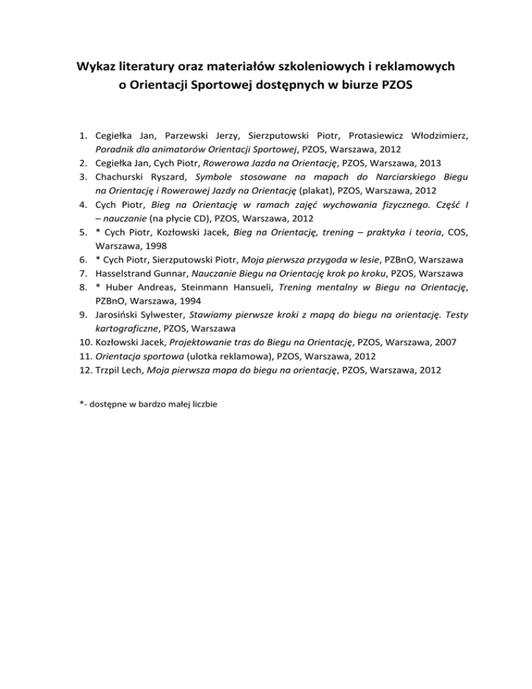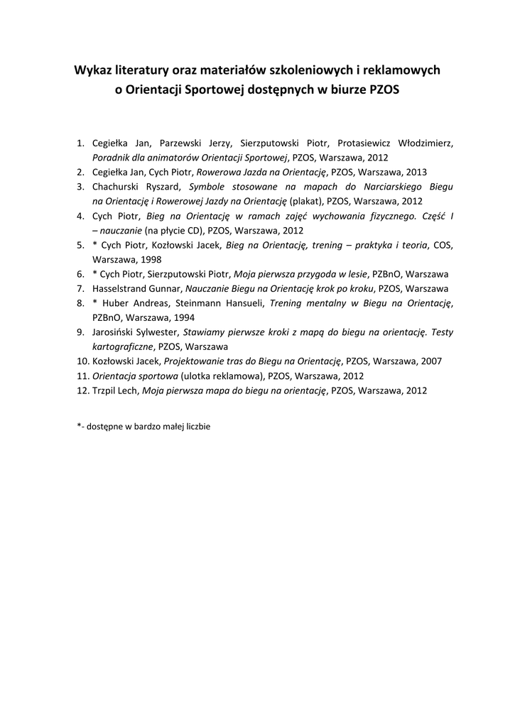 Wykaz literatury oraz materiałów szkoleniowych i reklamowych o Orientacji Sportowej dostępnych w biurze PZOS 1. Cegiełka Jan, Parzewski Jerzy, Sierzputowski Piotr, Protasiewicz Włodzimierz, Poradnik dla animatorów Orientacji Sportowej, PZOS, Warszawa, 2012 2. Cegiełka Jan, Cych Piotr, Rowerowa Jazda na Orientację, PZOS, Warszawa, 2013 3. Chachurski Ryszard, Symbole stosowane na mapach do Narciarskiego Biegu na Orientację i Rowerowej Jazdy na Orientację (plakat), PZOS, Warszawa, 2012 4. Cych Piotr, Bieg na Orientację w ramach zajęć wychowania fizycznego. Część I – nauczanie (na płycie CD), PZOS, Warszawa, 2012 5. * Cych Piotr, Kozłowski Jacek, Bieg na Orientację, trening – praktyka i teoria, COS, Warszawa, 1998 6. * Cych Piotr, Sierzputowski Piotr, Moja pierwsza przygoda w lesie, PZBnO, Warszawa 7. Hasselstrand Gunnar, Nauczanie Biegu na Orientację krok po kroku, PZOS, Warszawa 8. * Huber Andreas, Steinmann Hansueli, Trening mentalny w Biegu na Orientację, PZBnO, Warszawa, 1994 9. Jarosiński Sylwester, Stawiamy pierwsze kroki z mapą do biegu na orientację. Testy kartograficzne, PZOS, Warszawa 10. Kozłowski Jacek, Projektowanie tras do Biegu na Orientację, PZOS, Warszawa, 2007 11. Orientacja sportowa (ulotka reklamowa), PZOS, Warszawa, 2012 12. Trzpil Lech, Moja pierwsza mapa do biegu na orientację, PZOS, Warszawa, 2012 *- dostępne w bardzo małej liczbie