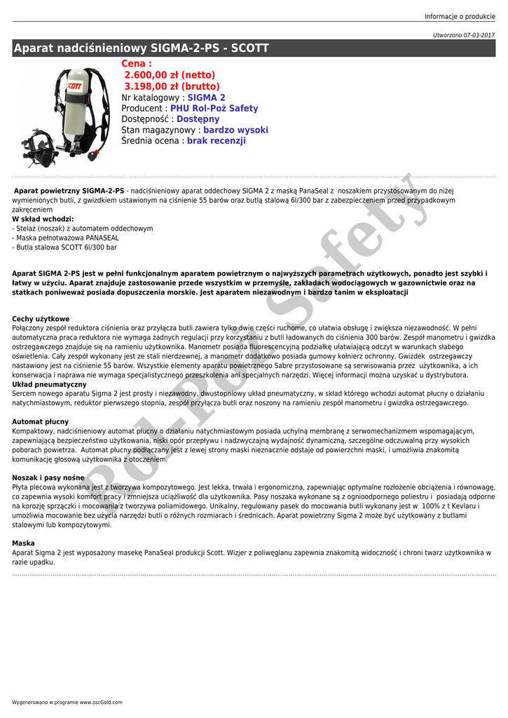 Informacje o produkcie Utworzono 07-03-2017 Aparat nadciśnieniowy SIGMA-2-PS - SCOTT Cena : 2.600,00 zł (netto) 3.198,00 zł (brutto) Nr katalogowy : SIGMA 2 Producent : PHU Rol-Poż Safety Dostępność : Dostępny Stan magazynowy : bardzo wysoki Średnia ocena : brak recenzji fe ty Aparat powietrzny SIGMA-2-PS - nadciśnieniowy aparat oddechowy SIGMA 2 z maską PanaSeal z noszakiem przystosowanym do niżej wymienionych butli, z gwizdkiem ustawionym na ciśnienie 55 barów oraz butlą stalową 6l/300 bar z zabezpieczeniem przed przypadkowym zakręceniem W skład wchodzi: - Stelaż (noszak) z automatem oddechowym - Maska pełnotważowa PANASEAL - Butla stalowa SCOTT 6l/300 bar Sa Aparat SIGMA 2-PS jest w pełni funkcjonalnym aparatem powietrznym o najwyższych parametrach użytkowych, ponadto jest szybki i łatwy w użyciu. Aparat znajduje zastosowanie przede wszystkim w przemyśle, zakładach wodociągowych w gazownictwie oraz na statkach poniweważ posiada dopuszczenia morskie. Jest aparatem niezawodnym i bardzo tanim w eksploatacji -P oż Cechy użytkowe Połączony zespół reduktora ciśnienia oraz przyłącza butli zawiera tylko dwie części ruchome, co ułatwia obsługę i zwiększa niezawodność. W pełni automatyczna praca reduktora nie wymaga żadnych regulacji przy korzystaniu z butli ładowanych do ciśnienia 300 barów. Zespół manometru i gwizdka ostrzegawczego znajduje się na ramieniu użytkownika. Manometr posiada fluorescencyjną podziałkę ułatwiającą odczyt w warunkach słabego oświetlenia. Cały zespół wykonany jest ze stali nierdzewnej, a manometr dodatkowo posiada gumowy kołnierz ochronny. Gwizdek ostrzegawczy nastawiony jest na ciśnienie 55 barów. Wszystkie elementy aparatu powietrznego Sabre przystosowane są serwisowania przez użytkownika, a ich konserwacja i naprawa nie wymaga specjalistycznego przeszkolenia ani specjalnych narzędzi. Więcej informacji można uzyskać u dystrybutora. Układ pneumatyczny Sercem nowego aparatu Sigma 2 jest prosty i niezawodny, dwustopniowy układ pneumatyczny, w skład którego wchodzi automat płucny o działaniu natychmiastowym, reduktor pierwszego stopnia, zespół przyłącza butli oraz noszony na ramieniu zespół manometru i gwizdka ostrzegawczego. ol Automat płucny Kompaktowy, nadciśnieniowy automat płucny o działaniu natychmiastowym posiada uchylną membranę z serwomechanizmem wspomagającym, zapewniającą bezpieczeństwo użytkowania, niski opór przepływu i nadzwyczajną wydajność dynamiczną, szczególne odczuwalną przy wysokich poborach powietrza. Automat płucny podłączany jest z lewej strony maski nieznacznie odstaje od powierzchni maski, i umożliwia znakomitą komunikację głosową użytkownika z otoczeniem. R Noszak i pasy nośne Płyta plecowa wykonana jest z tworzywa kompozytowego. Jest lekka, trwała i ergonomiczna, zapewniając optymalne rozłożenie obciążenia i równowagę, co zapewnia wysoki komfort pracy i zmniejsza uciążliwość dla użytkownika. Pasy noszaka wykonane są z ognioodpornego poliestru i posiadają odporne na korozję sprzączki i mocowania z tworzywa poliamidowego. Unikalny, regulowany pasek do mocowania butli wykonany jest w 100% z t Kevlaru i umożliwia mocowanie bez użycia narzędzi butli o różnych rozmiarach i średnicach. Aparat powietrzny Sigma 2 może być użytkowany z butlami stalowymi lub kompozytowymi. Maska Aparat Sigma 2 jest wyposażony masekę PanaSeal produkcji Scott. Wizjer z poliwęglanu zapewnia znakomitą widoczność i chroni twarz użytkownika w razie upadku. Wygenerowano w programie www.oscGold.com