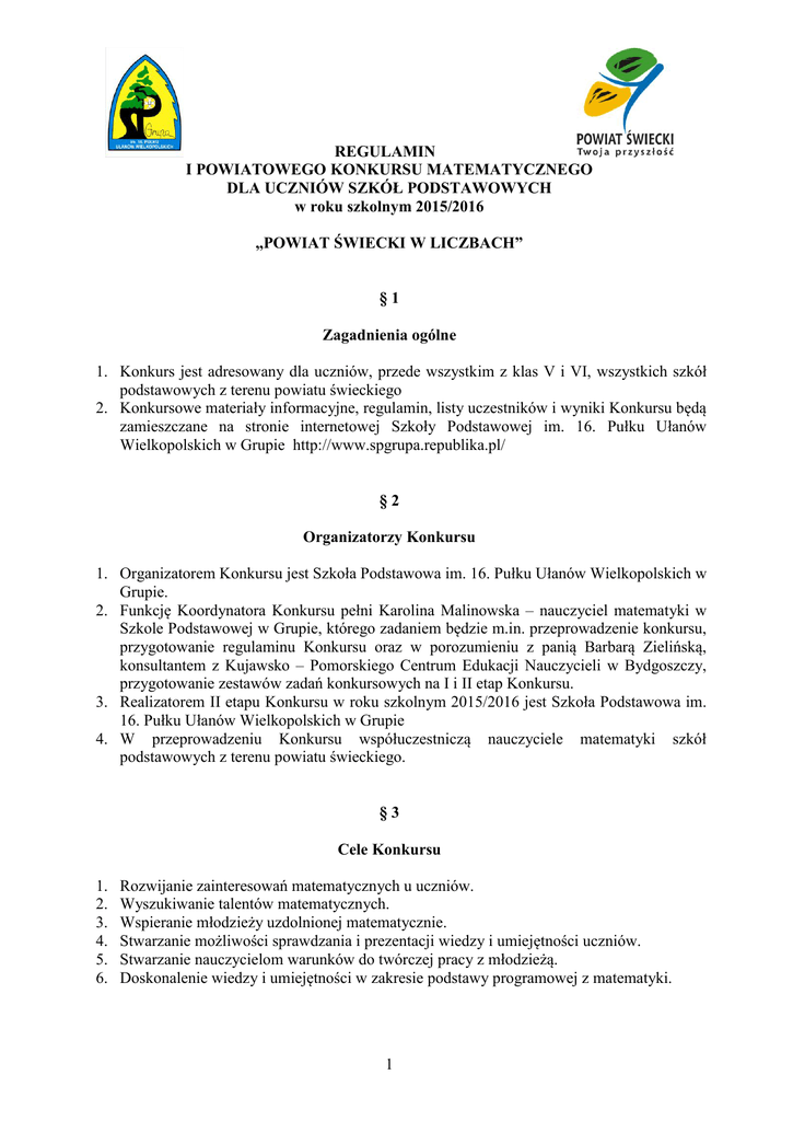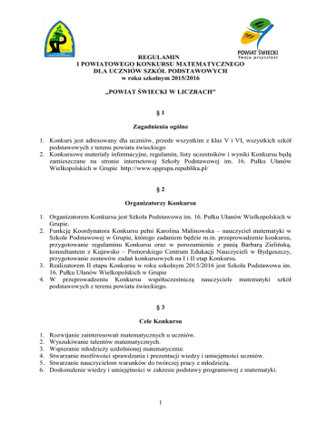 REGULAMIN I POWIATOWEGO KONKURSU MATEMATYCZNEGO DLA UCZNIÓW SZKÓŁ PODSTAWOWYCH w roku szkolnym 2015/2016 „POWIAT ŚWIECKI W LICZBACH” §1 Zagadnienia ogólne 1. Konkurs jest adresowany dla uczniów, przede wszystkim z klas V i VI, wszystkich szkół podstawowych z terenu powiatu świeckiego 2. Konkursowe materiały informacyjne, regulamin, listy uczestników i wyniki Konkursu będą zamieszczane na stronie internetowej Szkoły Podstawowej im. 16. Pułku Ułanów Wielkopolskich w Grupie http://www.spgrupa.republika.pl/ §2 Organizatorzy Konkursu 1. Organizatorem Konkursu jest Szkoła Podstawowa im. 16. Pułku Ułanów Wielkopolskich w Grupie. 2. Funkcję Koordynatora Konkursu pełni Karolina Malinowska – nauczyciel matematyki w Szkole Podstawowej w Grupie, którego zadaniem będzie m.in. przeprowadzenie konkursu, przygotowanie regulaminu Konkursu oraz w porozumieniu z panią Barbarą Zielińską, konsultantem z Kujawsko – Pomorskiego Centrum Edukacji Nauczycieli w Bydgoszczy, przygotowanie zestawów zadań konkursowych na I i II etap Konkursu. 3. Realizatorem II etapu Konkursu w roku szkolnym 2015/2016 jest Szkoła Podstawowa im. 16. Pułku Ułanów Wielkopolskich w Grupie 4. W przeprowadzeniu Konkursu współuczestniczą nauczyciele matematyki szkół podstawowych z terenu powiatu świeckiego. §3 Cele Konkursu 1. 2. 3. 4. 5. 6. Rozwijanie zainteresowań matematycznych u uczniów. Wyszukiwanie talentów matematycznych. Wspieranie młodzieży uzdolnionej matematycznie. Stwarzanie możliwości sprawdzania i prezentacji wiedzy i umiejętności uczniów. Stwarzanie nauczycielom warunków do twórczej pracy z młodzieżą. Doskonalenie wiedzy i umiejętności w zakresie podstawy programowej z matematyki. 1 §4 Etapy Konkursu 1. Konkurs przebiega dwuetapowo: a) I etap - przeprowadzany przez Szkolne Komisje Konkursowe odbędzie się 12 kwietnia 2016 r. o godz. 9.00, jednocześnie we wszystkich szkołach; czas trwania konkursu 60 minut, b) II etap - finał, przeprowadzany przez Powiatową Komisję Konkursową odbędzie się 17 maja 2016 r. o godz. 10.00 w Szkole Podstawowej im. 16. Pułku Ułanów Wielkopolskich w Grupie ul. Szkolna 2, 86-134 Grupa, czas trwania konkursu 60 minut. W czasie trwania obu etapów uczniowie nie mogą korzystać z kalkulatora. Mogą korzystać tylko z opieczętowanego brudnopisu. §5 Komisja konkursowa, jej zadania i tryb powoływania 1. Powiatowa Komisja Konkursowa składa się z przewodniczącego Komisji i członków. Przewodniczącym Komisji jest jeden nauczyciel spośród wszystkich przybyłych na Konkurs pozostali wchodzą w skład jako członkowie komisji. Przewodniczącym zostaje osoba wybrana przez Koordynatora konkursu. 2. Do zadań Powiatowej Komisji Konkursowej należy: a) sprawdzenie rozwiązań zadań uczestników II etapu Konkursu, b) rozpatrywanie odwołań od wyników Konkursu, c) ustalenie listy laureatów. 3. Szkolna Komisja Konkursowa składa się z dwóch nauczycieli - opiekunów konkursu powołanych przez Dyrektora danej szkoły oraz Przewodniczącego – Dyrektor lub Wicedyrektor szkoły. 4. Do zadań Szkolnej Komisji Konkursowej należy: a) zabezpieczenie zestawu zadań do dnia Konkursu, b) sprawdzenie rozwiązań zadań zgodnie ze schematem punktowania, c) powiadomienie uczestników I etapu Konkursu o uzyskanej liczbie punktów w ciągu trzech dni, d) przechowywanie prac uczestników I etapu Konkursu do końca roku szkolnego, e) sporządzenie protokołu z listą wszystkich uczestników i liczbą uzyskanych punktów, f) przekazanie protokołu do dnia 22 kwietnia 2016 r. do realizatora II etapu Konkursu osobiście lub listownie na adres Szkoła Podstawowa im. 16. Pułku Ułanów Wielkopolskich, ul. Szkolna 2, 86-134 Grupa z dopiskiem Konkurs „Powiat świecki w liczbach”. §6 Zgłoszenia do Konkursu 1. 2. Koordynator Konkursu przekazuje informacje o Konkursie do szkół podstawowych z powiatu świeckiego listownie do 31.12.2015r. Szkoła do 28.02.2016 r. zgłasza się do Konkursu, przesyłając „Zgłoszenie uczestnictwa” (karta w załączeniu) do realizatora II etapu Konkursu listownie na adres: Szkoła Podstawowa im. 16. Pułku Ułanów Wielkopolskich, ul. Szkolna 2, 86-134 Grupa z dopiskiem Konkurs „Powiat świecki w liczbach”. 2 3. 4. Przyjmuje się, że każda szkoła zgłoszona do Konkursu otrzymuje zestaw zadań na I etap Konkursu. Szkoła, która nie organizuje Konkursu ma obowiązek poinformowania uczniów o możliwości wzięcia udziału w Konkursie organizowanym przez inną szkołę. §7 Kryteria kwalifikowania uczestników do II etapu Konkursu i ogłaszanie wyników 1. Udział uczniów w etapie szkolnym jest dobrowolny i powinien wynikać z decyzji ucznia. 2. Do II etapu Konkursu Szkolna Komisja Konkursowa kwalifikuje dwóch uczniów, którzy uzyskali najlepszy wynik w I etapie Konkursu. W przypadku, gdyby w I etapie dwa najwyższe wyniki uzyskało więcej niż dwoje uczniów, wówczas ci uczniowie otrzymują dodatkowe zadanie do rozwiązania i dopiero wtedy Szkolna Komisja Konkursowa rozstrzyga, którzy uczniowie kwalifikują się do II etapu. §8 Zakres wiedzy i umiejętności na poszczególne etapy Konkursu 1. Na pierwszy i drugi etap: a) Liczby naturalne: liczby naturalne w dziesiątkowym układzie pozycyjnym, porównywanie liczb naturalnych; znaki <, =, >; dodawanie, odejmowanie, mnożenie i dzielenie liczb naturalnych, kwadraty i sześciany liczb naturalnych; reguły dotyczące kolejności wykonywania działań; dzielenie z resztą liczb naturalnych; podzielność liczb naturalnych; liczby pierwsze i złożone; cechy podzielności przez 2, 3, 5, 9, 10, 100; porównywanie różnicowe i ilorazowe liczb naturalnych; rozwiązywanie zadań tekstowych prowadzących do obliczeń na liczbach naturalnych; zapis liczb w systemie rzymskim. b) Liczby całkowite: liczby całkowite ujemne; liczby całkowite na osi liczbowej; porównywanie liczb całkowitych; działania na liczbach całkowitych; rozwiązywanie zadań tekst