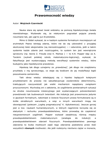 Prawomocność wiedzy Autor: Wojciech Czarniecki Nauka stara się opisać świat widzialny za pomocą hipotetycznego świata niewidzialnego. Wydawało się, że relatywizm pogrzebał pojęcie prawdy rozumiane tak, jak ujął to już Arystoteles. Mimo iż Gödel wykazał, że w każdym systemie formalnym mocniejszym od arytmetyki Peana istnieją zdania, które nie da się udowodnić z przyjętej skończonej ilości aksjomatów (są nierozstrzygalne) — i odwrotnie, jeśli w takim systemie każde zdanie jest rozstrzygalne, to system ten jest wewnętrznie sprzeczny (np. teoria Z. Freuda oraz K. Marksa ) — to K.R. Popper idąc za A. Tarskim (wykwit polskiej szkoły matematyczno-logicznej), wykazał, że falsyfikacja jest wystarczającą metodą weryfikacji systemów wiedzy, które budujemy jako hipotetycznie prawdziwe. Hipotezę tak długo uznajemy za „prawdziwą”, jak długo nie znajdziemy przykładu z nią sprzecznego, co staje się bodźcem do jej modyfikacji bądź poszukiwania zamiennika. Taki obraz wiedzy przybliżeniami do traktujących składającej prawdy rzeczywistość nie jak się z hipotez satysfakcjonuje wielki będących zwolenników mechanizm kolejnymi determinizmu, napędzany związkami przyczynowymi. Wychodzą oni z założenia, że uogólnienie powtarzalnych sytuacji na drodze rozumowania indukcyjnego jest wystarczającym potwierdzeniem prawdziwości tak budowanych twierdzeń. Ale indukcja jest prawomocna jedynie w językach formalnych, natomiast w świecie fizycznym prawa formułowane są w ściśle określonych warunkach, a więc w innych warunkach mogą nie obowiązywać (polecam „Logikę pragmatyczną” K. Ajdukiewicza). Jeszcze gorzej jest w tzw. naukach humanistycznych, w których nagminnie korzysta się ze statystyki i rachunku prawdopodobieństwa, które prowadzą do częstokroć nieuprawnionych uogólnień. prawdopodobieństwem prawdopodobieństwem Popper wykazał matematycznym zdarzeń fizycznych. zasadniczą (analogia do różnicę między indukcji) Prawdopodobieństwo a pewnego zdarzenia to liczba możliwych zajść tego zdarzenia podzielona przez ilość wszystkich równych możliwości. Ale jeśli rozłożymy nierówno ciężar w monecie, to prawdopodobieństwo uzyskania orła nie będzie wynosić ½ tylko albo 0<p<1/2 albo 1/2<p<1 w zależności od tego, która strona jest bardziej obciążona. A więc prawdopodobieństwo realnych zdarzeń obejmuje nieznane czynniki powodujące odchylenia od prawdopodobieństwa matematycznego i te nieznane, ujawniające się w trakcie „dziania się”, nazwał Popper skłonnością. Dlatego możemy oceniać, iż w pewnych warunkach prawdopodobieństwo wystąpienia A jest większe niż wystąpienie B. Jak podkreśla Popper, te skłonności nie zawierają się w jakimś przedmiocie (pewna zbieżność z istotą wartości) lecz w sytuacji, w jakiej się on znalazł. Ale sytuacja zmienia możliwości a tym samym i skłonności np.: wynalezienie nowego lekarstwa zmienia sytuację na rynku lekarstw a więc i szanse (prawdopodobieństwo) wyleczenia konkretnego pacjenta. Wsparciem dla koncepcji Poppera okazały się badania nad chaosem — rozpoczęte przez Lorenza rozważaniami na cyklicznością pogody. Jak wiemy, do dziś, mimo potężnych mocy obliczeniowych, rozsianych po całym globie gęstej sieci przyrządów, nie udaje się przewidzieć trafnie pogodę na więcej niż trzy dni. Zachowanie układów autonomicznych ze sprzężeniem zwrotnym można modelować prostym cyklicznym odwzorowaniem x → kx(1-x) tj. wynik działania wchodzi jako dana wejściowa następnego cyklu (można je badać w zwykłym arkuszu kalkulacyjnym). Dla wartości 0< k<3 otrzymujemy stany zbieżne do punktu zwanego atraktorem. Gdy k=3 układ jest na krawędzi stabilności i dla k>3 dane zaczynają być rozbieżne, pojawia się chaos, przy czym pojawią się też niewielkie ciągi regularnego ruchu (tak jak w prognozach pogody). To oznacza, że cykliczne, nieliniowe procesy gospodarcze mają ograniczoną przewidywalność. By nie być gołosłownym, przeanalizuję konsekwencję warunku, który wyprowadziłem w artykule http://mises.pl/blog/2011/11/26/czarniecki- determinanty-wymiany/ na opłacalność inwestycji w urządzenie k (produkowane z wydajnością ak ) w cenie ck i o zdolności produkcji l jednostek dobra ai w całym okresie eksploatacji: aio ci ai ci ai2 ck lak gdzie: ci ai — koszt pracy koniecznej do wyprodukowania jednostki i, przy cenie pracy c i i wydajności ck lak — koszt amortyzacji wyposażenia k przypadający na jednostkę i, Powyższe wyrażenie możemy zapisać, oznaczając K=lak/ck , w postaci: ci ai(1- ai/Kci) > ci aio Ale jest to wydajność w jednostce czasu, która w zależności od wymaganej wielkości produkcji, będzie zwielokrotniona przez ilość t pracujących robotników1. ci ai(1- ai/Kci)t = ai+1 > ci aiot Jeśli zbadamy jakie wartości otrzymamy w wyniku kolejnych inwestycji (wystarczy do tego arkusz kalkulacyjny), to okaże się, że jest to specyficzna forma odwzorowania logistycznego. I rzeczywiście, gdy podstawimy dodatkowo: N = ai/Kci, otrzymamy równanie logistyczne Nicit(1-N) = Ni+1 Wartość pracy ci włożonej w produkt musi być większa lub co najmniej równa wartości samej pracy, czyli (1), poza tym ciągi kolejnych wartości tego wyrażenia, jak przystało na odwzorowanie logistyczne, zależą głównie od zmienności cit; przy czym chaos pojawia się wraz z wartościami ujemnymi po przekroczeniu liczby cit=4. Ze wzrostem kosztów amortyzacji K, rosną też kolejne wartości wyrażenia, bowiem świadczy to o rosnących wartościach nakładów inwestycyjnych. Pojawiają się jeszcze inne efekty nie występujące w odwzorowaniu logistycznym, ale pominę je gdyż prowadzą do bardziej obszernych rozważań. Dodatkowo obraz inwestowania komplikuje się gdy zauważymy, że zmiany wydajności w podprocesach nie są prostą ich sumą. Jeśli t3 = t2 +t1 a1a2/(a1+a2), dlatego jest sumą czasów tr