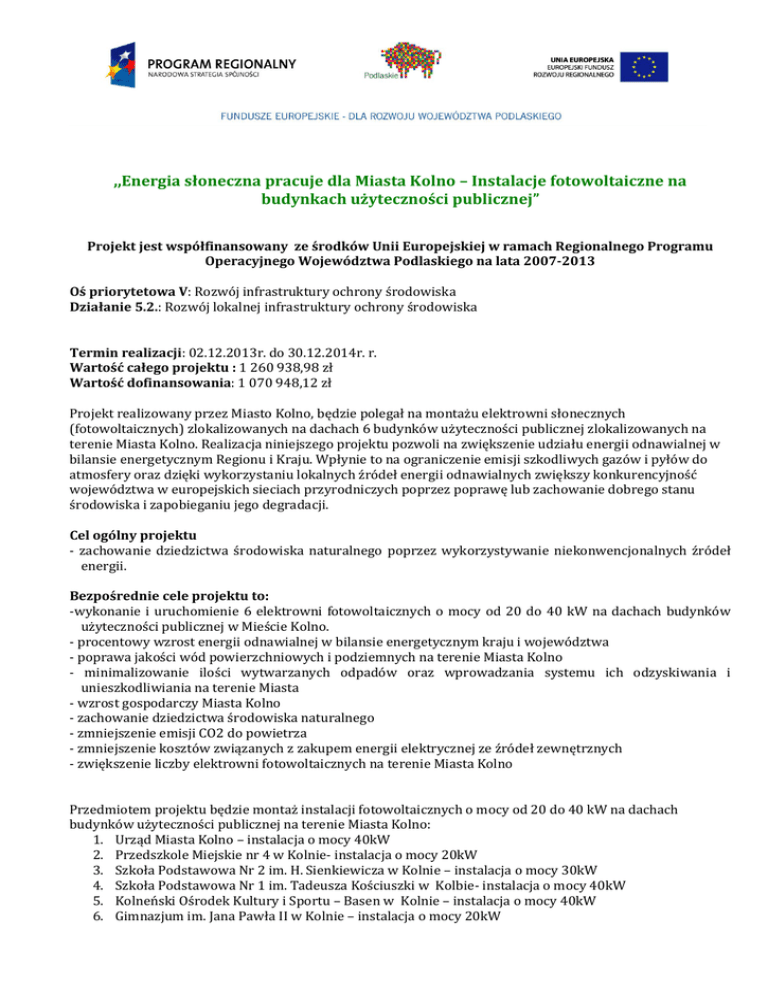 ,,Energia słoneczna pracuje dla Miasta Kolno – Instalacje fotowoltaiczne na budynkach użyteczności publicznej” Projekt jest współfinansowany ze środków Unii Europejskiej w ramach Regionalnego Programu Operacyjnego Województwa Podlaskiego na lata 2007-2013 Oś priorytetowa V: Rozwój infrastruktury ochrony środowiska Działanie 5.2.: Rozwój lokalnej infrastruktury ochrony środowiska Termin realizacji: 02.12.2013r. do 30.12.2014r. r. Wartość całego projektu : 1 260 938,98 zł Wartość dofinansowania: 1 070 948,12 zł Projekt realizowany przez Miasto Kolno, będzie polegał na montażu elektrowni słonecznych (fotowoltaicznych) zlokalizowanych na dachach 6 budynków użyteczności publicznej zlokalizowanych na terenie Miasta Kolno. Realizacja niniejszego projektu pozwoli na zwiększenie udziału energii odnawialnej w bilansie energetycznym Regionu i Kraju. Wpłynie to na ograniczenie emisji szkodliwych gazów i pyłów do atmosfery oraz dzięki wykorzystaniu lokalnych źródeł energii odnawialnych zwiększy konkurencyjność województwa w europejskich sieciach przyrodniczych poprzez poprawę lub zachowanie dobrego stanu środowiska i zapobieganiu jego degradacji. Cel ogólny projektu - zachowanie dziedzictwa środowiska naturalnego poprzez wykorzystywanie niekonwencjonalnych źródeł energii. Bezpośrednie cele projektu to: -wykonanie i uruchomienie 6 elektrowni fotowoltaicznych o mocy od 20 do 40 kW na dachach budynków użyteczności publicznej w Mieście Kolno. - procentowy wzrost energii odnawialnej w bilansie energetycznym kraju i województwa - poprawa jakości wód powierzchniowych i podziemnych na terenie Miasta Kolno - minimalizowanie ilości wytwarzanych odpadów oraz wprowadzania systemu ich odzyskiwania i unieszkodliwiania na terenie Miasta - wzrost gospodarczy Miasta Kolno - zachowanie dziedzictwa środowiska naturalnego - zmniejszenie emisji CO2 do powietrza - zmniejszenie kosztów związanych z zakupem energii elektrycznej ze źródeł zewnętrznych - zwiększenie liczby elektrowni fotowoltaicznych na terenie Miasta Kolno Przedmiotem projektu będzie montaż instalacji fotowoltaicznych o mocy od 20 do 40 kW na dachach budynków użyteczności publicznej na terenie Miasta Kolno: 1. Urząd Miasta Kolno – instalacja o mocy 40kW 2. Przedszkole Miejskie nr 4 w Kolnie- instalacja o mocy 20kW 3. Szkoła Podstawowa Nr 2 im. H. Sienkiewicza w Kolnie – instalacja o mocy 30kW 4. Szkoła Podstawowa Nr 1 im. Tadeusza Kościuszki w Kolbie- instalacja o mocy 40kW 5. Kolneński Ośrodek Kultury i Sportu – Basen w Kolnie – instalacja o mocy 40kW 6. Gimnazjum im. Jana Pawła II w Kolnie – instalacja o mocy 20kW W ramach projektu zostały określone wskaźniki produktu i rezultatu. Wskaźniki produktu: 1. W ramach projektu zainstalowanych zostanie 760szt. Wolnostojących polikrystalicznych paneli fotowoltaicznych (modułów) 2. W ramach projektu planuje się realizację elektrowni fotowoltaicznej o łącznej mocy zainstalowanej 190kW 3. Całkowita liczba wybudowanych obiektów infrastruktury służącej do przesyłu energii odnawialnej – 6szt. Wskaźnik rezultatu: 1. W ramach projektu planuje się realizację elektrowni fotowoltaicznej o łącznej mocy zainstalowanej 190kW 2. W ramach projektu planuje się oszczędność energii elektrycznej na poziomie 168 571 kWh/rok Bieżący harmonogram realizacji projektu: 12.06.2014r. – podpisanie umowy o dofinansowanie 01.09.2014r. – planowane rozpoczęcie rzeczowe inwestycji