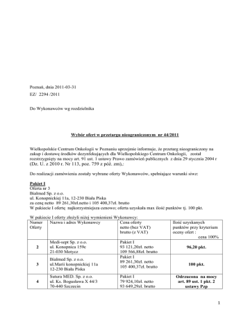 Poznań, dnia 2011-03-31 EZ/ 2294 /2011 Do Wykonawców wg rozdzielnika Wybór ofert w przetargu nieograniczonym nr 44/2011 Wielkopolskie Centrum Onkologii w Poznaniu uprzejmie informuje, że przetarg nieograniczony na zakup i dostawę środków dezynfekujących dla Wielkopolskiego Centrum Onkologii, został rozstrzygnięty na mocy art. 91 ust. 1 ustawy Prawo zamówień publicznych z dnia 29 stycznia 2004 r (Dz. U. z 2010 r. Nr 113, poz. 759 z póź. zm),: Do realizacji zamówienia zostały wybrane oferty Wykonawców, spełniające warunki siwz: Pakiet I Oferta nr 3 Bialmed Sp. z o.o. ul. Konopnickiej 11a, 12-230 Biała Piska za cenę netto 89 261,30zł.netto i 105 400,37zł. brutto W pakiecie I ofertę najkorzystniejsza cenowo; oferta uzyskała max ilość punktów tj. 100 pkt. W pakiecie I oferty złożyli niżej wymienieni Wykonawcy: Numer Nazwa i adres Wykonawcy Cena oferty Oferty netto (bez VAT) brutto (z VAT) 2 Medi-sept Sp. z o.o. ul. Konopnica 159c 21-030 Motycz 3 Bialmed Sp. z o.o. ul.Marii konopnickiej 11a 12-230 Biała Piska 4 Sutura MED. Sp. z o.o. ul. Ks. Bogusława X 44/3 70-440 Szczecin Pakiet I 93 121,20zł. netto 109 566,88zł. brutto Pakiet I 89 261,30zł. netto 105 400,37zł. brutto Pakiet I 79 924,10zł. netto 93 649,29zł. brutto Ilość uzyskanych punktów przy kryterium oceny ofert : cena 100% 96,20 pkt. 100 pkt. Odrzucona na mocy art. 89 ust. 1 pkt. 2 ustawy Pzp 1 W pakiecie I oferta 4 Sutura Med. podlega odrzuceniu z mocy art. 89 ust. 1 pkt. 2 ustawy Pzp - jej treść nie odpowiada treści specyfikacji istotnych warunków zamówienia. Uzasadnienie: produkt zaoferowany w pozycji 3. nie odpowiada zapisom specyfikacji. Nie zawiera w składzie substancji natłuszczających (pochodnych kolagenu i glikolu), nie ma zapisu, że może być stosowany do mycia ciała w profilaktyce odleżyn. Pakiet II Oferta nr 2 Medi-Sept Sp. z o.o. ul. Konopnica 159c, 21-030 Motycz za cenę 81 425,00zł. netto i 90 462,23. brutto W pakiecie II złożono jedna ofertę niepodlegająca odrzuceniu; oferta uzyskała max ilość punktów tj. 100 pkt. Pakiet III Oferta nr 2 Medi-Sept Sp. z o.o. ul. Konopnica 159c, 21-030 Motycz za cenę netto 113 549,94zł.netto i 122 641,52zł. brutto W pakiecie III złożono jedna ofertę niepodlegająca odrzuceniu; oferta uzyskała max ilość punktów tj. 100 pkt. W pakiecie III oferty złożyli niżej wymienieni Wykonawcy: Numer Nazwa i adres Wykonawcy Cena oferty Oferty netto (bez VAT) brutto (z VAT) 2 Medi-sept Sp. z o.o. ul. Konopnica 159c 21-030 Motycz 3 Bialmed Sp. z o.o. ul.Marii konopnickiej 11a 12-230 Biała Piska Ilość uzyskanych punktów przy kryterium oceny ofert : cena 100% Pakiet III 113 549,94zł. netto 122 641,52zł. brutto Pakiet III 119 210,15zl. netto 128 754,68zł. brutto 100 pkt. Odrzucona na mocy art. 89 ust. 1 pkt. 2 ustawy Pzp W pakiecie III oferta 3 Bialmed. podlega odrzuceniu z mocy art. 89 ust. 1 pkt. 2 ustawy Pzp - jej treść nie odpowiada treści specyfikacji istotnych warunków zamówienia. Uzasadnienie: produkty zaoferowane w pozycji 6. i 8. nie odpowiadają zapisom specyfikacji. Pozycja 6.: niezgodność w czasach działania i w składzie MRSA 30 sek MRSA 1 min (z obciążeniami) Proponowany produkt Incidin Liquid Spray 5 min 5 min B 30 sek 1 min Tbc 30 sek Tbc 1 min (z obciążeniami) F 30 sek 5 min 5 min 1 min Adeno 30 sek 5 min Rota 30 sek 1 min Zapis w SIWZ czas działania 2 skład nie zawierający dodatkowych substancji czynnych poza alkoholem zawiera poza alkoholem amfoteryczne związki powierzchniowo czynne zawierający w swoim składzie mniej niż 50% alkoholi w 100g produkt zawiera 60g alkoholi (35g 2-propanol i 25g 1-propanol) Pozycja 8.: niezgodność w czasach działania i w składzie B 1 min Proponowany produkt Aniosyme DDSH 5 min F 1 min 15 min V 1 min nie zawierający alkoholu 5 min zawiera w składzie n-propanol, etoksylowany alkohol laurylowy Zapis w SIWZ czas działania skład Pakiet IV Oferta nr 1 Naturan Sp. z o.o. ul. Rydygiera 8, 01-793 Warszawa za cenę 7 680,00zł. netto i 8 294,40zł. brutto W pakiecie Iv złożono jedna ofertę niepodlegająca odrzuceniu; oferta uzyskała max ilość punktów tj. 100 pkt. Wykonawcom, których oferty zostały odrzucone przysługują środki ochrony prawnej wynikające z art. 179 i następnych ustawy z 29 stycznia 2004r Prawo zamówień publicznych (tekst jednolity Dz.U z 2007r Nr 223, poz. 1655 z poźn. zmianami). Dziękujemy za udział w postępowaniu o zamówienie publiczne. Wykonawców, których oferty zostały wybrane w poszczególnych pakietach, prosimy o przygotowanie umów wg wzoru załączonego do niniejszego pisma. Umowa dostępna jest również w formie elektronicznej – prośbę proszę wysłać na adres [email protected]. W związku z tym na mocy art. 94 ust. 1 pkt.2 ustawy Prawo zamówień publicznych wyznacza się termin podpisania umowy na dzień 06.04.2011r Z poważaniem Z-ca Dyrektora ds. ekonomiczno-eksploatacyjnych inż. Małgorzata Kołodziej-Sarna 3 Korzystając z uprawnień wynikających z art. 27 ust. 2 w związku z art. 94 ust. 1 pkt.2 ustawy Pzp prosimy o potwierdzenie otrzymania niniejszego pisma dotyczącego sprawy 44/2011 na nr faxu 61/ 88 50 698 Data…………………… Pieczątka i podpis………………………………… 4