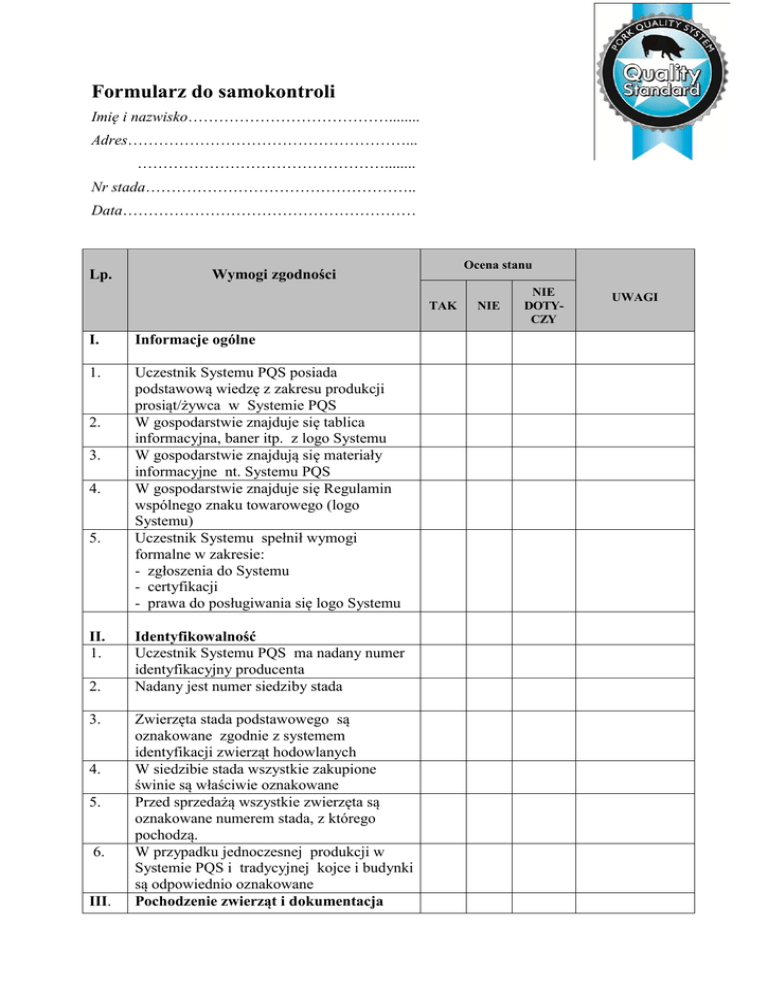 Formularz do samokontroli Imię i nazwisko…………………………………........ Adres………………………………………………... …………………………………………........ Nr stada…………………………………………….. Data………………………………………………… Lp. Ocena stanu Wymogi zgodności TAK I. Informacje ogólne 1. Uczestnik Systemu PQS posiada podstawową wiedzę z zakresu produkcji prosiąt/żywca w Systemie PQS W gospodarstwie znajduje się tablica informacyjna, baner itp. z logo Systemu W gospodarstwie znajdują się materiały informacyjne nt. Systemu PQS W gospodarstwie znajduje się Regulamin wspólnego znaku towarowego (logo Systemu) Uczestnik Systemu spełnił wymogi formalne w zakresie: - zgłoszenia do Systemu - certyfikacji - prawa do posługiwania się logo Systemu 2. 3. 4. 5. II. 1. 2. 3. 4. 5. 6. III. Identyfikowalność Uczestnik Systemu PQS ma nadany numer identyfikacyjny producenta Nadany jest numer siedziby stada Zwierzęta stada podstawowego są oznakowane zgodnie z systemem identyfikacji zwierząt hodowlanych W siedzibie stada wszystkie zakupione świnie są właściwie oznakowane Przed sprzedażą wszystkie zwierzęta są oznakowane numerem stada, z którego pochodzą. W przypadku jednoczesnej produkcji w Systemie PQS i tradycyjnej kojce i budynki są odpowiednio oznakowane Pochodzenie zwierząt i dokumentacja NIE NIE DOTYCZY UWAGI 2 1. 2. 3. 4. 5. IV. 1. 3. 4. 5 6. V. 1. 2. 3. 4. Do produkcji prosiąt/tuczników wykorzystywane są dopuszczalne dla Systemu PQS rasy świń W gospodarstwie stosowany jest prawidłowy podział na komponenty mateczne i ojcowskie Zwierzęta stada podstawowego posiadają dokumenty hodowlane W przypadku stosowania inseminacji w gospodarstwie są dostępne zaświadczenia sztucznego unasienniania loch/loszek W gospodarstwie znajdują się dokumenty potwierdzające genotyp wrażliwości na stres (RYR1) dla stada podstawowego Żywienie W gospodarstwie znajduje się dokumentacja potwierdzająca rodzaj i pochodzenie pasz stosowanych w żywieniu zwierząt (receptura, etykieta) W gospodarstwie jest prowadzona dokumentacja dotycząca produkcji pasz (receptura) W gospodarstwie znajdują się zapisy dawek pokarmowych stosowanych w żywieniu prosiąt/tuczników W gospodarstwie jest prowadzona dokumentacja potwierdzająca zmianę żywienia tuczników na miesiąc przed sprzedażą Oświadczenie o niestosowaniu/ ograniczeniu udziału pasz niedozwolonych w Systemie PQS Obrót przedubojowy - gospodarstwo Średnia masa ciała tuczników przeznaczonych do uboju jest zgodna z zaleceniami Systemu PQS W gospodarstwie prowadzony jest prawidłowo obrót przedubojowy w zakresie przygotowania zwierząt do transportu minimalizacji/eliminacji czynników stresogennych W przypadku jednoczesnej sprzedaży zwierząt objętych Systemem PQS i spoza Systemu, warunki transportu uniemożliwiają mieszanie się obu grup W gospodarstwie przestrzegane są wymogi w zakresie obowiązującego prawa (dokumentacja do wglądu podczas kontroli i certyfikacji)